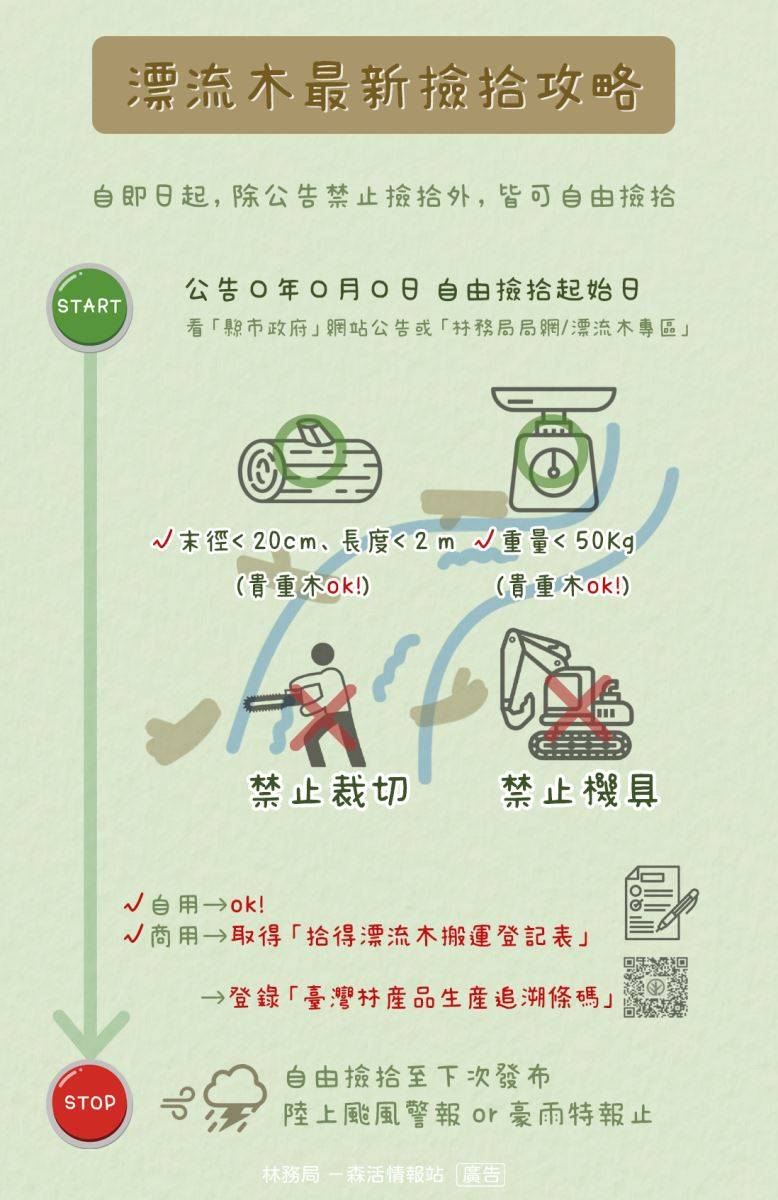中度颱風杜蘇芮持續增強朝台灣附近海域逼近,24日晚間8時30分中央氣象局已發布海上颱風警報,並於25日下午2時30分發布陸上颱風警報,警戒區域包括屏東及恆春半島,不排除增為強烈颱風,預測將沿台灣西南沿海北上,為民眾自身安全,自即日起請勿撿拾漂流木,並請等待各地方政府重新公告開放自由撿拾。 農委會於109年修訂漂流木自由撿拾規定,「自指定日至交通部中央氣象局發布下次陸上颱風警報或豪雨特報發布」前,皆可自由撿拾與開放一定規格以下的貴重木撿拾,漂流木不論是否為貴重木,只要未經裁切,單支規格符合末徑小於20公分且長度2公尺以下,或單支重量在50公斤以下,無政府註記或烙印標記者,在開放撿拾後,民眾均可自由徒手撿拾。 民眾撿拾漂流木後,若可能再行加工轉售,或因撿拾量體龐大需動用車輛進行載運時,拾得人應攜帶身分證件到臨時林產物檢查站或洽當地林區管理處工作站辦理登記,貴重木採逐支登記,非貴重木採整批重量登記,以領取官方登記文件,取得漂流木合法產權證明;若民眾撿拾漂流木僅作為自行使用之薪材或蒐藏品,則可直接攜回,無須登記。 屏東林區管理處呼籲,杜蘇芮陸上颱風警報已發布,自即日起不得撿拾漂流木,並待地方政府重新公告後,才開放撿拾,民眾若對撿拾漂流木有興趣,請注意各縣市政府公告自由撿拾的期間、對象及可撿拾的範圍,別在公告自由撿拾漂流木前撿拾,以免觸法。