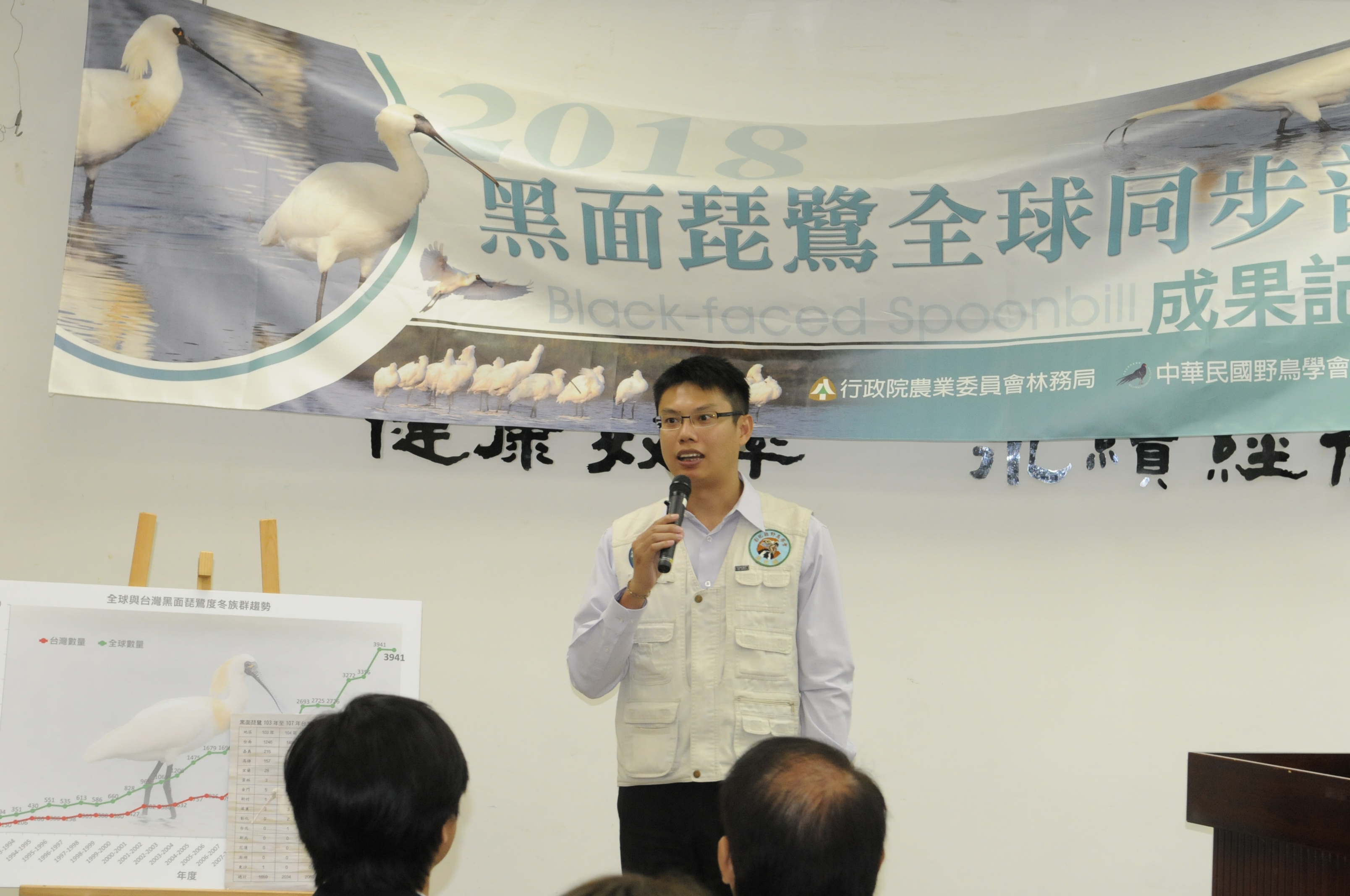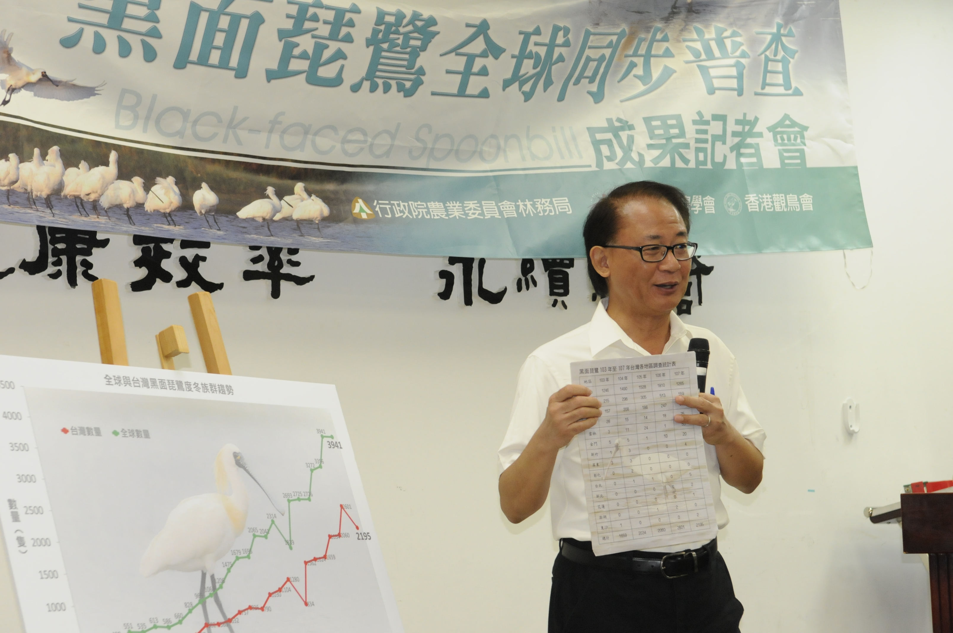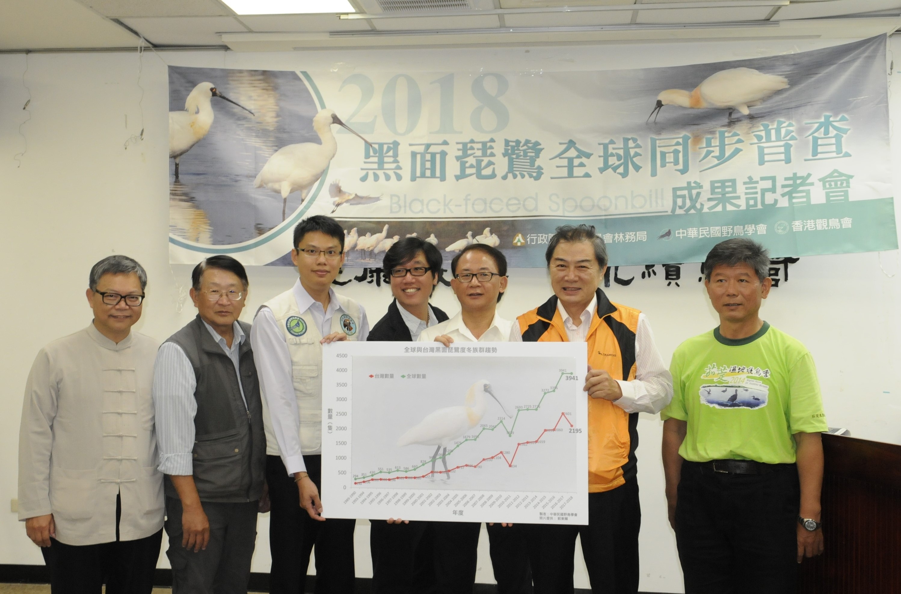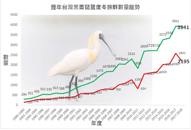 2018年「黑面琵鷺全球普查」已於1月20日及21日進行調查。臺灣普查工作,由行政院農業委員會林務局委託中華民國野鳥學會辦理,透過全國各地鳥會、團體的共同努力,在全臺各地51個樣區與全球同步進行調查,總共紀錄到2,195隻黑面琵鷺,全球普查總數則與去(2017)年同為3,941隻。臺灣黑面琵鷺約占全球族群56%,是全球黑面琵鷺度冬族群最多的地區。