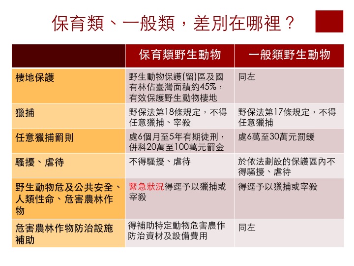 國內依據文化資產保存法、野生動物保育法、森林法及國家公園法等相關法規劃設的各類保護區及國有林事業區,計佔全國國土面積45%;這些區域均為維護自然生態及動植物棲地之重要環境,棲息於區域內的野生動物,即使並非保育類也受到同樣程度的保護,非經申請及許可,不得獵捕野生動植物。林務局也舉例,本次檢討也將龜殼花、眼鏡蛇、雨傘節等三種毒蛇由保育類調整為一般類,原因也是由研究爬蟲類的學者所組成的專家群,依據其棲地現況與族群趨勢的評估結果,絕不會因為牠們是毒蛇,可能危害人畜,所以調降為一般類。