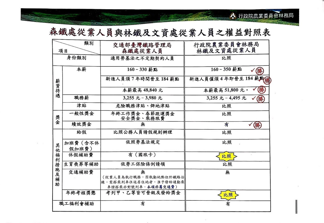 針對阿里山林業鐵路及文化資產管理處(以下簡稱林鐵處)部分同仁以企業工會名義,由新北市產業總工會發送新聞稿指稱林鐵去(107)年7月由林務局收回後福利縮水,組織隨時可能被裁撤,工作朝不保夕等陳述,明顯悖離事實,令人遺憾;甚至,還有不明人士刻意將前嘉義林管處鐵路課人員草擬、未經簽核且無效的績效獎金「初稿」提供給媒體,指稱「林鐵處績效獎金制度將由處本部及其他文職人員收取70%作為個人績效獎金」,意圖挑撥勞資關係,完全是無中生有。 林務局表示,該局局長林華慶於107年 6 月 27 日林鐵移轉前夕,曾親自到嘉義召開說明會,與當時尚屬台鐵森鐵處的基層員工面對面溝通,說明組織移轉後,原有的年資與法定待遇福利,林務局全部承接,部分項目甚至優於臺鐵,亦符合行政院解決低薪方案;林華慶當時也承諾,林鐵經營移轉後希望大家努力做得更好,如果績效卓著,108年會向農委會爭取提高起薪。該次說明會全程公開,除了有多位地方記者在場並報導外,出席員工亦全程錄影,過程可受公評。林務局歡迎工會公布當時所錄影音,比對現行條件,即可釐清爭議。 員工待遇縮水?林鐵處薪資優於台鐵局 林務局指出,阿里山林業鐵路於102年起由臺鐵局設立的臨時編組「阿里山森鐵處」協助營運,107年行政院核定於林務局下設阿里山林業鐵路及文化資產管理處,並於7月1日成立,林鐵業務與人員由台鐵移回林務局經營管理。由於臺鐵局屬事業機構,林務局屬公務機關,兩者薪資結構福利制度不同,為使原森鐵處人員移撥後,其薪酬待遇不致降低,林務局特別參照原森鐵處的「阿里山森林鐵路管理處人員管理要點」,薪資待遇、獎金、所有法定福利措施及補助如年終獎金、考核獎金、春節疏運獎金、安全獎金、乘務旅費、危險職務津貼、僻地津貼等發放全數比照臺鐵,甚至有部分項目再調整為優於臺鐵,例如將新進人員晉級至184薪點所需時間,從7年縮短為4年;移撥至林鐵文資處的從業人員,本薪最高從原本的48,840元提高到51,800元,另職務薪最高則從3,980元調高到4,495元,同時也追認過去各時期於阿里山鐵路服務之年資。 林鐵處人員移撥因為完全移植原本臺鐵協助營運時期的薪給制度,因此最基層員工本薪加職務薪與森鐵處時期一樣,為26,935元起跳,每月可再支領1,200元之危險津貼,合計為28,135元;加計年終工作獎金及考核獎金,若考績為乙等,平均每月薪資為31,424元,若考績為甲等,則為32,546元,皆符合行政院解決低薪方案,薪資高於每月3萬元。目前林鐵處之從業人員平均薪資為35,961元,如果加計年終和考核獎金,平均每月總薪資為43,452元。整體而言,人員薪資待遇實已優於臺鐵局營運時期。 林務局重申,該局深刻體認第一線員工的辛勞,雖政府體制內薪資結構有其限制,若林鐵營運績效卓著,將與農委會研議適度提高最基層員工之本薪。 阿里山林業鐵路及文化資產管理處是政府正式單位 林業鐵路及文化資產管理處為奉行政院核定設置之正式機構,編制表除經行政院農業委員會於107年6月5日發布,並於108年4月1日經考試院核備,成為林務局下轄之8個林區管理處及農航所之後的第10個林務局附屬機關(構),絕非部分工會成員指陳之「非常態性組織」,當然更沒有隨時會被裁撤的可能。 林鐵處已與勞方密切溝通 林鐵處於107年7月1日成立後,為儘速釐清勞工權益相關事項,由勞方推舉6名代表與資方進行2次勞資會議,至企業工會於107年9月25日核准登記後,又再與工會共同召開3次相關會議,合計5次,會議由林鐵處副處長與工會理事長及秘書與勞方代表共同主持,其主持層級與林務局各林管處勞資會議相同;工會成立後2次勞資會議均請工會指派代表出席,且工會理事長亦參與最近2次會議(2/19、3/19),「以勞資會議架空工會」一說完全不符事實。林鐵處指出,該處於彈性工時等事項皆依法遵循勞資會議協商結果辦理,如工會對協商次數或層級有所訴求,溝通大門也隨時敞開。 沒有喪葬補助、子女教育補助、三節獎金和退休互助金?薪資提撥福利金多寡的差異 林務局重申,法定福利項目一概比照臺鐵,惟上述這些臺鐵局福利事項,屬臺鐵局職工福利會的互助補助,並非臺鐵局的法定薪資待遇。不同機關之福利互助事項,本來就會因福利金提撥多寡而有所差異,林鐵處員工目前已加入本局職工福利會,相關福利措施自然比照本局同仁。 建立營運績效獎勵制度 林務局將參考過去數年的營運表現,預計於今(108)年度針對基層從業人員制訂營運績效獎勵制度,以鼓勵員工持續加強安全管理、改善營運績效,並進一步強化創新行銷與服務等作為,讓國寶級的阿里山林業鐵路成為享譽國際的文化地標。 林務局表示,林鐵處規劃以深度人文旅遊及自然環境保育為特色,串聯阿里山及嘉義市區,發展為大嘉義地區生態旅遊軸帶,全面發揮各方資源效益。這個任務並不容易,需要林務局大家庭裡的每一個成員緊密合作;如同林務局在森林護管員並無抗爭情況下,亦主動為護管員爭取提高待遇。該局再次呼籲:林務局完全兌現移撥前所承諾的事項,現在沒有、將來也不會讓員工待遇縮水;員工有權爭取更好的權益,但應基於事實理性溝通,勿以假消息混淆視聽。