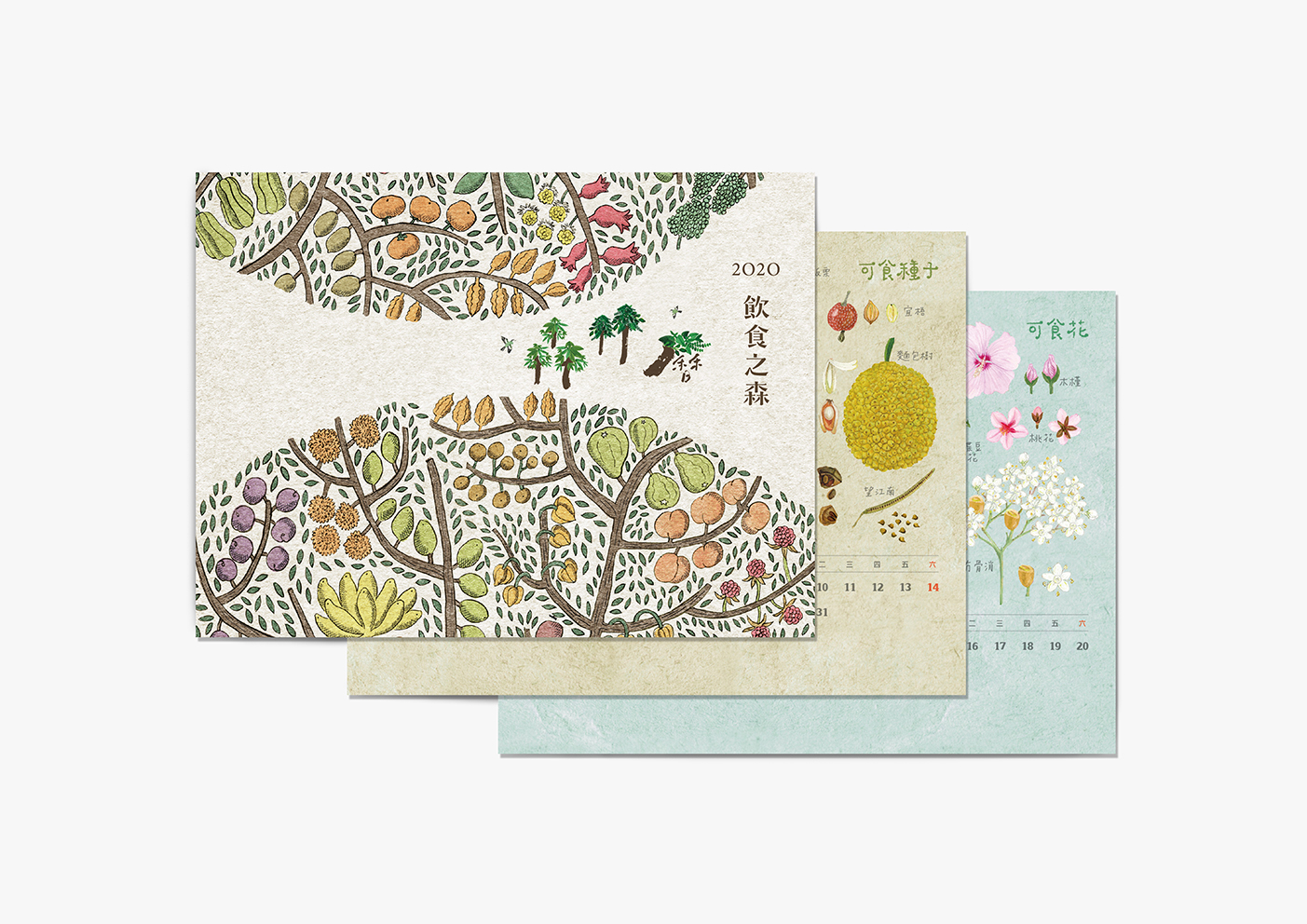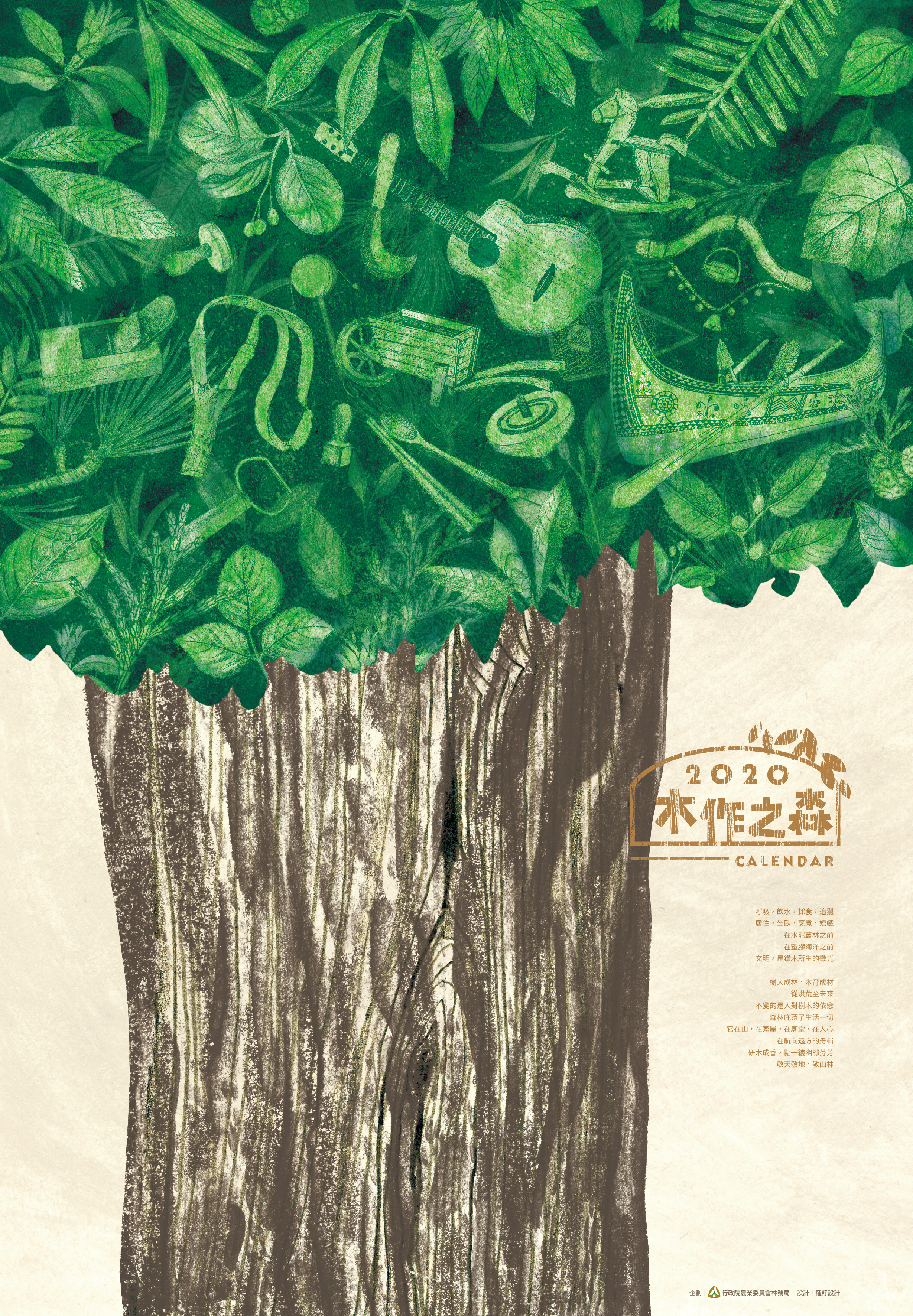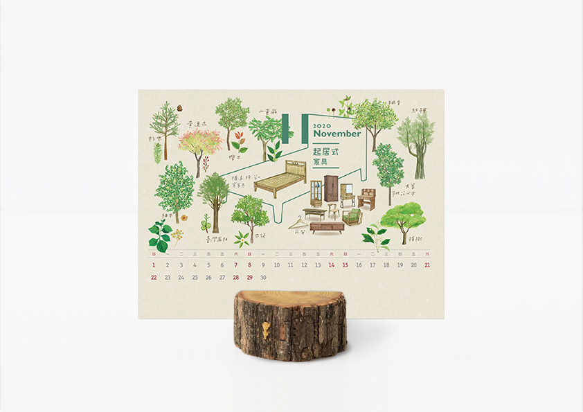 林務局自2018年起推出手繪風格系列月曆,該年企劃製作的「飲食之森」曆,以和煦繽紛的色彩呈現森林生態系中各種可食植物,看見森林如何點亮人類飲食文化;2019年「里山動物」曆,配合國土生態綠網計畫推動,以Q版風格展現臺灣原生動物的多樣美麗,提升大眾對伴生於里山環境的野生動物與棲地的關注。2020年則延續「飲食之森」的概念,以「木作之森」為主題,持續宣導臺灣森林生態系的多元服務價值,每月份選取最能代表臺灣常民文化的木作器物,以及用於製作這些器物的各個樹種與它們的花、果實及種子,溫潤呈現臺灣森林與你我的在地生活連結;除了科普傳統木作知識,更回顧先民就地取材、永續利用森林資源的傳統智慧。