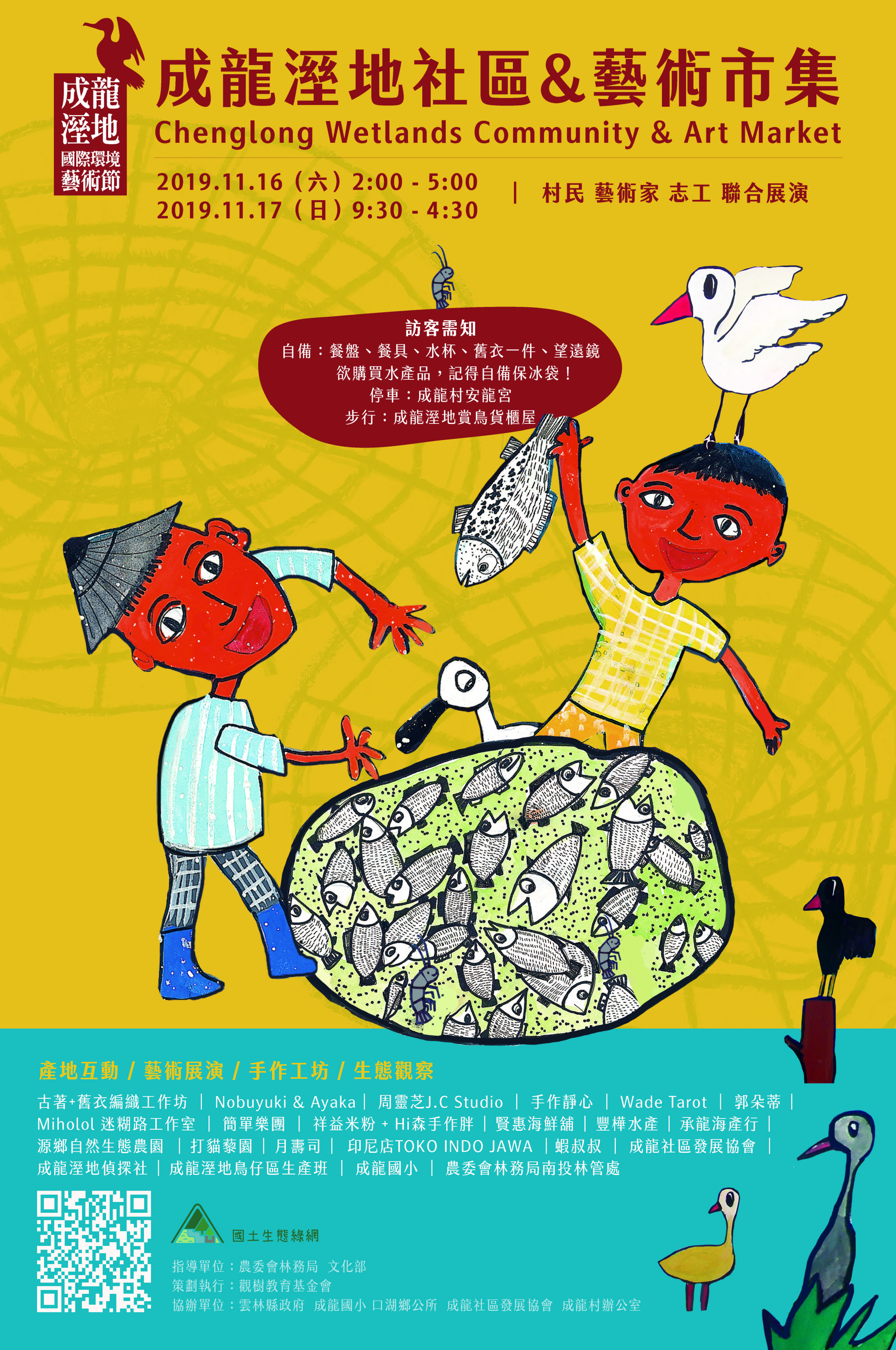 首屆成龍溼地社區藝術市集將在本周末11月16日、17日於雲林縣口湖鄉的成龍溼地盛大登場!今年的成龍溼地國際藝術節轉換形式,改由藝術家技術指導,協助村民變身素人藝術家,利用生活周邊的材料來發展社區的文創產品,從在地角度,展現豐富的文化生命力。今年「藝術季」同時正逢「候鳥季」及農漁產品的「豐收季」,讓來訪的民眾全方位體驗成龍村的生活、生產及生態,非常適合揪團或獨自來場深度小旅行,把握機會和生產者、藝術家、村裡大小朋友交流,看見臺灣漁村最文藝也最草根的自然人文風情。