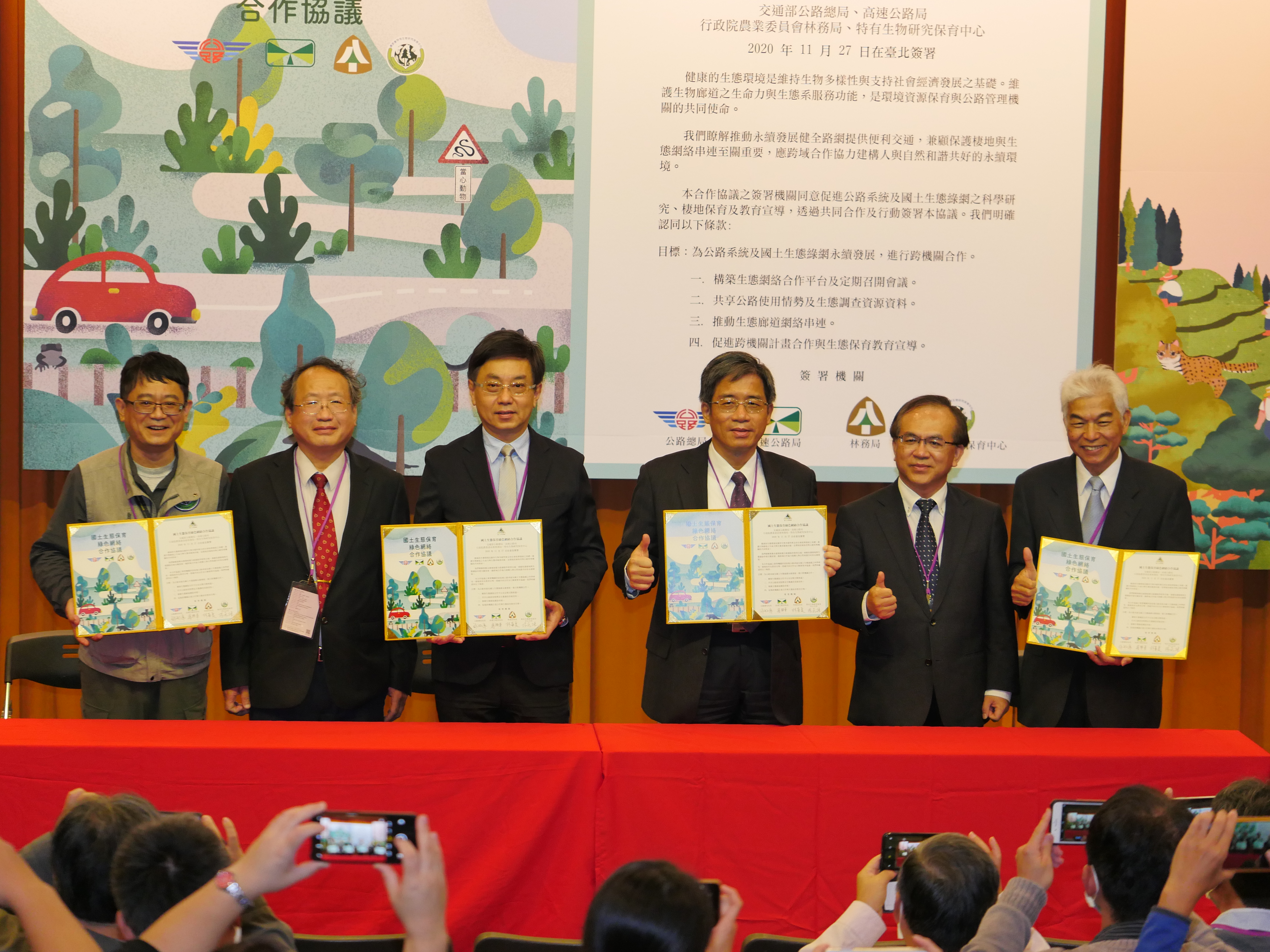 林務局自106年起推動「國土生態保育綠色網絡建置計畫」,協調跨部會、機關共同縫補臺灣野生動物棲地,維護生物多樣性,因此也藉此場合,於11月27日上午與交通部公路總局、高速公路局、特有生物研究保育中心簽署合作協議,跨域合作共同推動永續發展安全動物路網,兼顧保護棲地與生態網絡串連,協力建構人與自然和諧共好的永續環境。