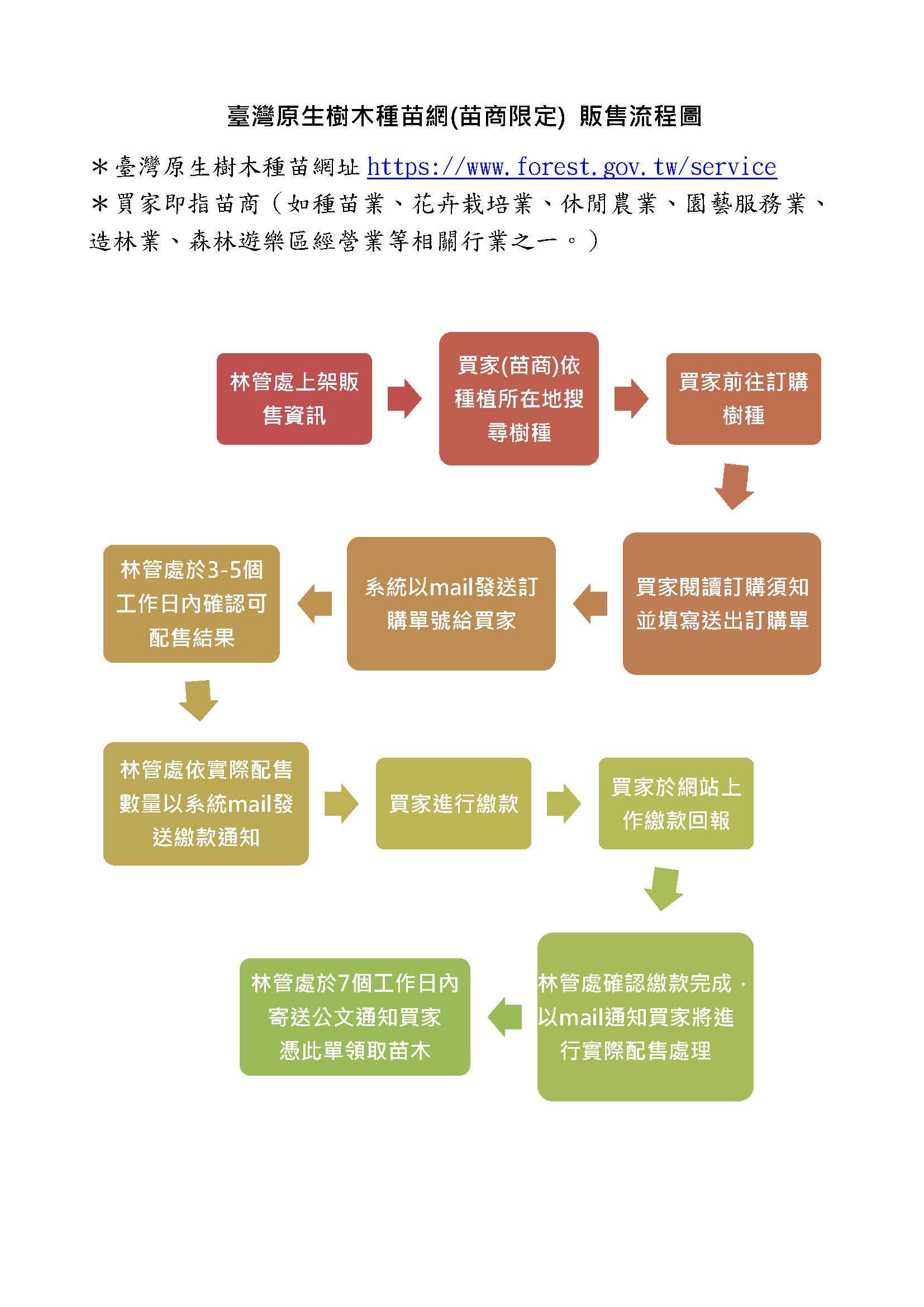 林務局自去(109)年12月首次推出「臺灣原生樹木種苗」販售網頁,開賣即獲得育苗業商支持及響應,第二波販售在大家引頸期盼下,由林務局全臺8個林管處培育完成,再次上架45種苗木約1.8萬株小苗,本次上架的新品計22種,將來更會陸續新增品項,即日起在林務局全球資訊網「為您服務」(https://www.forest.gov.tw/service)開賣,數量有限,歡迎業商選購,多加栽培推廣,讓消費者在家也能擁有綺麗多姿的臺灣原生植物花園。 林務局秉持推廣臺灣在地原生植物,持續發掘轄區特定原生植物,從鎖定目標樹種後,觀察記錄物候基礎資料,並摘取健康飽滿的種實,帶回苗圃進行發芽培育,培育期長達1-3年不等。每一種苗木均有明確種原生產地點,因數量有限,故以成本價販售推廣,希望透過育苗業商,將所購苗木接續擴大繁殖,配合政府推廣原生植物政策,逐步媒合苗木供應端及工程、社區學校綠化等需求端,以建構原生植物產業鏈。 如果您是育苗業商(屬種苗業、花卉栽培業、休閒農業、園藝服務業、造林業、森林遊樂區經營業等相關行業之一)欲超前部署,可由林務局全球資訊網/為您服務(https://www.forest.gov.tw/service)尋找「臺灣原生樹木種苗網」圖示進入訂購 (詳如販售流程圖)。 林務局已累計販售種類多達91種,本次所販售新的樹種有22種,如春賞亮葉、夏觀白苞、秋看紅果紅葉,四季各有特色的四照花;七夕開花的艷紅鹿子百合;臺灣原生茶屬植物、紅花金蕊極有特色的鳳凰山茶;秋季綻放串串白花、清香淡雅的刺葉桂櫻……各色深具園藝觀賞價值的原生樹種,值得培育推廣。網頁所列苗木種類及數量,將採滾動式不定期更新,如苗圃有新培育苗木,待貨源充足,即上網更新販售,請記得有空就來逛逛,先買先擁有,藉由您的巧手,將臺灣美麗的特色植物發揚光大,與政府機關攜手努力,為大家的庭園增添具有臺灣風味的多樣化森活美學。
