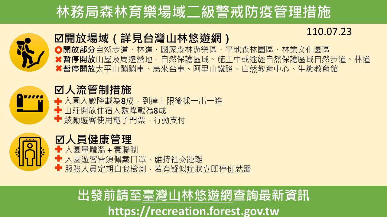 配合中央流行疫情指揮中心宣布7月27日起調整COVID-19疫情二級強化警戒,林務局將於7月27日起開放部分自然步道、林道、17處國家森林遊樂區、3處平地森林園區、4處林業文化園區;但軌道設施(阿里山林業鐵路、太平山蹦蹦車與烏來台車)、山屋營地、通舖型住宿設施,自然教育中心、生態教育館、自然保護區域(包含自然保護/留區與野生動物保護區)、道路中斷、施工中或途經自然保護區域的自然步道、林道,以及經地方政府依據傳染病防治法相關規定公告管制措施之場域,仍暫不開放,詳細場域開放情形請至台灣山林悠遊網查詢。