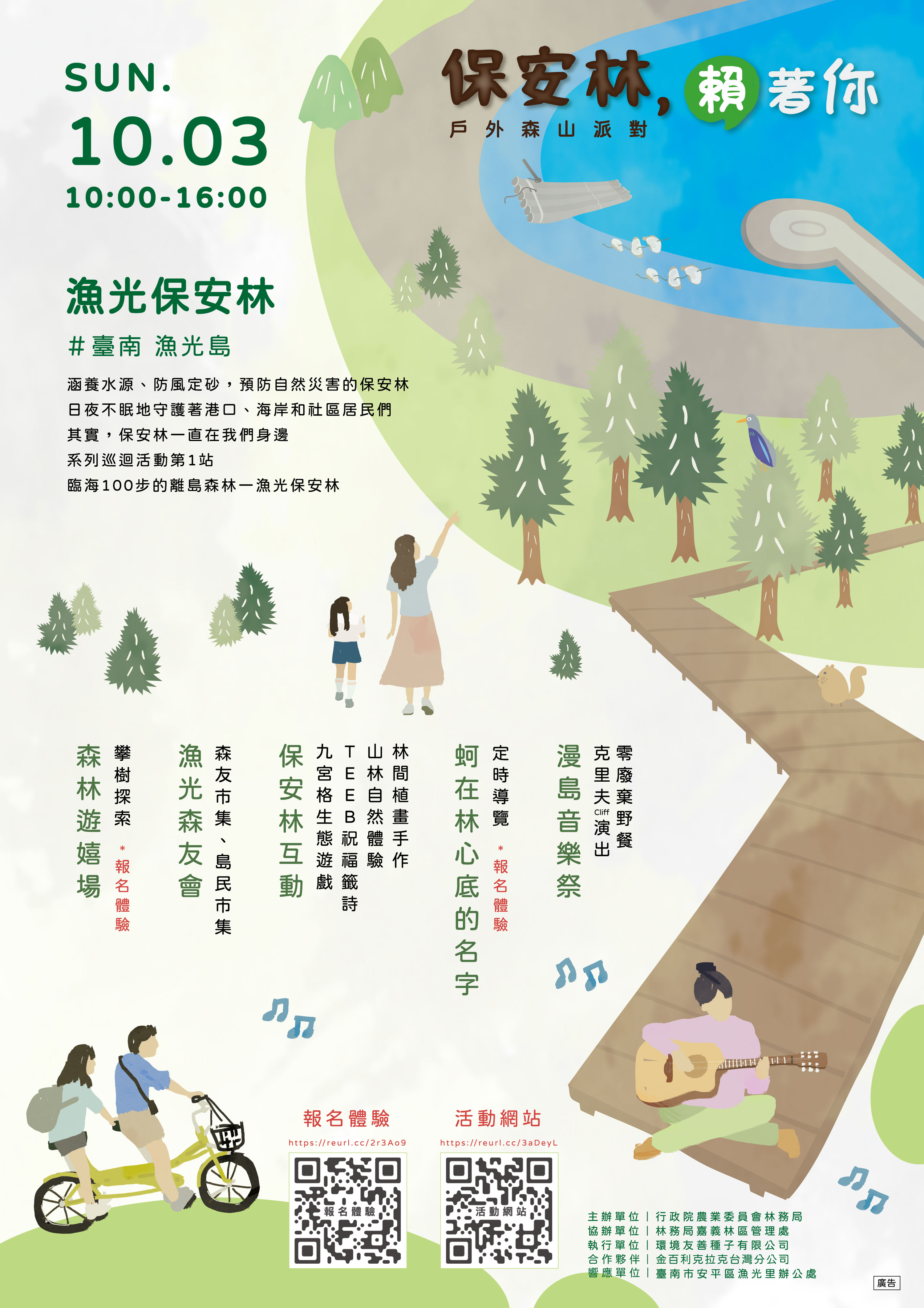 系列第一場活動將在10月3日登場囉!從上午10點到下午4點,在最美的「漁光保安林」舉行森林音樂會,現場還有保安林互動遊戲、自然體驗步道、植畫手作、市集等等,還能事先預約攀樹探索、定時導覽及烤蚵風味餐,以五感全方位體驗山海的美好。金百利克拉克臺灣分公司(舒潔)將設攤宣導 FSC 友善森林標章,並特別邀請到溫昇豪擔任森林大使,號召全民共同關心守護保安林。