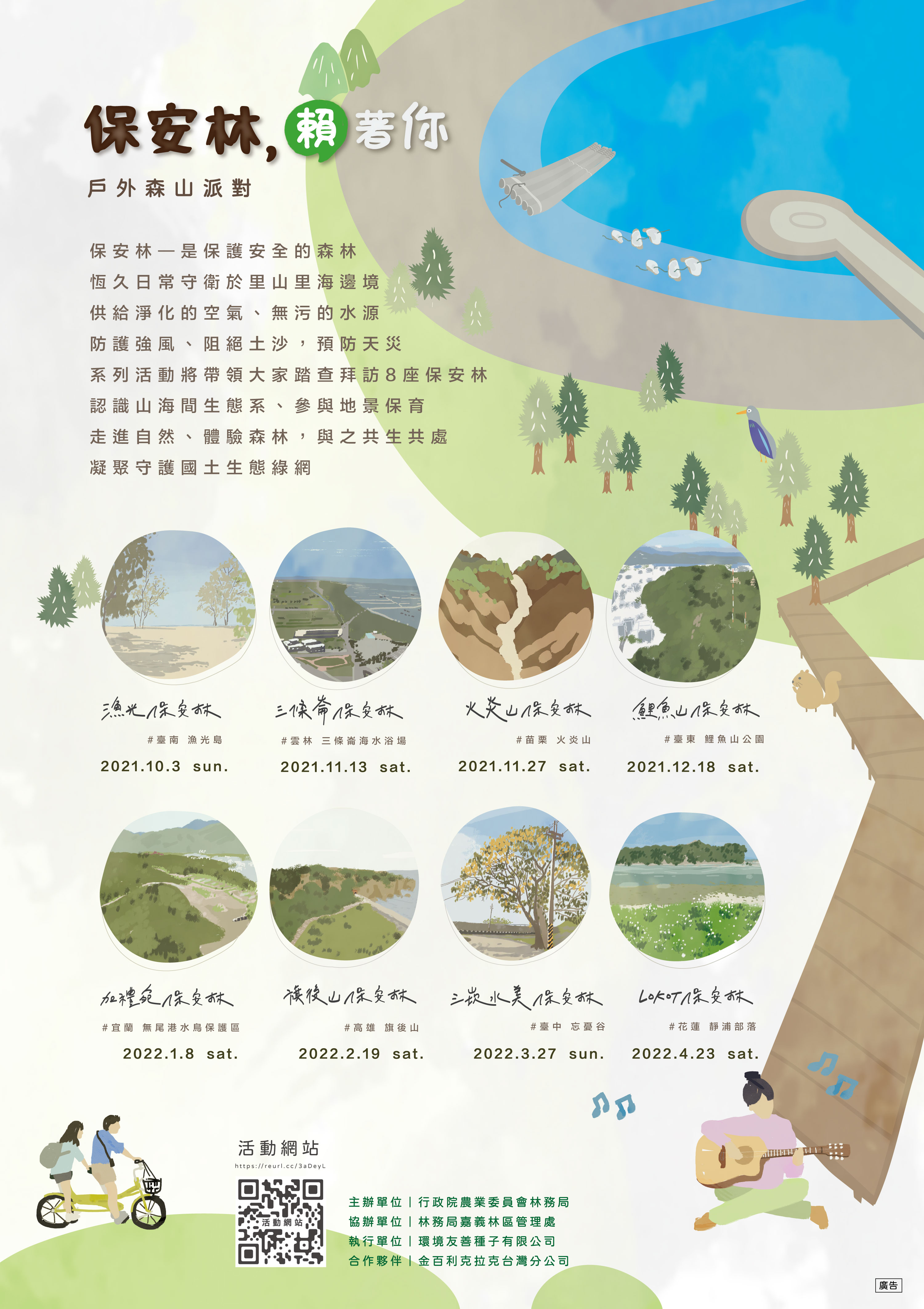 林務局表示,「人」是維護森林環境的關鍵,透過這次活動,要促進社區居民、民間團體、企業攜手合作,共同營造美好的保安林環境,而健全的保安林不但能護衛我們的家園,更帶給我們紓壓遊憩空間,使人身心健康。生活在保安林周邊的社區聚落,歷經數代與森林的情感連結,因此該局在109年起以「保安林命名活動」推廣社區參與,有別於過往保安林僅以數字編號,命名活動將保安林與在地歷史文化結合,並導入民間參與,邀請在地居民以傳統地名、具歷史故事連結,或當地多數居民喜歡的名稱為保安林取名字,至今已完成20號保安林的命名,並將在其中8處舉行《保安林賴著你—戶外森山派對》系列活動,包含臺南市漁光保安林(漁光島)、雲林縣三條崙保安林(三條崙海水浴場)、苗栗縣火炎山保安林(火炎山)、臺東市鯉魚山保安林(鯉魚山公園)、宜蘭縣加禮宛保安林(無尾港水鳥保護區)、高雄市旗後山保安林(旗後山)、臺中市三崁水美保安林(忘憂谷觀音禪寺旁)、花蓮縣Lokot保安林(靜浦部落太陽廣場)。