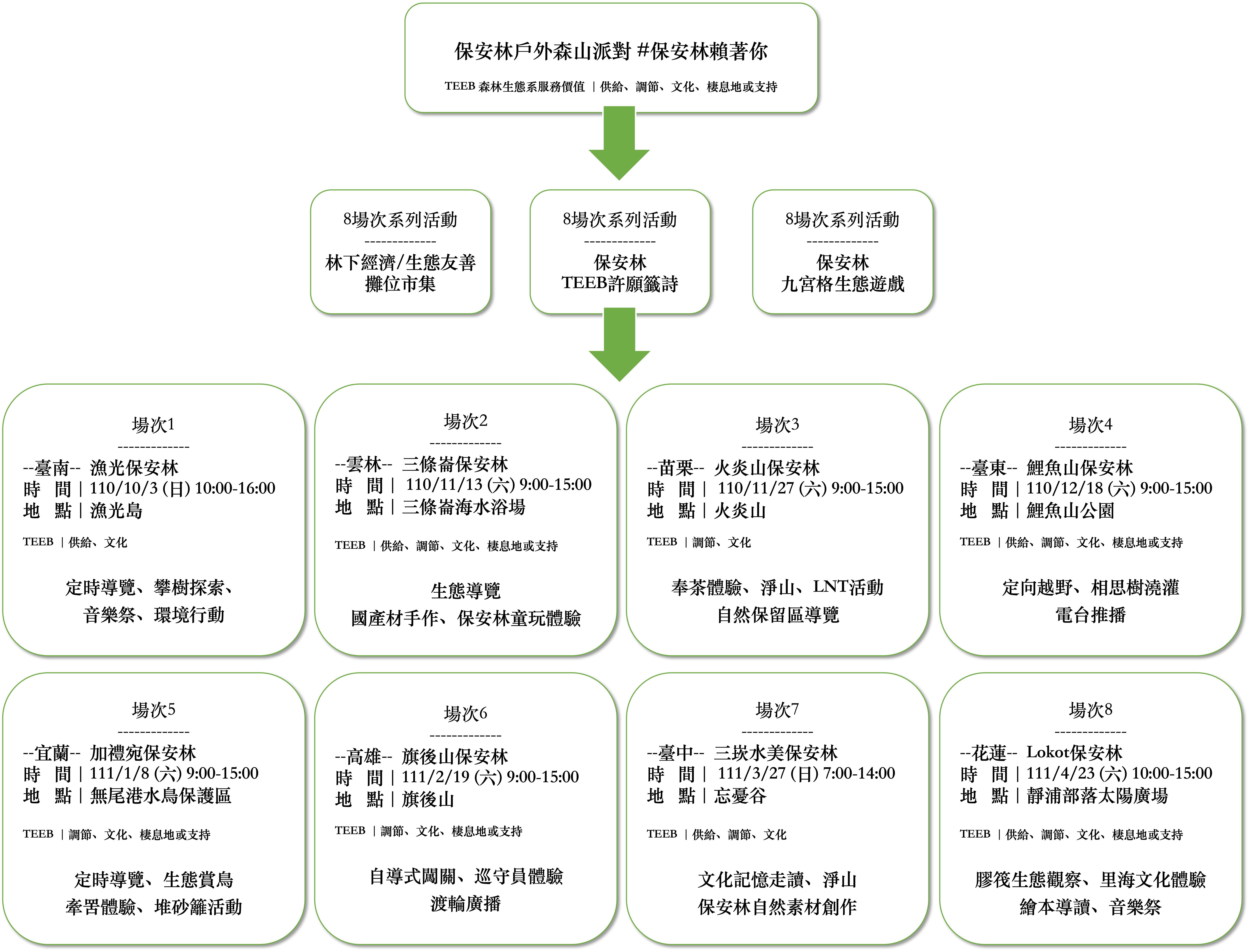 8場活動依不同保安林的功能特色與在地故事規劃體驗活動,除了市集與互動遊戲,還有自導式闖關、定向運動、文化記憶走讀、國產材手作、童玩體驗、繪本故事、自然素材創作、生態賞鳥、淨山、牽罟、堆砂籬、划膠筏、巡守體驗、生態觀察等,歡迎大小朋友到現場體驗,感受森林生態系的多元服務價值。