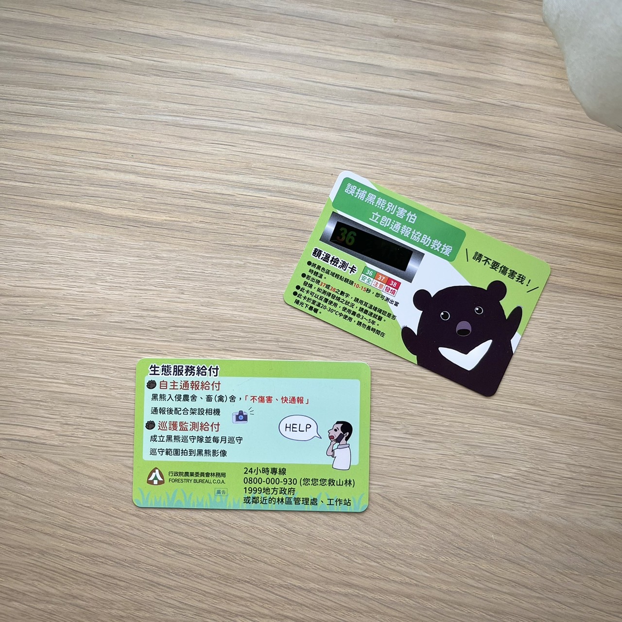 為有效傳達臺灣黑熊保育與救傷通報資訊,農委會林務局從山村居民的工作與生活需求著手,設計了一系列載有臺灣黑熊保育重要資訊的貼心生活小物,提供給山區農民或部落獵人使用,如:涼感排汗材質袖套、柔軟舒適的運動毛巾、易於攜帶的束口背袋及外出時放置隨身物品的提袋,一旦在山區發現黑熊需救援協助,順手即可撥打小物上通報專線0800-000930(您您您救山林);另也製作輕巧好帶的黑熊額溫量測貼片,鼓勵農民工作之餘不忘自主量體溫,照顧自身健康。