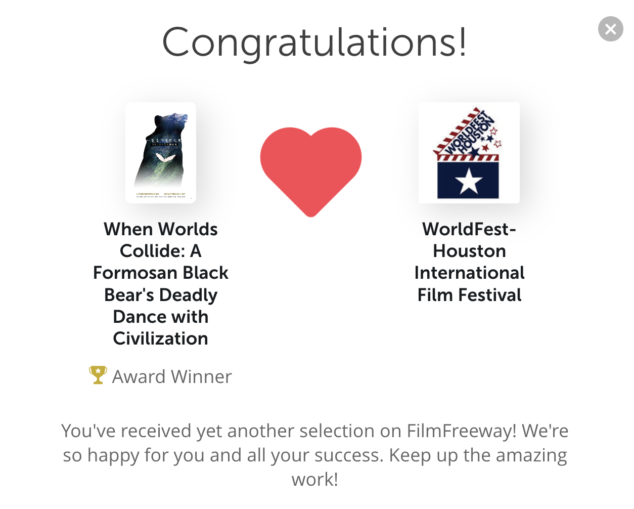 本部影片導演顏妏如開心表示,除了獲獎,更令人驚喜的是,眾多得獎的影片並不是全部都會在影展上放映,得獎的作品再經主辦單位挑選,最終才會在影展上實體放映。而「一隻臺灣黑熊之死」是今年臺灣唯一受邀於休士頓國際電影節實體放映的紀錄片,已於2023年4月30日在美國喜滿客紀念城(Cinemark Memorial City)放映,非常感謝主辦單位的肯定。