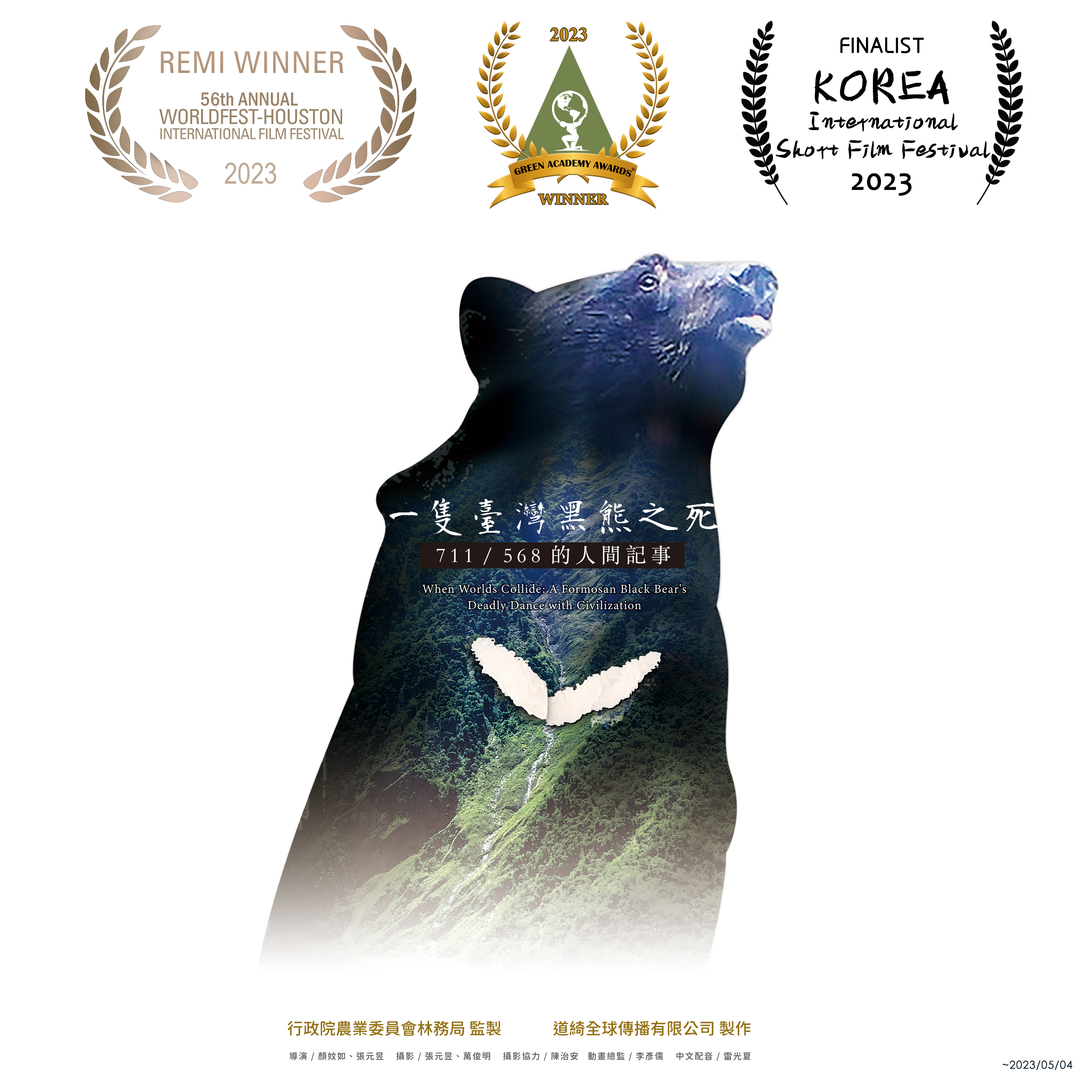 林務局表示,該局委託道綺全球傳播公司拍攝製作的「一隻臺灣黑熊之死-711/568的人間記事」紀錄片,自今年1至4月在臺灣各地放映以來,獲得廣大的迴響。近期亦傳來獲國際影展多項肯定的好消息,其中自1961年在德州休士頓首次舉辦,已超過50屆的休士頓國際電影節(WorldFest-Houston International Film Festival)堪稱世界上歷史最悠久的獨立電影節,與舊金山電影節、紐約電影節並列美國三大最具競爭性的國際影展,李安、史蒂芬史匹柏導演早期作品也都參加過。每年全球都有上千部影片投件此影展,近年臺灣拍攝的非商業作品,不管戲劇、非戲劇類,幾乎都會參加休士頓影展。本次報名參加該影展的「紀錄片」長片類別,有白金、金、銀、銅等獎項,本紀錄片是臺灣唯一獲得「金獎」的長片(WorldFest 56-Long Shorts - Documentary Gold)」,實屬不易。