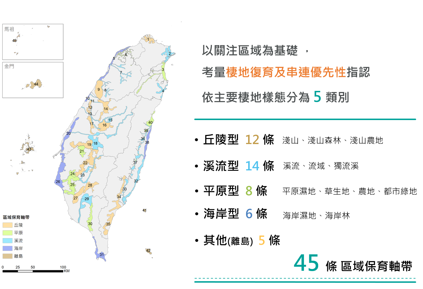 農委會林務局於今(12)日召開記者會宣布「國土生態綠網圖資」平台正式上線,公開全臺45條區域保育軸帶、44個綠網關注區及多項生態地景圖資,農委會陳吉仲主任委員、相關機關、學界與企業代表與會見證,未來將以此作為國家生物多樣性保育空間治理的重要藍圖,以紮實的資料基礎支持政府及民間單位於土地利用與經營規劃導入保育措施,共建從森林到海岸各種環境中,人與自然和諧共生的永續生活。 農委會主委陳吉仲表示,農委會組改為農業部後,林務局調整為「林業及自然保育署」,提升保育量能是最大亮點。保育工作除了森林保育外,更包含國有林之外的棲地環境,為了國土永續發展,必須掌握各區的生物多樣性與棲地狀況,自國土生態綠網於107年啟動計畫後,籌備許久的空間圖層,終於在今日發表,不僅具體落實全國棲地與自然保育的空間規劃,相關保育工作更可依此空間策略有效推動。 林務局局長林華慶也表示,臺灣的淺山、平原與海岸濕地緊鄰人口稠密的都會環境,面對工程開發、農地利用型態轉變所衍生的棲地喪失與破碎化情勢,林務局自107年起在行政院支持下,協調跨部會推動「國土生態保育綠色網絡建置計畫」,首要建置空間策略藍圖,涵蓋實務所需圖資以及保育對策,協助各界持續透過空間聚焦,加速並改善棲地的復育、串聯與管理。 臺灣約60%的保育類野生動物與受脅植物生活於受保護的國有森林以外,因此國土生態綠網以國有林事業區外的低海拔淺山地區、平地及海岸為重點區域,目的在於串連與縫補各棲地,使人口稠密地區的生態系統得以保留或恢復。林務局在農委會特有生物研究保育中心、林業試驗所及各界專家學者的協助下,透過盤整歷年生態調查、棲地狀況、地景資訊、各地關注議題及專家意見,完成全臺生物多樣性熱區、重要關注里山地景、關注水域的分析,並指認了全臺44個國土綠網關注區域。考量棲地復育與串連優先性,進一步設定45條區域保育軸帶,依主要棲地樣態,分為丘陵型、溪流型、平原型、海岸型及離島型等5種類別,指引生態棲地復育與地景空間連結的投入方向。 林務局說明,此次公開的「國土綠網關注區域」、「國土綠網區域保育軸帶」包含可供套繪之空間圖層,以及各區指認目的、棲地保育策略、需關注棲地類型與物種等資料,除能提供政府各部會在國土復育整合、國土規劃、公共工程、農業及生物多樣性保育等多個領域運用;充分開放的生態資訊,更能指引公、私部門開發單位之工程選址與生態調適,避免因資訊不足引發環境爭端;另一方面,許多里山里海社區是生態系復育與棲地連結的重要節點,當社區能認知在地生態資源永續的重要性,進而著手行動並在相關資源引入下,就能透過友善農耕、環境教育或綠色產業等方式,促進里山社會-生態-生產地景的保全及永續。 林務局也補充,圖資所指引的空間策略,更可作為企業推動ESG工作、投入生物多樣性的空間布局,今日中華航空公司、中華電信公司、台灣萊雅公司、玉山金控公司、光寶科技公司、光林智能科技公司、沃旭能源公司、家福公司、台灣永續能源研究基金會、慈心有機農業發展基金會等皆來到現場表達支持,其中光寶科技集團旗下光林智能科技股份有限公司(LEOTEK)金海濤總經理也於會中分享相關圖層的企業運用,表示光林智能今年將優先布局恆春半島海岸林保育軸帶的陸蟹保育工作,善用國土綠網保育軸帶圖資,展開產官學資源的跨域連結,共同邁向生物多樣性與智慧永續城市的願景。 國土生態綠網圖資已放置於內政部TGOS地理資訊圖資雲服務平台、成為國家底圖之一;另外,林務局也特別於自然保育網設置「國土生態綠網藍圖」專區(https://conservation.forest.gov.tw/0002174),各界均可自由下載運用。林務局更歡迎各界運用後回饋使用意見,讓圖資可定期檢討提供更為充足的生態資訊,也透過落實空間策略的實質行動,共同守護生態環境、串聯國土生態綠網。