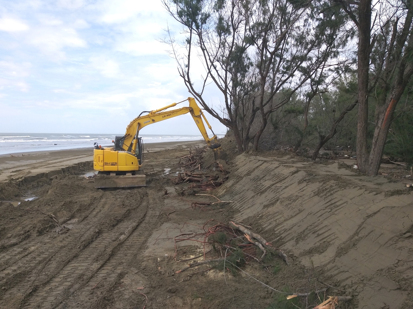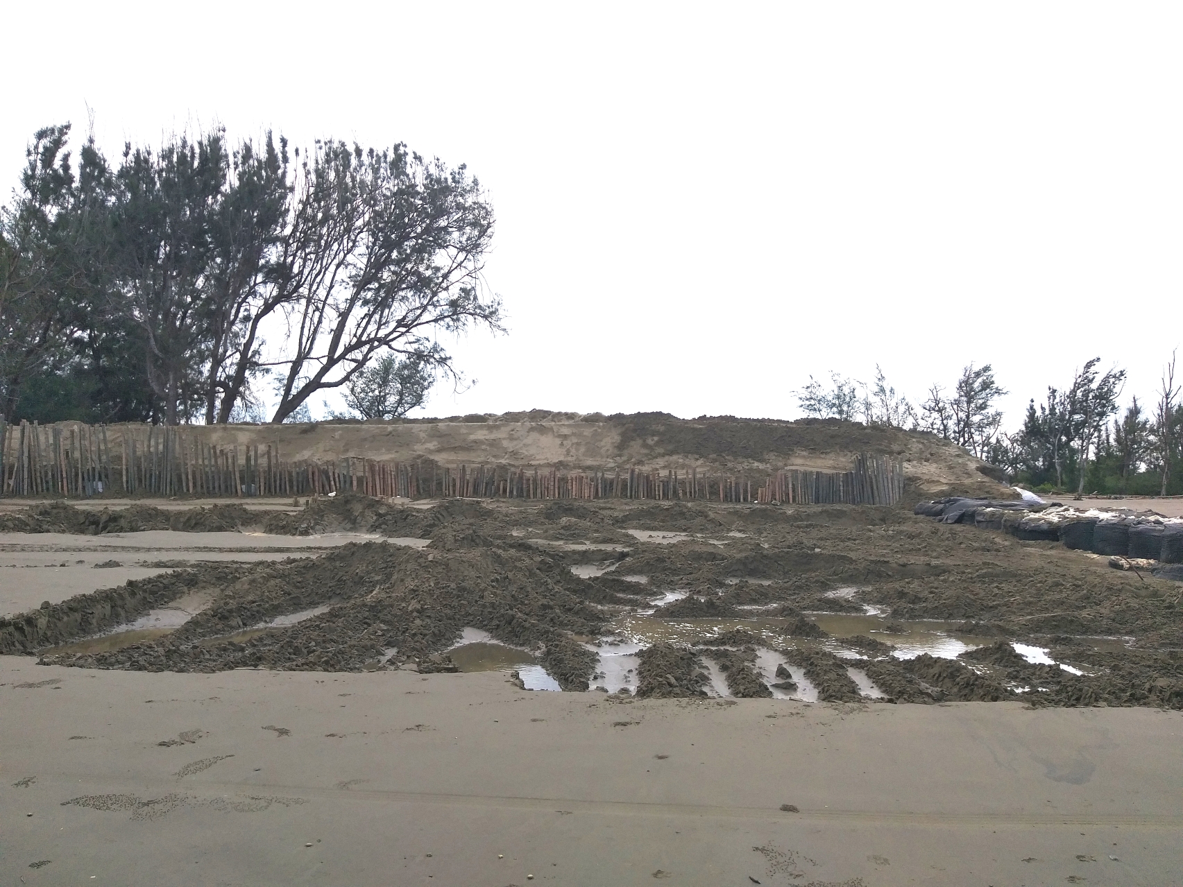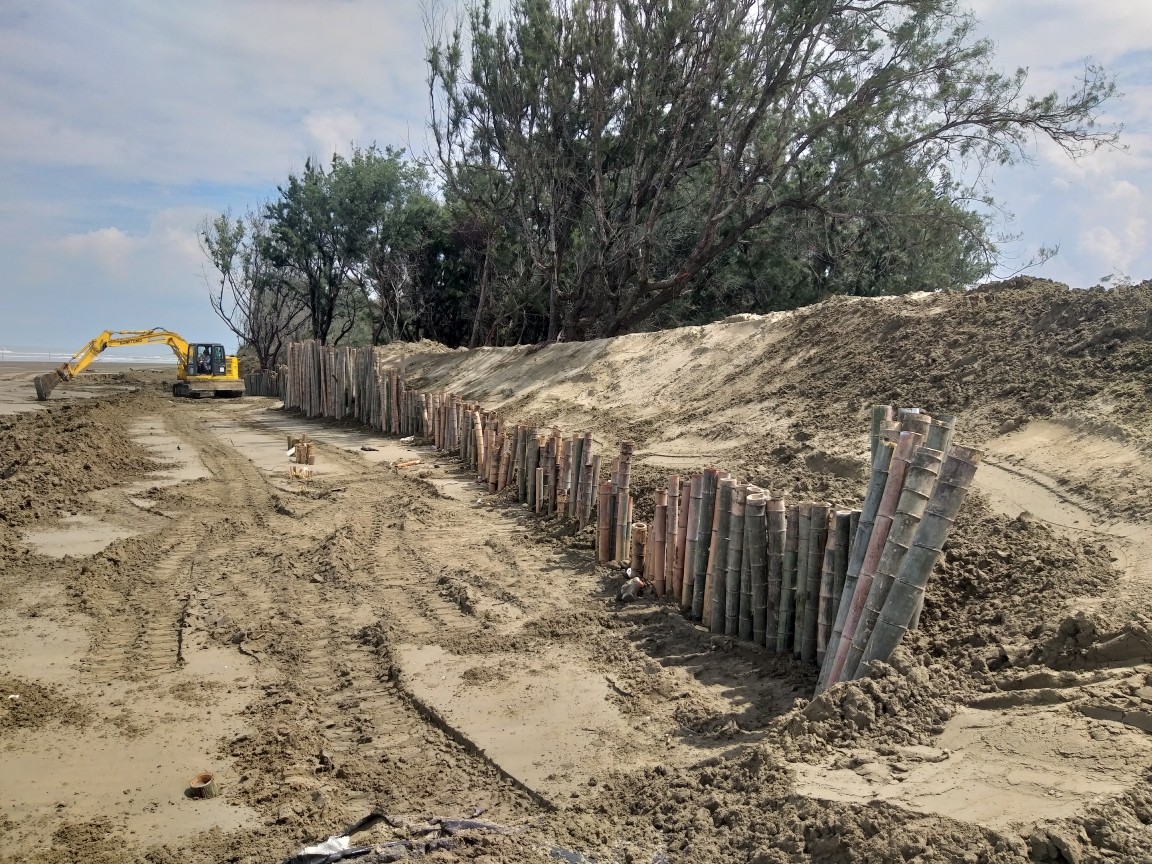 林業保育署嘉義分署是專責造林的機關,在保安林經營上常以營造複層林相,強化保安林抵擋風砂、抗鹽害及生態保育等功能,為了維護北門雙春保安林及利於日後復育造林,在杜蘇芮颱風造成保安林破口後,嘉義分署即緊急回填土砂,以保護林木根部土壤流失,但翌日即遭大浪沖毀,近期再於現地前後打設定砂木樁、竹柵及回填625包約1000公噸的太空包土砂,暫時渡過8月31日一年二次最大潮的危機,不料9月2日潮水溢流改自北側湧入,漫流沖刷保安林地。