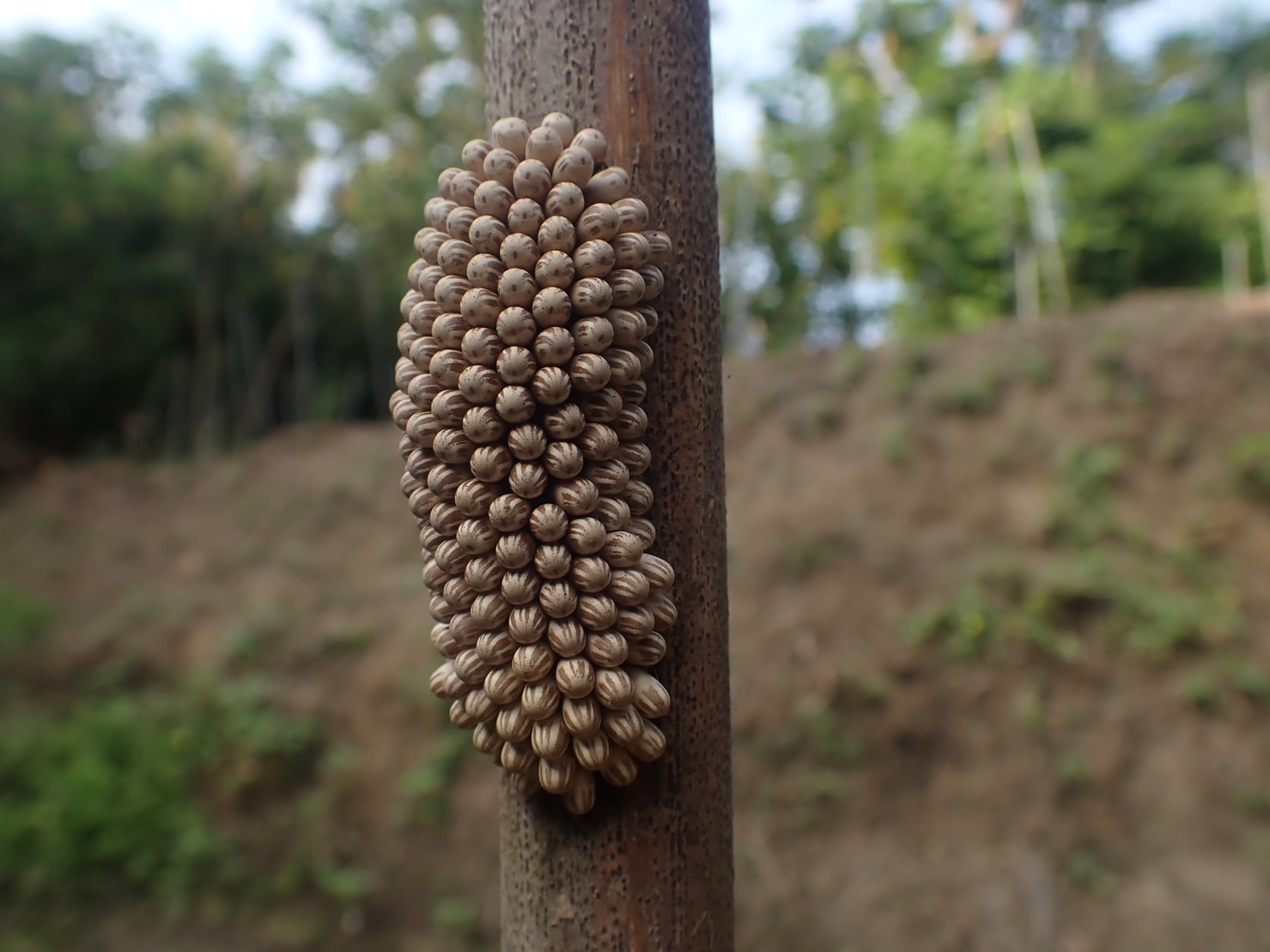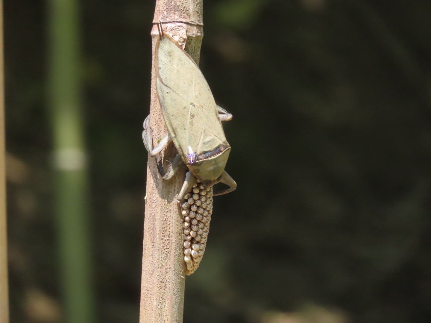 林業保育署新竹分署今(112)年8月23日在苗栗後龍過港段之保安林地內偕同轄內推動「國土生態綠色保育網絡平台」公、私、民間團隊等夥伴,投入埤塘棲地營造協力活動,以傳統的手作方式,進行埤塘周邊截水溝與水路整理及下水進行埤底土壤晶化作業,透過深水區踩踏及淺水區糊邊坡,讓埤塘水源能穩定供應及具保水能力;並以竹稈製作供大田鱉產卵的棲枝,打造大田鱉適切的居所及產房,期藉由該等友善作為,能讓大田鱉回到自然的環境棲地。 經過三週的監測觀察,9月14日即傳出好消息,新竹分署同仁在其中一棲枝上發現大田鱉的卵塊,卵的數量多達上百顆,當日同時也看到大田鱉從水中爬上棲枝,將身體上的水敷在卵塊上做保濕保護卵塊,盡責地做好爸爸的照護工作。二天後,9月16日小田鱉已順利孵化並滑落入水中,完成世代交替。 大田鱉是臺灣體型最大的昆蟲,在農田及濕地昆蟲中屬於食物鏈頂端物種,牠的存在象徵一個穩定健全的生態系,由於其對環境敏感,只能在無毒、乾淨的水域生存,一旦使用農藥、化肥,幾乎就找不到大田鱉的蹤跡。對於能在大田鱉繁殖季節尾聲,看到大田鱉回到後龍好望角的自然棲地,讓協力建構友善環境棲地的夥伴們都非常開心,也相信埤塘友善及改善的工作至為重要,且是優先應關注的課題。 後龍好望角一帶因本身豐富的自然生態資源及過去居民開墾利用的人文背景,交雜出在地特有的埤塘里山地景,然而因為農村人口大量流失、埤塘的利用逐漸式微、外來種入侵、農藥污染甚至珍稀物種的盜獵,使淺山埤塘的自然資源逐一劣化消失。此次眾人協力完成643地號埤塘的棲地營造,達成改善埤塘陸化和外來種入侵等課題,並提升自然環境棲地品質,讓具有環境指標性的大田鱉回來了,是好的開始,也建立大家的信心,亦期累積此次埤塘棲地營造經驗擴大至好望角地區的每口埤塘。