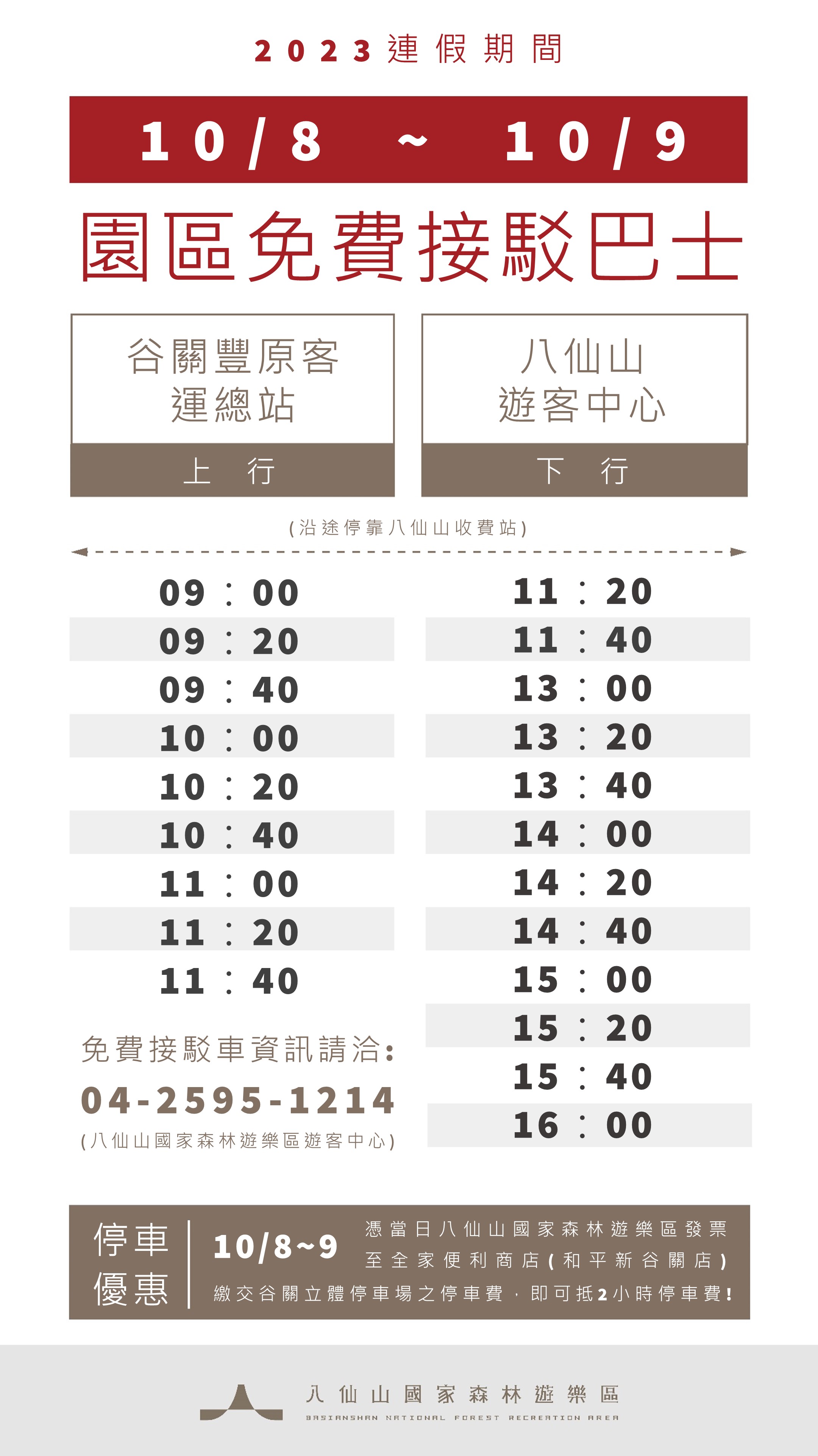 為慶祝雙十國慶,林業及自然保育署臺中分署所轄大雪山、八仙山國家森林遊樂區10月7日至10日提供入園門票半票優惠。現正值秋初,大雪山國家森林遊樂區內虎杖花開始綻放,片片粉嫩,妝點了山頭。國慶四天假期,除了安排到臺中賞煙花,這時上大雪山賞虎杖花景正是最好時機! 林業保育署臺中分署表示,時節已入秋,大雪山國家森林遊樂區氣溫約在15-20度之間,嫣紅的虎杖現正綻放中,虎杖淡粉色的花與粉紅色的瘦果,堪稱是高山裡最美的野花,在藍天的襯托下,更顯艷麗,大雪山林道48-49K、49K天池、神木步道是最佳觀賞地點,挑一個最佳角度就能拍出網美照。八仙山國家森林遊樂區溫度正舒爽,區內步道老少咸宜,漫步在林中,是連假期間,全家出遊的最佳場所。 為舒緩雙十連假車潮,八仙山國家森林遊樂區於10月8日至9日提供谷關至園區之免費接駁車,從豐原客運谷關站搭車至八仙山收費站,下車購票後直接抵達八仙山遊客中心,持入園發票可享停車費優惠,於谷關立體停車場旁全家便利商店繳費折抵當日2小時停車費,請遊客多加利用。 欲了解大雪山、八仙山國家森林遊樂區相關資訊,請上林業及自然保育署「台灣山林悠遊網」、林業署臺中分署網站查詢。