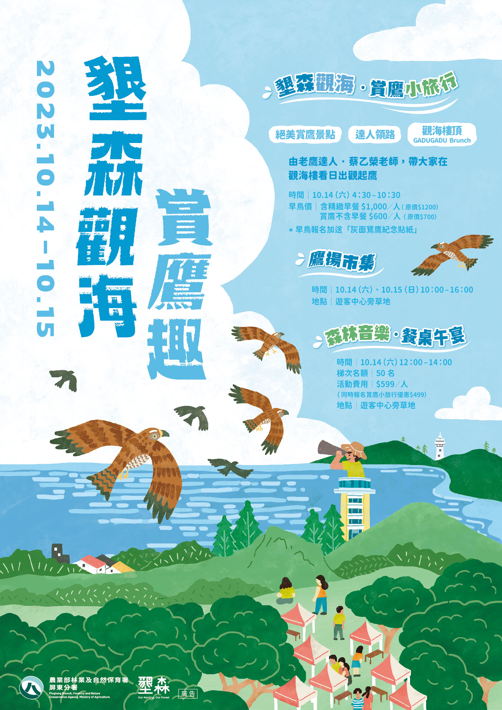受小犬颱風影響,為墾丁國家森林遊樂區帶來一些災情,經過林業及自然保育署屏東分署現場工作同仁連日清理後,將於112年10月13日(星期五)重新開放,邀請遊客蒞臨墾森與鷹同行。 即日起至10月31日期間限定的「灰面鵟鷹・墾森迷航」集章尋寶活動,尋寶卡可在墾森購票處購買,有20隻迷航的鵟鷹停留在墾森園區內,在園區集章的同時,也能觀察到因為小犬颱風所帶來的鹽風,讓許多終年常綠的樹木紛紛落葉的自然現象,是相當難得的環境教育機會。 而在10月14日(星期六)清晨5點30分,在老鷹達人蔡乙榮老師的導覽下讓森友們來趟5小時的秘境賞鷹限定小旅行,享受觀海樓頂絕美日出以及壯觀的起鷹景致。中午在墾森遊客中心戶外草原區,也特別邀請了屏東部落廚房及在地樂手團隊,為森友們帶來一場結合視覺、聽覺及味覺的「森林午餐音樂會」,名額有限報名要快。 10月14日至15日在墾森林蔭下,也有獨特風格的「森林市集」,豐富的「墾森觀海賞鷹趣」系列活動,特別適合全家大小一同來玩。詳細活動報名資訊請見「墾丁國家森林遊樂區」FB粉絲專頁(網址:https://www.facebook.com/ktforestarea)。