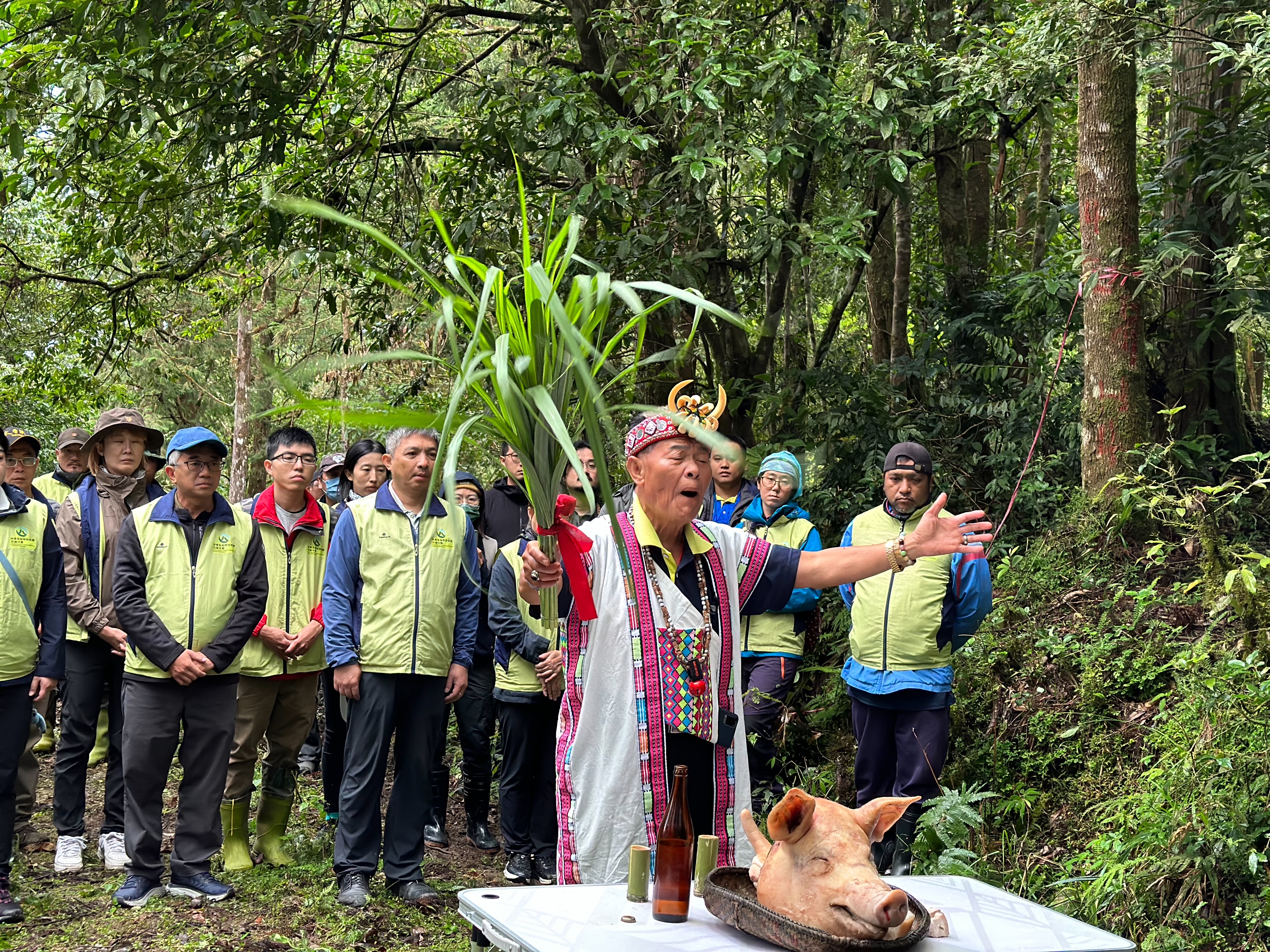 今日清晨的野放行動,除了野灣野生動物保育協會及野聲環境生態公司外,花蓮分署也邀請中平、卓溪及清水等三部落族人共同參與,在清水部落頭目何成忠帶領進行祈福及命名儀式後,Da qu-ali即在森林護管員的驅離槍聲及氣鳴喇叭聲響中,朝森林深處奔去。