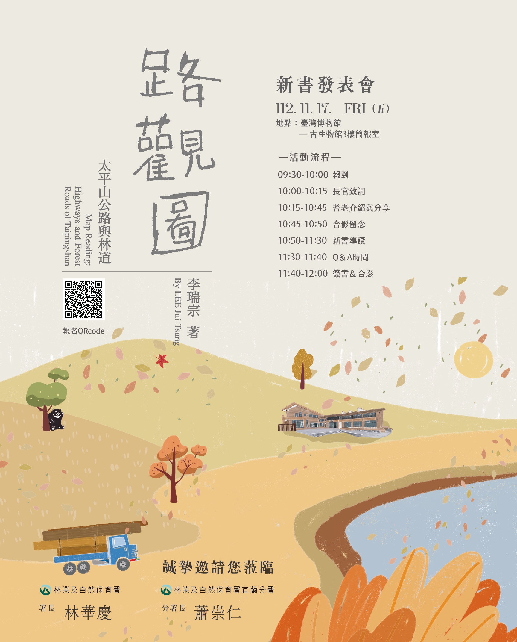 《路觀圖-太平山公路與林道》最終場官方新書發表及導讀簽書會,林業及自然保育署宜蘭分署訂於:十一月十七日(周五),在「國立臺灣博物館古生物館三樓簡報室」辦理,官方版最終導讀簽書會(報名網址: https://reurl.cc/v6vEKl),敬請粉絲與讀者們把握機會喔!