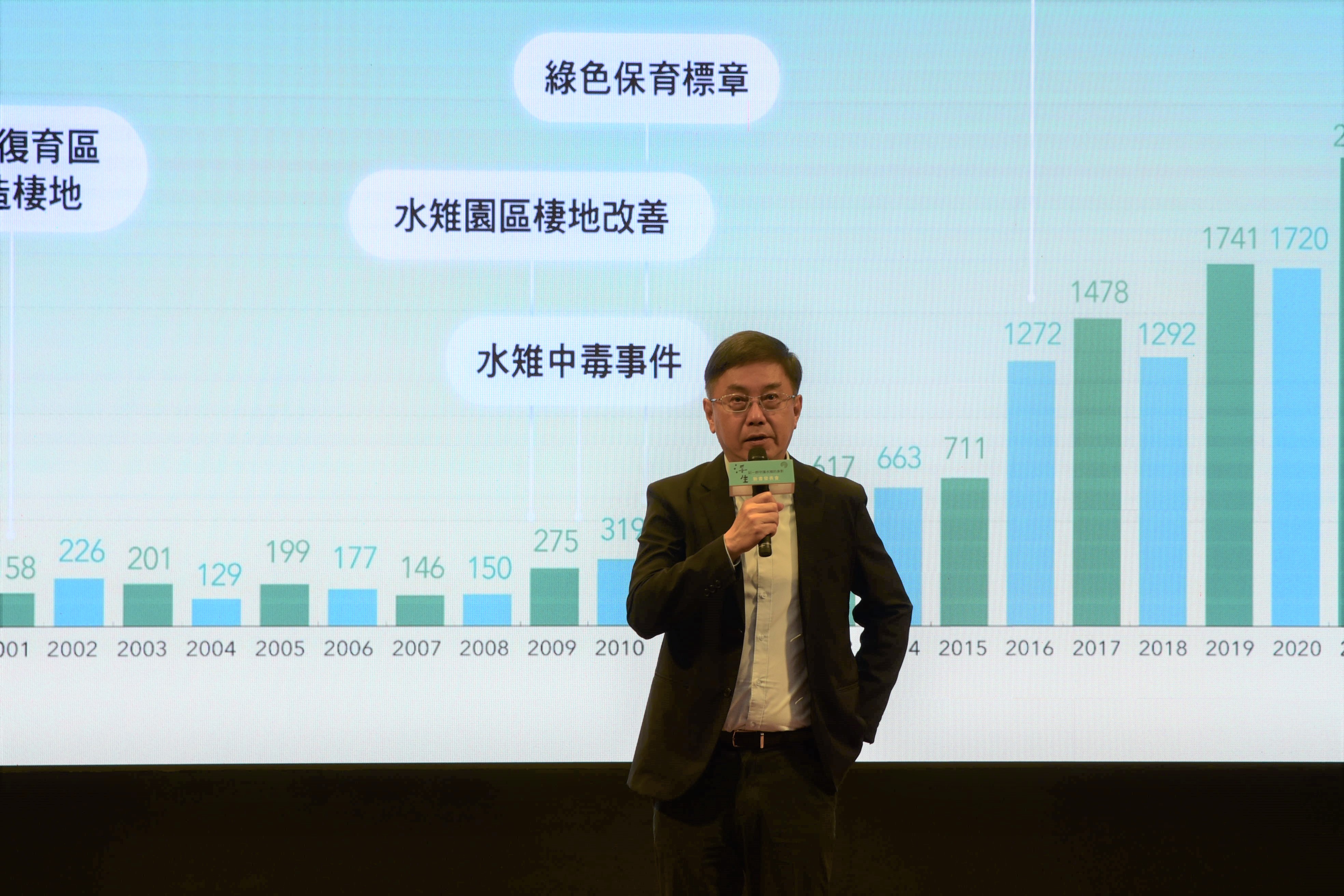 林華慶於會中憶及復育水雉族群的心路歷程及轉折:2009年他到林業保育署的前身林務局擔任技正,負責官田水雉園區營運相關業務。當時的園區主任邱滿星與經理翁榮炫提出改善園區濕地型態、移除外來水生植物與提早種植菱角植株以增加水雉繁殖窩數的構想,認為透過這些方式可讓全臺族群始終無法超過百隻的水雉有效提升族群數量。林華慶當時說服長官增加一倍的補助經費,讓園區著手改善棲地,而這些策略也果真奏效!2009年冬季進行水雉族群調查,數量一舉突破200隻。