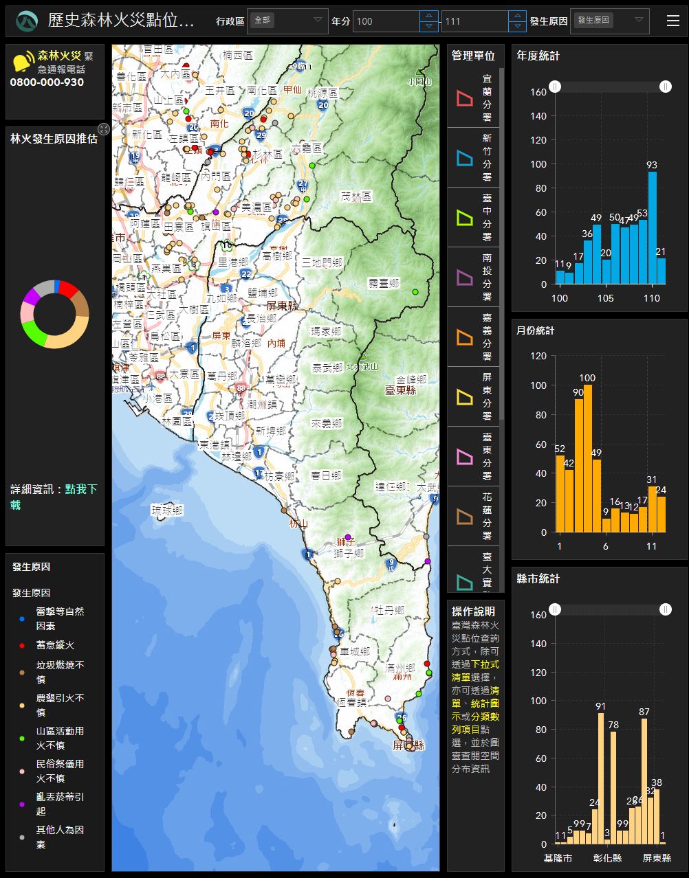 乾燥季節來臨,為降低森林火災發生之風險,林業保育署屏東分署今(29)日於潮州工作站辦理「防範113年度森林火災防火座談會」,與會成員包括內政部保安警察第七總隊第八大隊、屏東縣消防局及各消防分隊、屏東縣政府農業處、鄉公所、本分署監測志工及國有林班地之承租人等,共同分享森林火災防救經驗、專業知識及強化災害救援能力,同時也更新確認各單位森林火災聯繫窗口通訊資料,增進林火災害發生時橫向聯繫速度。 以往屏東地區森林火災發生原因多由人為活動引起,例如農墾、山區活動不慎引火、民俗祭儀焚燒紙錢所致,屏東分署針對不同族群於民俗祭儀焚燒紙錢的時間不同,進行精準式的防火宣導,也鼓勵各地區殯葬管理單位於乾燥季節進行公墓燃料移除或預為開闢防火線等工作,另外也積極宣導指定區域焚燒紙錢等措施來加強防範民俗祭儀所引起的森林火災,最後也決議擇恆春地區邀請相關單位來試辦公墓區指定焚燒紙錢位置獎勵方案。 屏東分署楊瑞芬分署長也另外分享今(112)年農業部林業及自然保育署所建置之「林火風險評估系統( https://ffwi.forest.gov.tw/)」,此統結合中央氣象署氣象資料及地理資訊系統圖資,計算林火天氣指數(Fire Weather Index, FWI)產製臺灣林地林火潛在風險,預測一周內全台林火危險指數,防火業務單位可針對火災好發區域進行運算危險指數,當林火好發地區指數達最危險值時,可即時進行因應措施;另森林火災發生時亦可運用該系統規劃行車路徑前往救火,以爭取救災時效。而且只要在網路輸入「林火風險評估系統」關鍵字,即可立即查詢,所以登山客、社區區民人人都可以是防火尖兵。與會鄉鎮公所人員也表示,將會推廣「林火風險評估系統」給在地區民使用,同時宣導民眾謹慎用火,一起為防範森林火災努力。 森林資源相當珍貴,需要全民共同保護,林業保育署屏東分署呼籲「縱火有罪,舉發有獎」,鼓勵全民檢舉擅自放火燒毀國有林者,可撥打免付費電話:0800-000-930(您您您救山林)舉發。如因而查獲犯人,得發給每案新台幣10萬元破案獎金。希望藉此呼籲防範森林火災,以維護臺灣美好的山林環境。 林火風險評估系統連結 https://ffwi.forest.gov.tw/