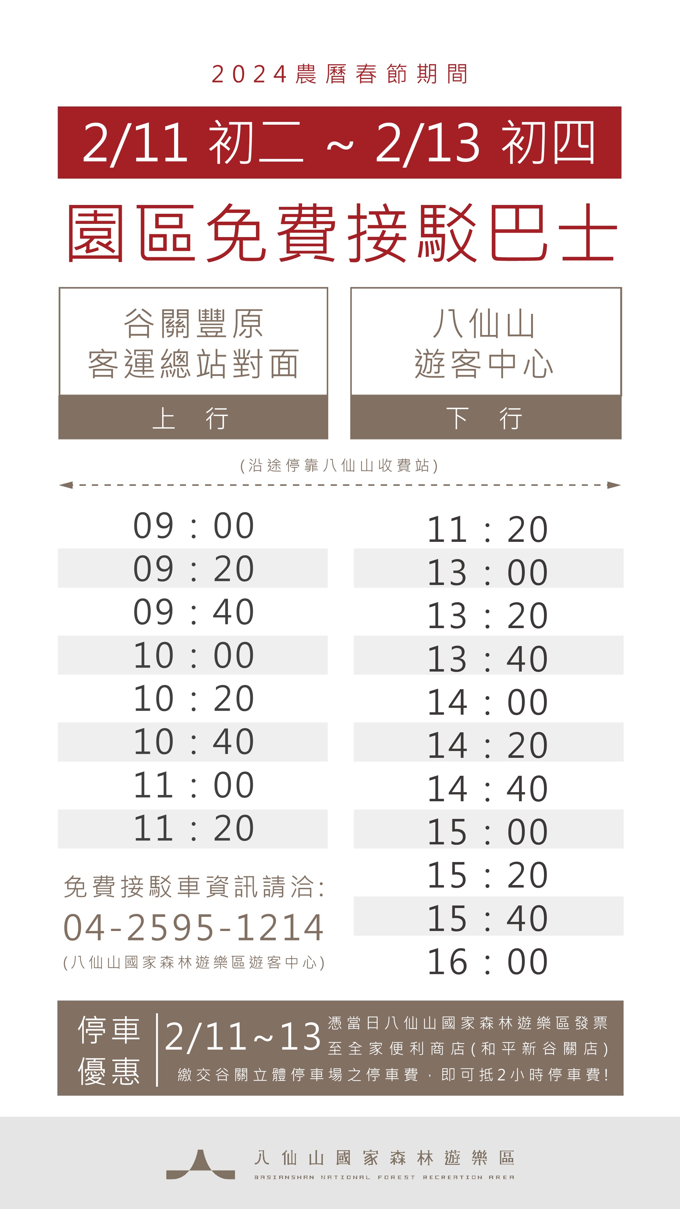 八仙山國家森林遊樂區初二至初四接駁車時刻表
