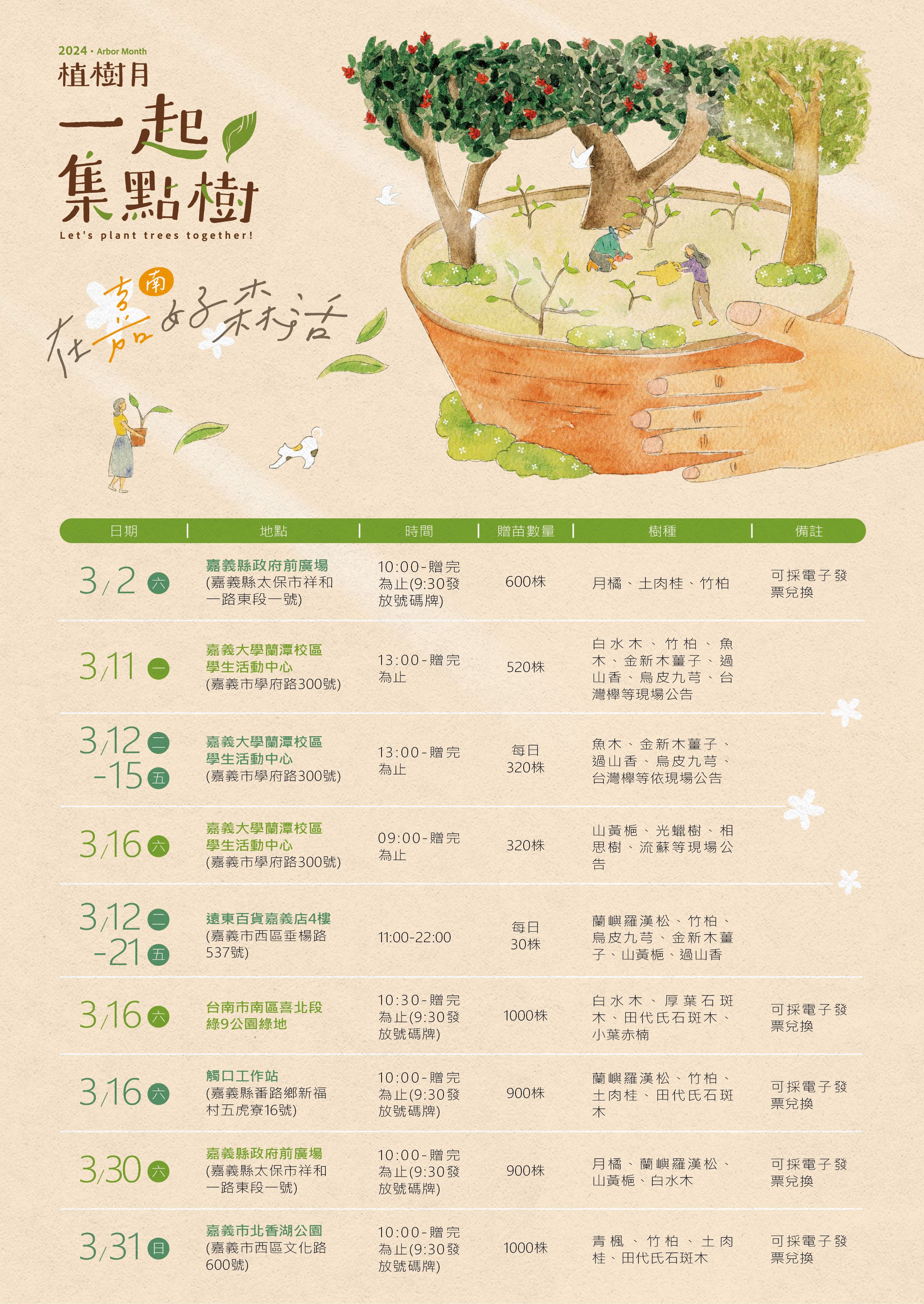一年一度的植樹月自3月1日起正式啟動,農業部林業及自然保育署嘉義分署為響應今(113)年植樹月「一起集點樹」主題,共規劃了21場贈苗及植樹活動,邀請民眾一起集發票換樹苗,落實植林護樹行動,預計送出多達21種超過6,000株原生種植物苗木。累積的發票嘉義分署將捐贈給「台灣石虎保育協會」、「社團法人臺灣野灣野生動物保育協會」及「社團法人環境資訊協會」等野生動物保育團體,集眾人的愛心為野生動物保育與環境永續提供正面的力量。 嘉義分署說明,3月2日(六)上午10時首場贈苗活動將配合嘉義縣政府婦女節活動『Q women Q我們』在嘉義縣政府前民主廣場舉行,現場贈送具有長壽、健康民俗意義的常綠植物「竹柏」;富含肉桂醛可作為香料的「土肉桂」;以及開花香氣四溢的「月橘」等共計600株苗木,活動當日每人捐贈113年1-3月紙本或電子發票3張可兌換1株苗木,最多兌換2株,數量有限,送完為止。 嘉義分署分署長張岱表示,原生植物在臺灣生物多樣性及生態系平衡扮演重要角色,可提供多元生態服務功能,包含涵養水源、野生動物食源及棲息環境等,同時透過栽植樹木亦可幫助療癒現代人忙碌的心,希望贈苗鼓勵民眾栽植適合當地環境的原生樹種,串聯破碎化的生物棲地,營造人與野生動物共存的宜居環境。此外,為了響應減塑政策,贈送的苗木皆使用環保可分解容器,同時請民眾自備提袋領苗,讓植樹綠美化不只能達成減碳的美意,更落實環保永續。 嘉義分署113年植樹月公益贈苗活動場次還有3月11日至16日(一至六)在嘉義大學蘭潭校區活動中心配合嘉義大學森林週辦理,兌換苗木方式依嘉大規則公告;3月12日至21日於遠東百貨嘉義店;3月16日(六)於臺南市南區安平港聯外道路綠9公園;3月16日(六)於嘉義分署觸口工作站等計21場次,各場次活動細節及贈送樹種詳場次表或洽詢嘉義分署經營企劃科(05-2787006#377 蔡小姐),苗木數量有限,送完為止。