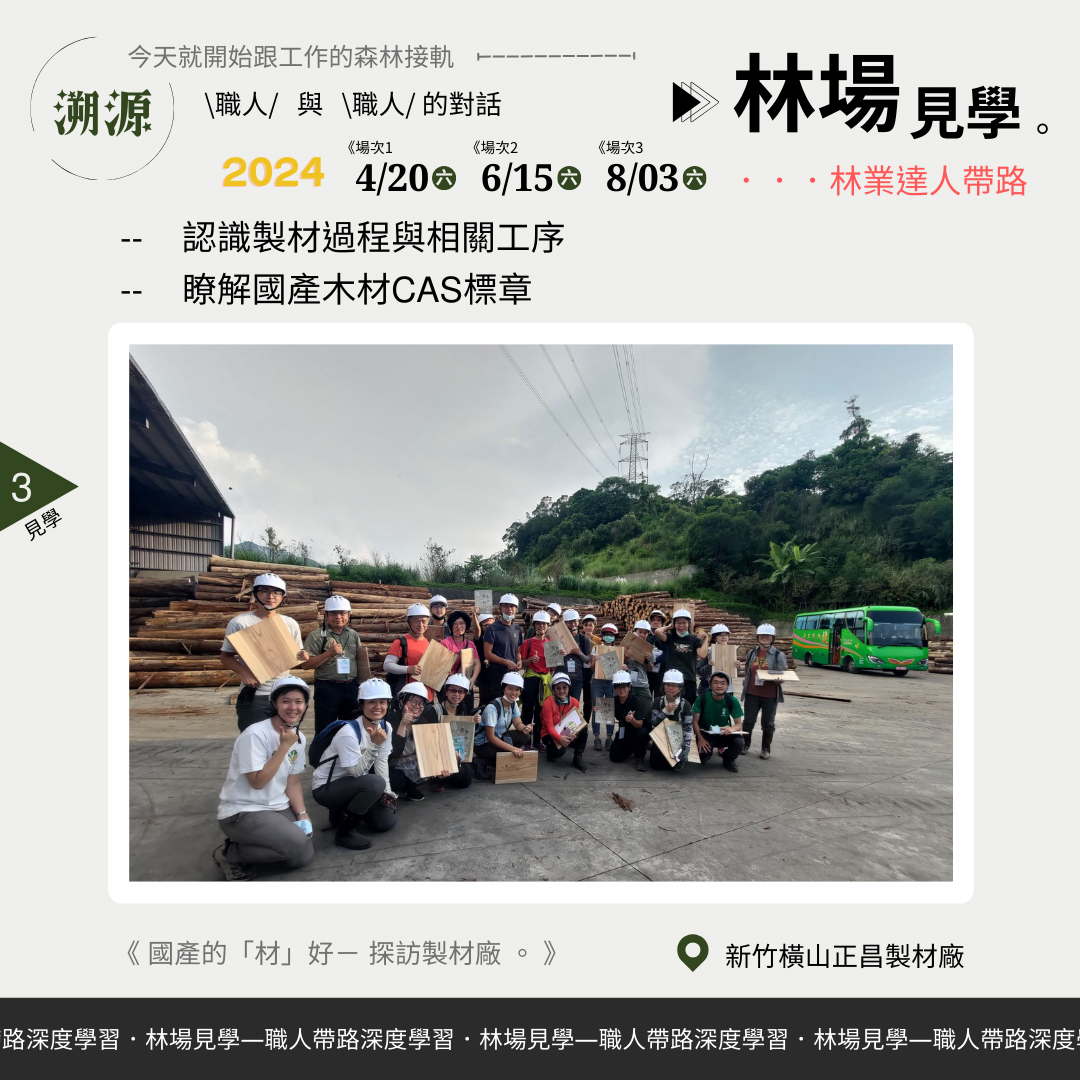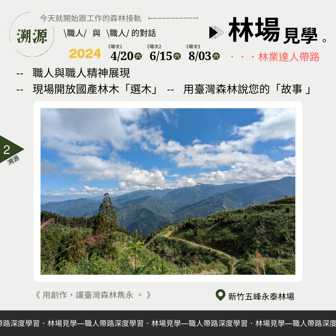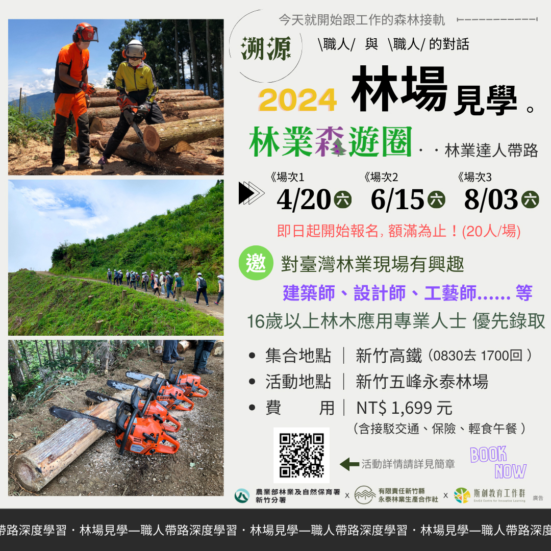 職人帶路─「林場見學」.「林業應援」作業林場知性新體驗 臺灣森林覆蓋率超過60%,但國產材自給率只有約1%,因此永續森林經營至關重要,尤其對接全球關切的2050淨零排放國際趨勢,森林碳匯是重要自然解方之一,共同面對環境問題的挑戰刻不容緩。為讓公眾認同與參與相關課題的溝通,近幾年林業及自然保育署新竹分署、永泰林業生產合作社以及斯創教育工作群持續針對不同客群推出「林業森遊圈—作業林場知性體驗」遊程,讓參與者從永續森林經營的認知,轉化成行動從生活及工作中支持國產木材。今年度活動將於4月在新竹縣五峰鄉的永泰林場開跑,陸續推出兩天一夜深度體驗式的「林業應援團—杉林裡的Working Holiday」,及一日針對林木利用專業者的「林場見學—職人帶路深度學習」活動供大眾參與。 「林業應援團—杉林裡的Working Holiday」二日型活動,共有3場次,分別於5月3-4日、6月28-29日、7月12-13日週五、六舉行。對象為16歲以上對林業有興趣、關心淨零排放 、自然碳匯、臺灣森林的朋友,活動將帶您進入一趟由林到木、由木到材的旅程,學習林業人在山林的生活與森活,從造林、收穫與製材等工作,實地參與林業經營,和觀摩製材工廠的現場工作,了解國產林木資源的利用與永續森林經營理念,從森林生產流程中形成一個永續循環迴圈。 「林場見學—職人帶路深度學習」一日型活動,共有3場次,分別於4月20日、6月15日、8月3日的週六舉行。對象為16歲以上對臺灣林業現場有興趣的木工師、設計師、工藝師、建築師……等林木應用專業工作者,喜愛木頭的溫潤,常在作品中融入「森」元素,活動將帶您來一趟「材料溯源」之旅,由林業職人帶路,深入林業現場了解林木生產循環歷程;體驗職人「取之森林、用之森林」的生產故事;感受國產木材帶來的溫度與對環境的友好;有機會在林場中「選木」成為您未來創作的素材,為作品注入「臺灣」的底蘊。 前述活動,每場次開放20位名額,「林業應援團」二日,費用3,990元/人、「林場見學」一日費用1,699元/人,均採線上報名,相關報名資訊及詳情詳見「永泰林業×正昌製材」或「斯創教育工作群」臉書粉絲專頁,活動洽詢專線:02-77468765 、0966-571447(執行單位:斯創教育工作群)。 2024年下半年也將陸續推出針對一般大眾輕度休閒林業體驗活動,帶領大家走訪林場,感受人工林之美,瞭解林業生產循環及永續林業的「森」命力,相關林業推廣活動訊息請持續追蹤「永泰林業×正昌製材」及「斯創教育工作群」臉書粉絲專頁。