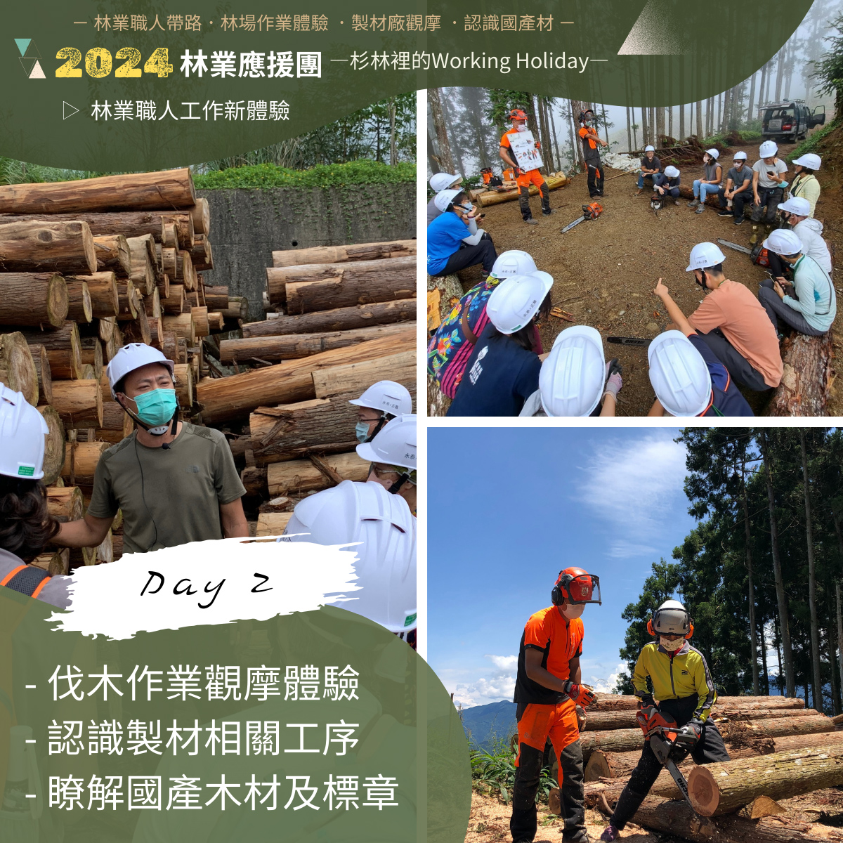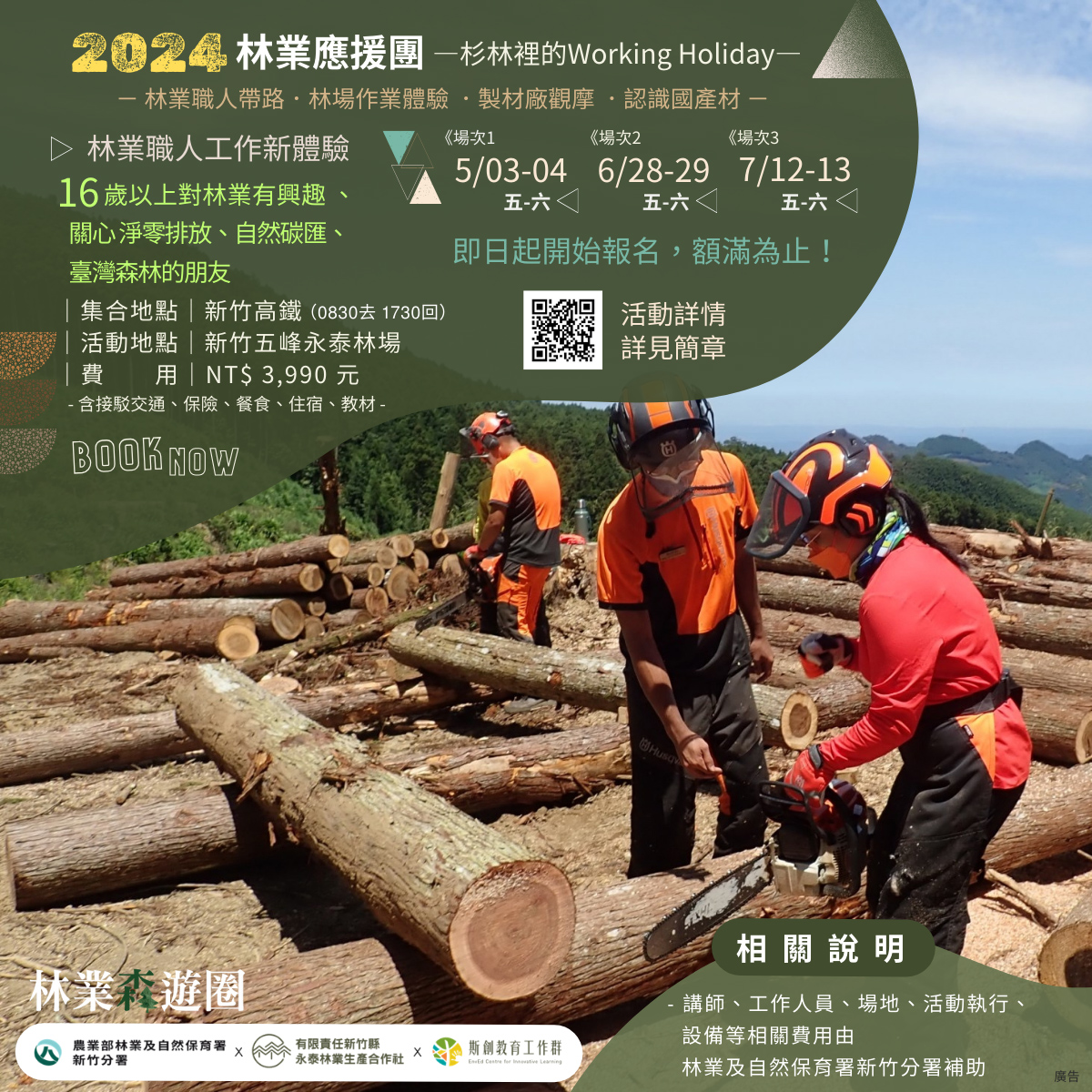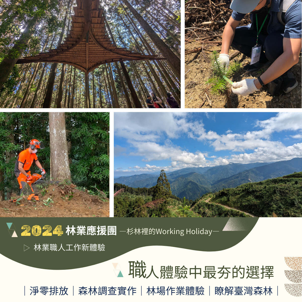 職人帶路─「林場見學」.「林業應援」作業林場知性新體驗 臺灣森林覆蓋率超過60%,但國產材自給率只有約1%,因此永續森林經營至關重要,尤其對接全球關切的2050淨零排放國際趨勢,森林碳匯是重要自然解方之一,共同面對環境問題的挑戰刻不容緩。為讓公眾認同與參與相關課題的溝通,近幾年林業及自然保育署新竹分署、永泰林業生產合作社以及斯創教育工作群持續針對不同客群推出「林業森遊圈—作業林場知性體驗」遊程,讓參與者從永續森林經營的認知,轉化成行動從生活及工作中支持國產木材。今年度活動將於4月在新竹縣五峰鄉的永泰林場開跑,陸續推出兩天一夜深度體驗式的「林業應援團—杉林裡的Working Holiday」,及一日針對林木利用專業者的「林場見學—職人帶路深度學習」活動供大眾參與。 「林業應援團—杉林裡的Working Holiday」二日型活動,共有3場次,分別於5月3-4日、6月28-29日、7月12-13日週五、六舉行。對象為16歲以上對林業有興趣、關心淨零排放 、自然碳匯、臺灣森林的朋友,活動將帶您進入一趟由林到木、由木到材的旅程,學習林業人在山林的生活與森活,從造林、收穫與製材等工作,實地參與林業經營,和觀摩製材工廠的現場工作,了解國產林木資源的利用與永續森林經營理念,從森林生產流程中形成一個永續循環迴圈。 「林場見學—職人帶路深度學習」一日型活動,共有3場次,分別於4月20日、6月15日、8月3日的週六舉行。對象為16歲以上對臺灣林業現場有興趣的木工師、設計師、工藝師、建築師……等林木應用專業工作者,喜愛木頭的溫潤,常在作品中融入「森」元素,活動將帶您來一趟「材料溯源」之旅,由林業職人帶路,深入林業現場了解林木生產循環歷程;體驗職人「取之森林、用之森林」的生產故事;感受國產木材帶來的溫度與對環境的友好;有機會在林場中「選木」成為您未來創作的素材,為作品注入「臺灣」的底蘊。 前述活動,每場次開放20位名額,「林業應援團」二日,費用3,990元/人、「林場見學」一日費用1,699元/人,均採線上報名,相關報名資訊及詳情詳見「永泰林業×正昌製材」或「斯創教育工作群」臉書粉絲專頁,活動洽詢專線:02-77468765 、0966-571447(執行單位:斯創教育工作群)。 2024年下半年也將陸續推出針對一般大眾輕度休閒林業體驗活動,帶領大家走訪林場,感受人工林之美,瞭解林業生產循環及永續林業的「森」命力,相關林業推廣活動訊息請持續追蹤「永泰林業×正昌製材」及「斯創教育工作群」臉書粉絲專頁。