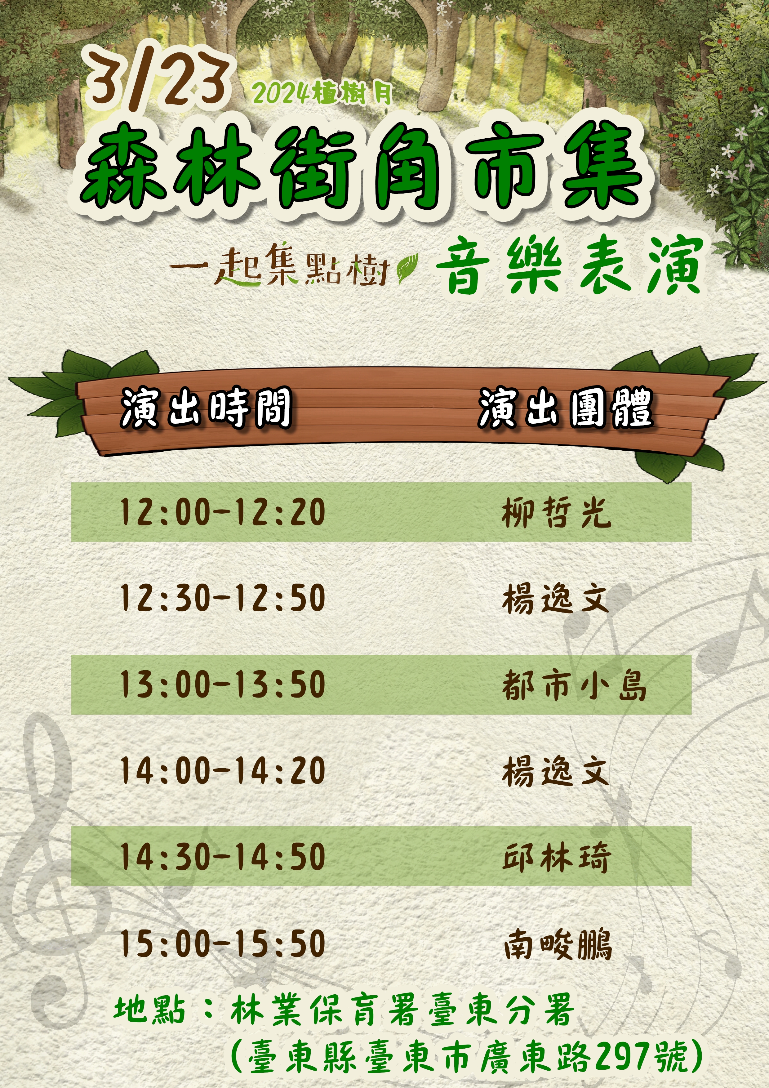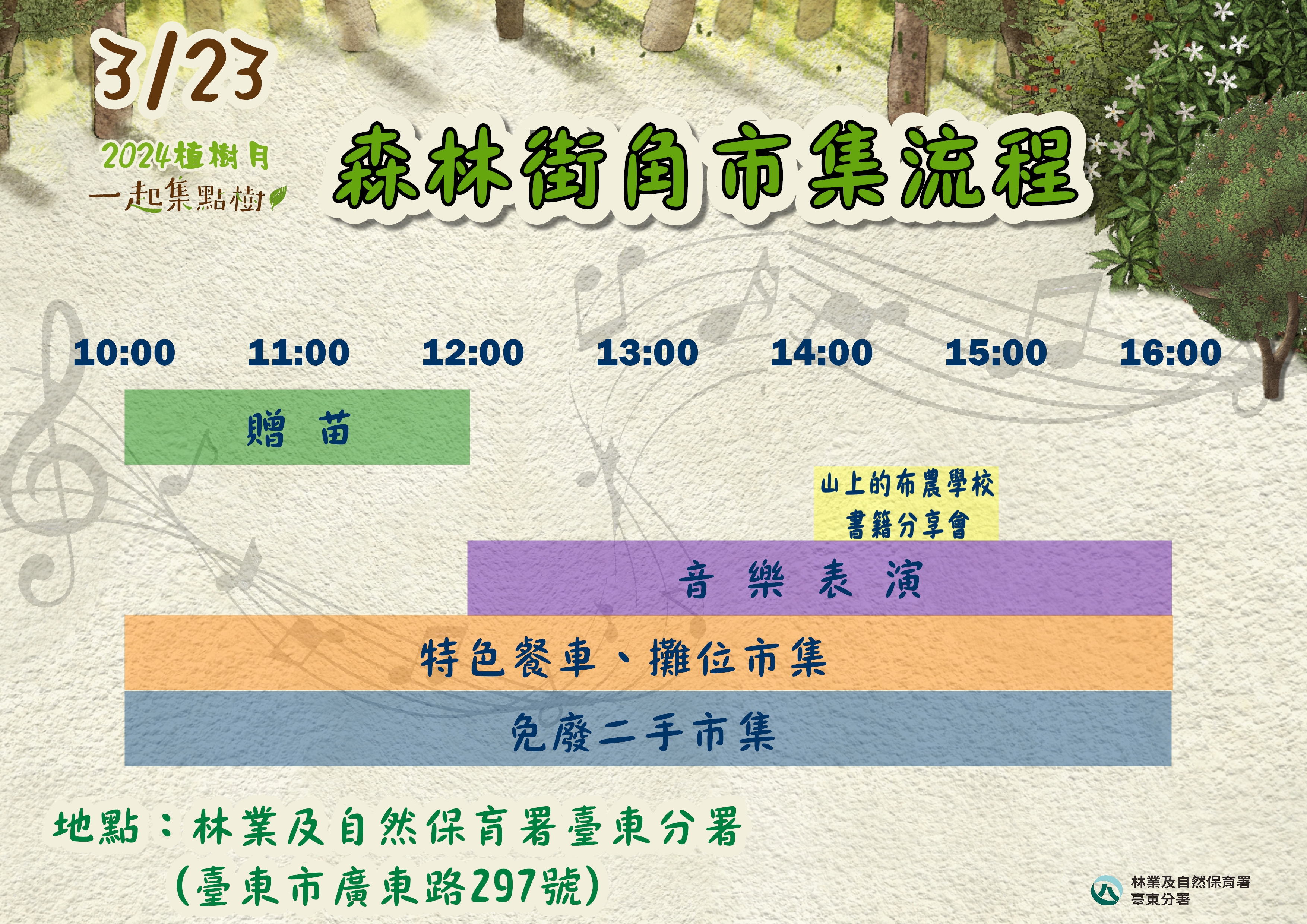 臺東分署誠摯邀請民眾前來參加森林街角市集也兌換苗木,一起用行動為地球集點樹,增加綠蔭也減低碳排放。貼心提醒領苗時請自備環保提袋或容器裝盛苗木,領取後也請盡速栽植,更多活動詳情請搜尋Facebook:林業及自然保育署臺東分署。