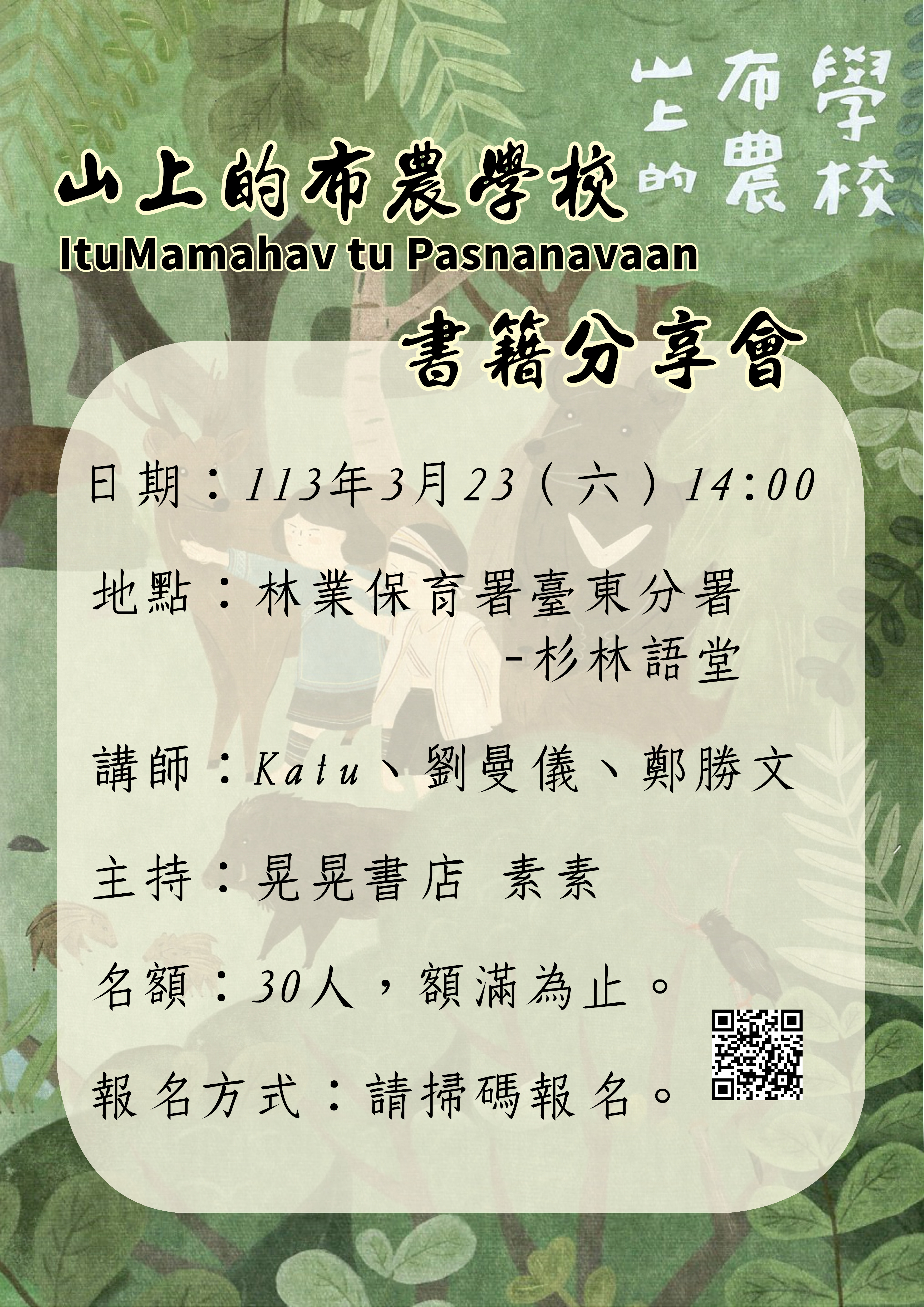 響應國際森林日,林業保育署臺東分署將於本周六(23)日上午10時至16時於辦公室停車場(臺東市廣東路297號)辦理全日豐富內容的森林街角市集活動。首先上場的是10-12時的公益贈苗,民眾可憑2張今年1-3月紙本發票兌換1株臺灣原生種樹苗,每次最多兌換5株不同種類苗木(可重覆排隊,數量有限,換完為止)。另為推廣雲端發票應用,財政部南區國稅局臺東分局也會於現場設攤,協助民眾透過雲端發票捐贈兌換苗木。當日於分署前庭的國產材木作空間「杉林語堂」將展出今年贈送的原生種苗木手繪圖,下午14時也與晃晃二手書店合作辦理1場「山上的布農學校」書籍分享會。另外,從早上10至16時也邀臺東特色餐車TTFoodCar東車軍與特色攤商現場設攤,並規劃一區讓民眾進行免廢交流物品,希望讓領苗的民眾,也可趁機逛市集、聆聽書籍分享會與享受悅耳的音樂表演,度過一個美好愉快的周末假期。