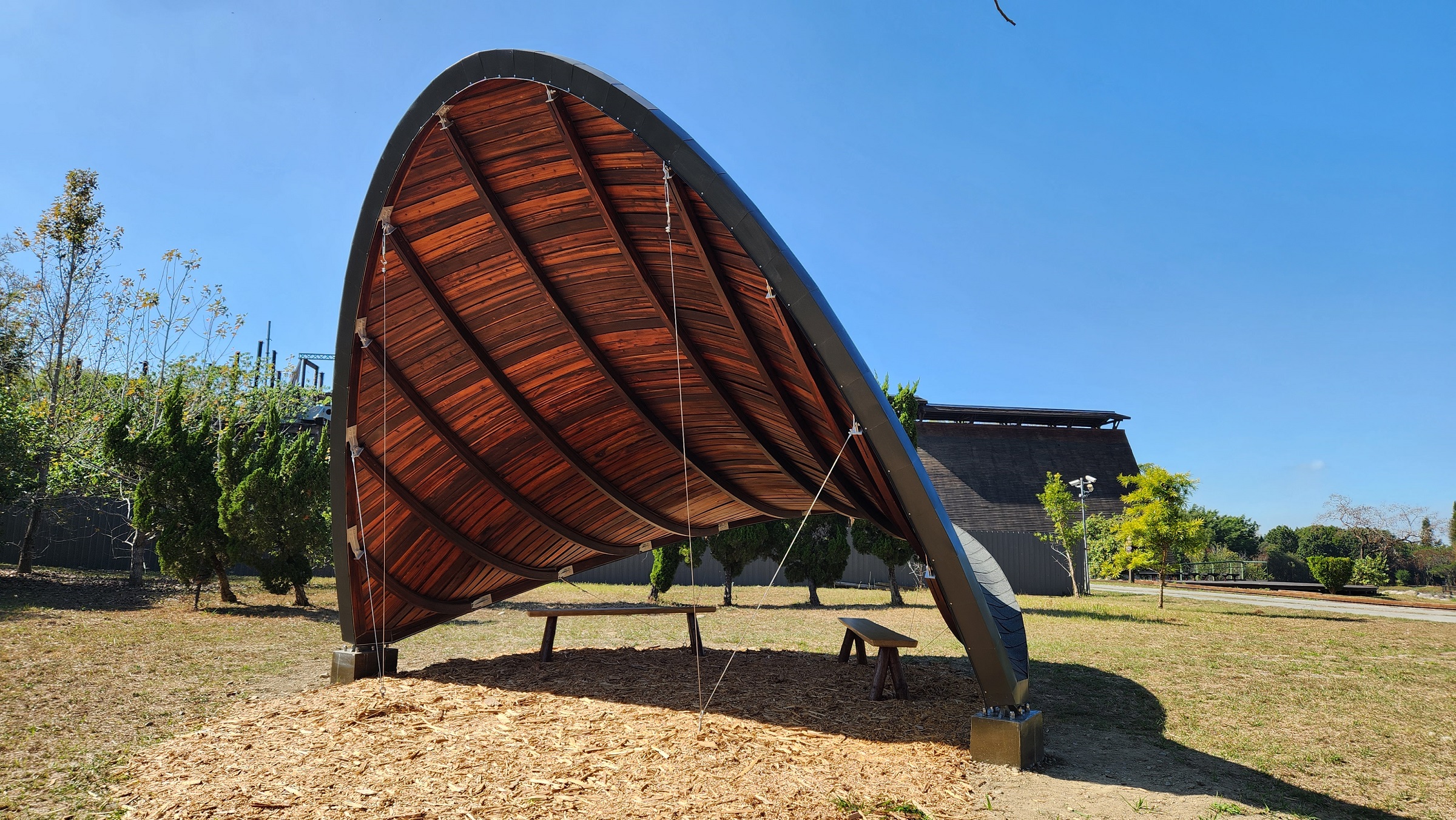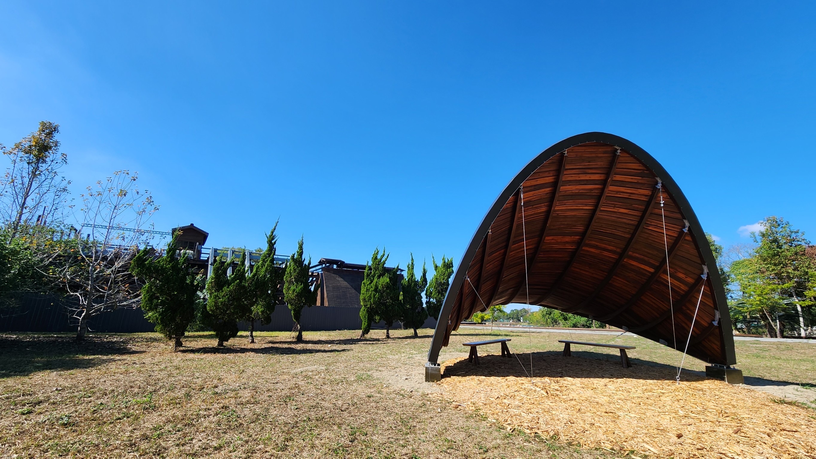 「弦閣」木構亭已於去(112)年底正式啟用,為一座直徑6公尺、高4公尺的木造結構體,流線的弧度造型展現木構的藝術風,搭配著貯木池及蔚藍的天空,已成為東勢林業文化園區的新地景,也是民眾拍照打卡的新景點。