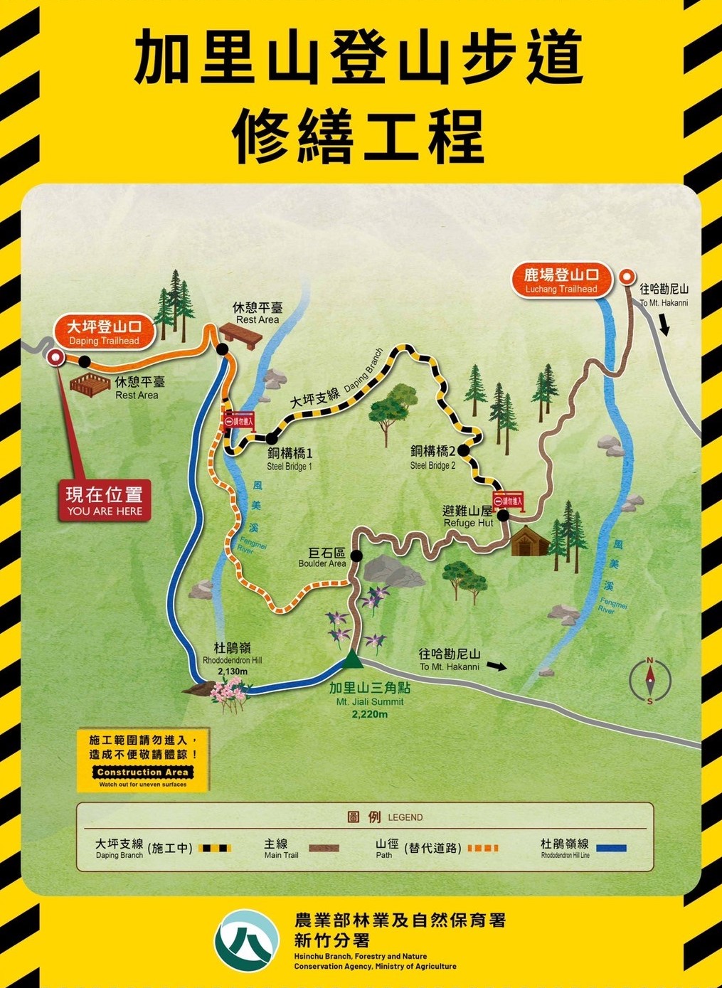為維護步道安全,林業及自然保育署新竹分署自113年3月4日起,辦理加里山登山步道「大坪支線」二座鋼構橋梁補強作業,因山區運送材料費時且施工困難,大坪支線至4月20日前暫停開放。提醒由大坪登山口進入山友,請遵循現場牌誌指示提前改道,由杜鵑嶺線步道或於大坪支線1.1k處繞行替代山徑登頂,另因改道及替代路線均較大坪支線陡峭,山友行進時務請留意自身體能及身體狀況。為維護登山安全,新竹分署提醒山友請勿進入封閉的施工區域,避免發生危險,如有相關問題可電洽林業保育署新竹分署電話:03-5224163 分機245 或 241。