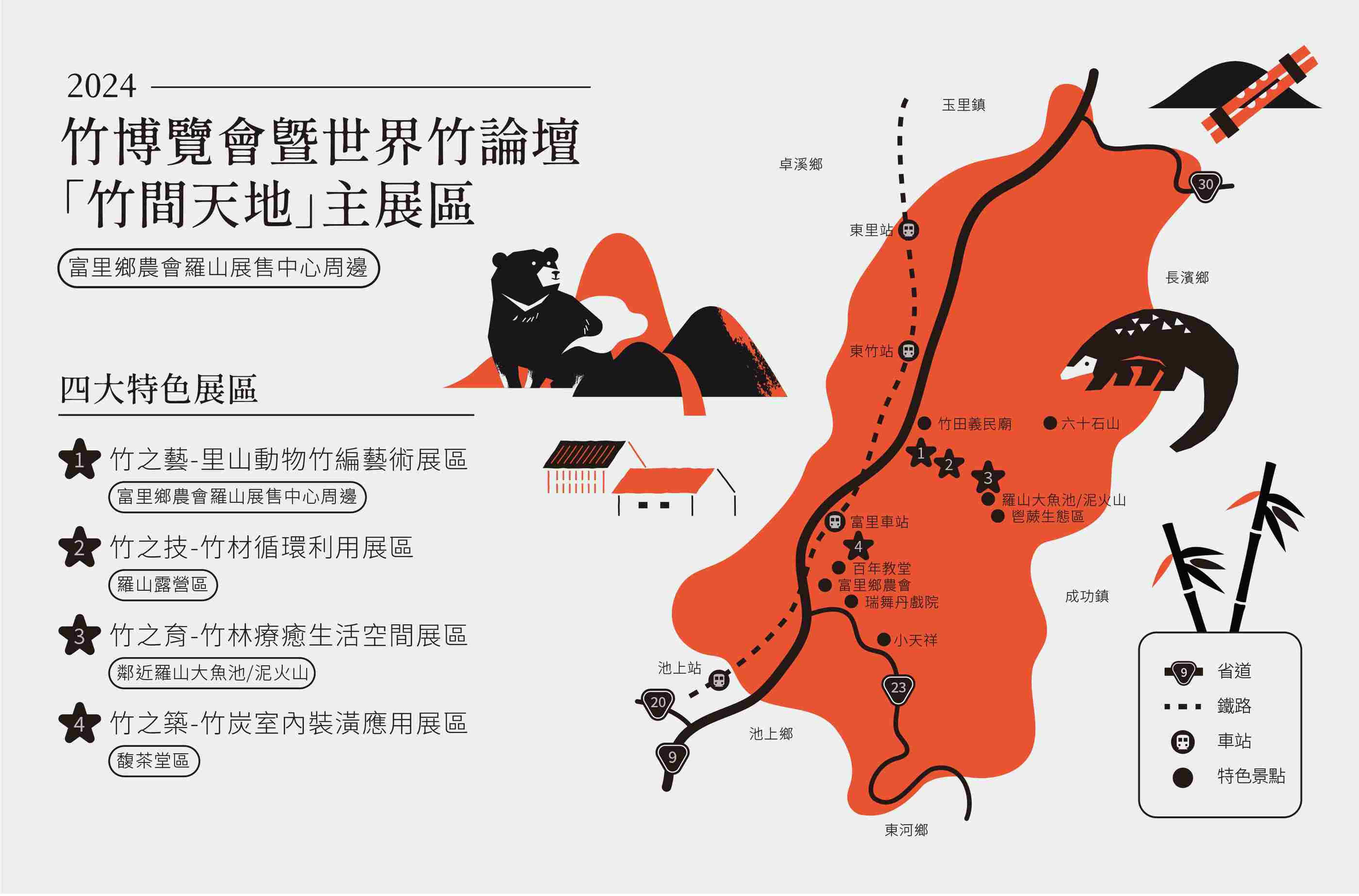 「竹間天地」主會場為里山動物竹編藝術展,邀請三位藝術家聯手打造,包括台灣黑熊、台灣狐蝠、石虎等大型竹編,融合農業循環利用和竹藝文化傳承,彰顯人地和諧精神。富里鄉農會同時擴大舉辦近年最受歡迎的特色活動—「稻草藝術季~動物迷蹤 稻翼之歌」,推出在地部落社區一系列令人驚喜的創意作品。