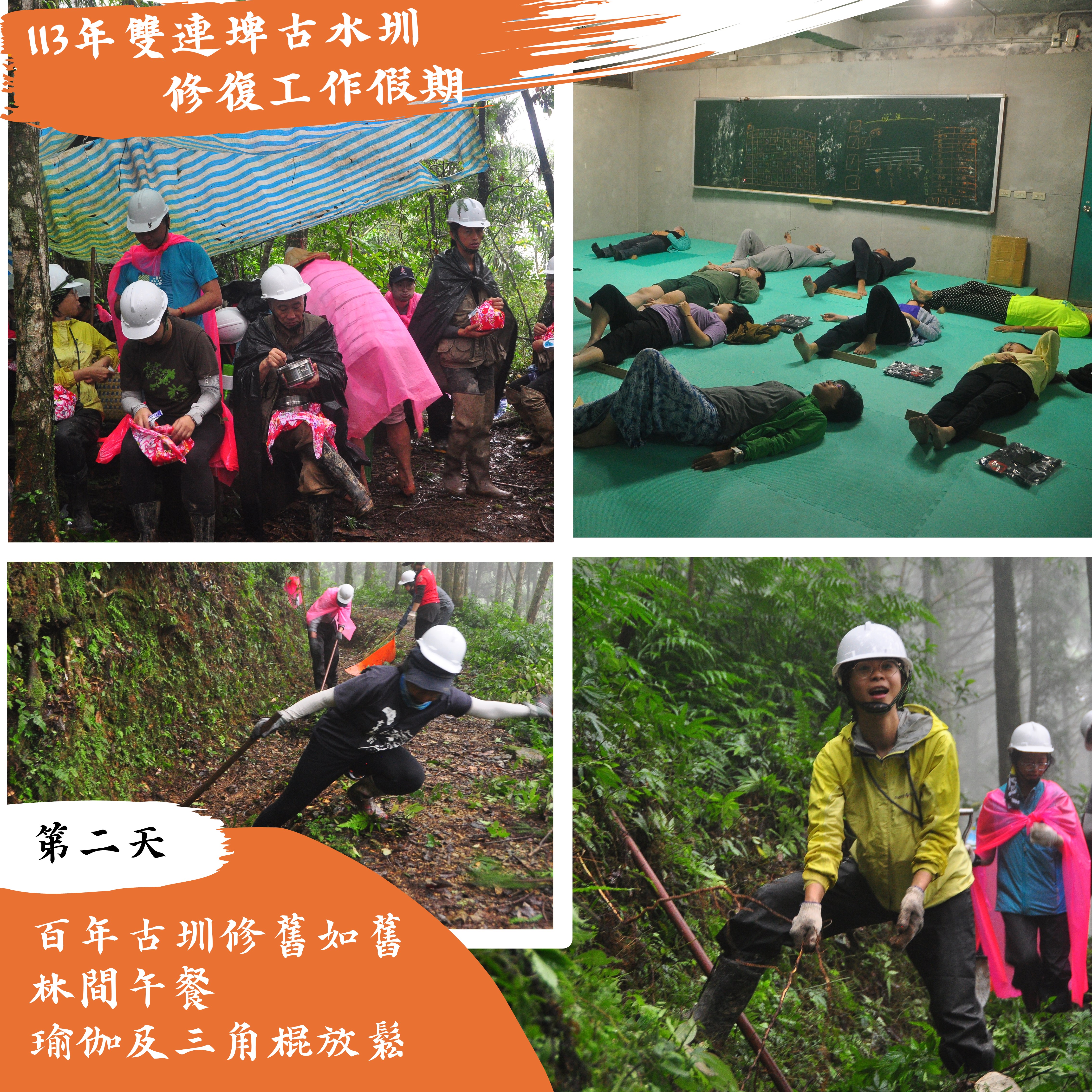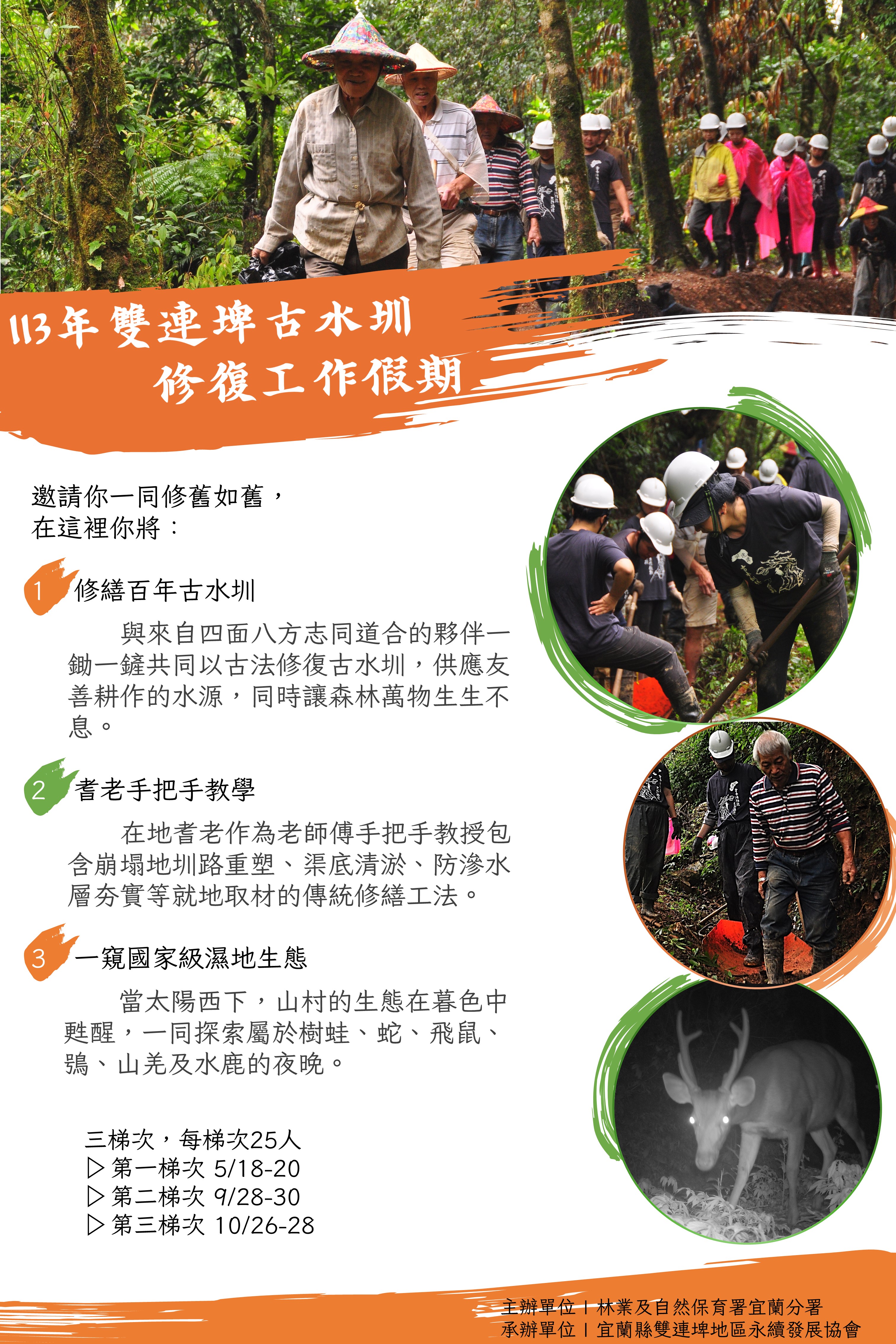 雙連埤同時為野生動物保護區、國家級重要濕地、蘭陽溪上游水源以及百年山村,是生態豐富且人文薈萃的寶地。此中有條百年古水圳,過去灌溉了村落連綿的水稻田,維繫雙連埤人世代的命脈。雖中斷約30年,近年來為促進雙連埤的友善農耕,林業及自然保育署宜蘭分署結合人禾環境倫理發展基金會、宜蘭縣雙連埤地區永續發展協會,以工作假期、在地點工的方式,持續進行古水圳的修復工作。 由終點向源頭持續邁進 古水圳長約六公里,橫跨了四個山頭水系,為先民們一鋤一鏟環山挖掘而成。古水圳引粗坑溪上游的水進入山村,灌溉了連綿的水稻田,並維繫了雙連埤人世代的命脈。過去為了維持水圳的運作,山村的居民每年農曆十月開始動起來,以「出公工」的方式——集眾人之力,完眾人之事——進行水圳的修繕。修築及修繕的過程,也留下許多就地取材、適地適用的工法與智慧,這些技法除了是雙連埤耆老們的共同記憶外,也是全民重要的文化資產。 本年度(113年)將辦理3梯次古水圳修復工作假期,第1梯次:113年5月18日至20日、第2梯次:113年9月28日到30日、第3梯次:113年10月28日到30日,活動時間皆為週六到週一(三天兩夜),在雙連埤古水圳修復工作假期中,會由在地師傅帶你走讀古水圳的人文歷史與生態環境,學習毀損的圳段因應地形、植披、土質的差異而運用的不同修繕工法,並且手把手帶你進行古水圳的修復。邀請你一起在雲霧繚繞的柳杉林中,跟著在地師傅的動作,一鋤一鏟修復古圳,找回生命之水!