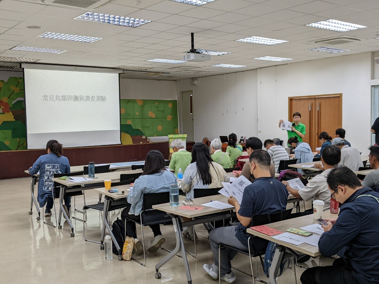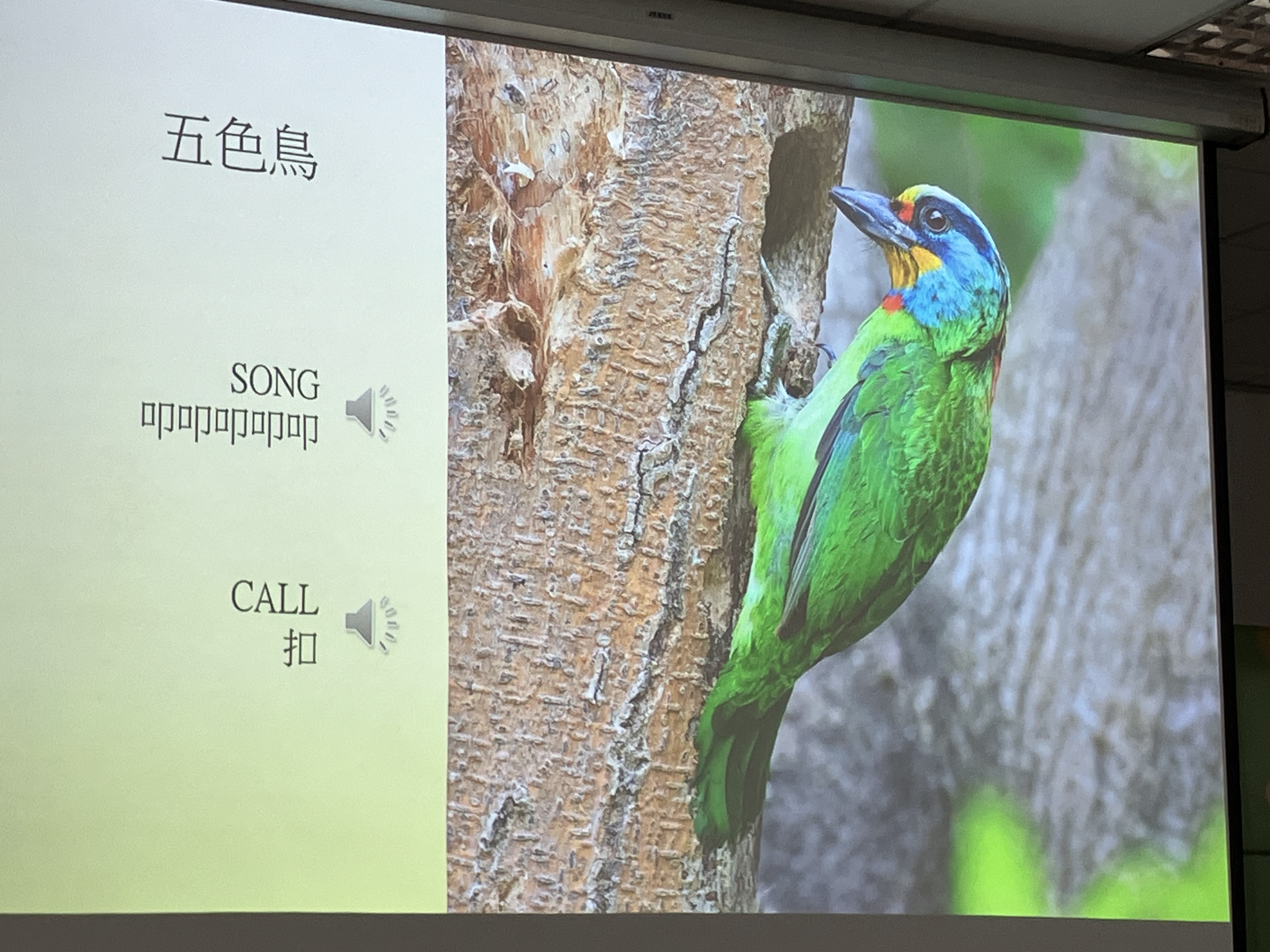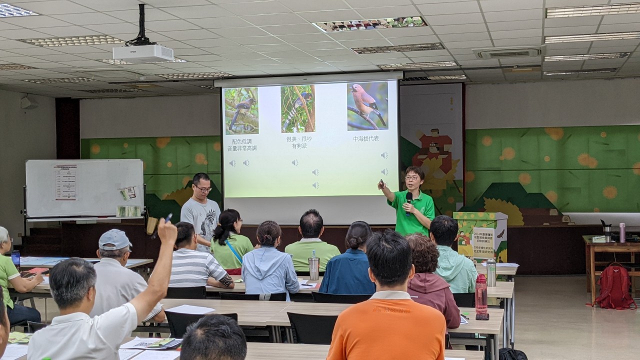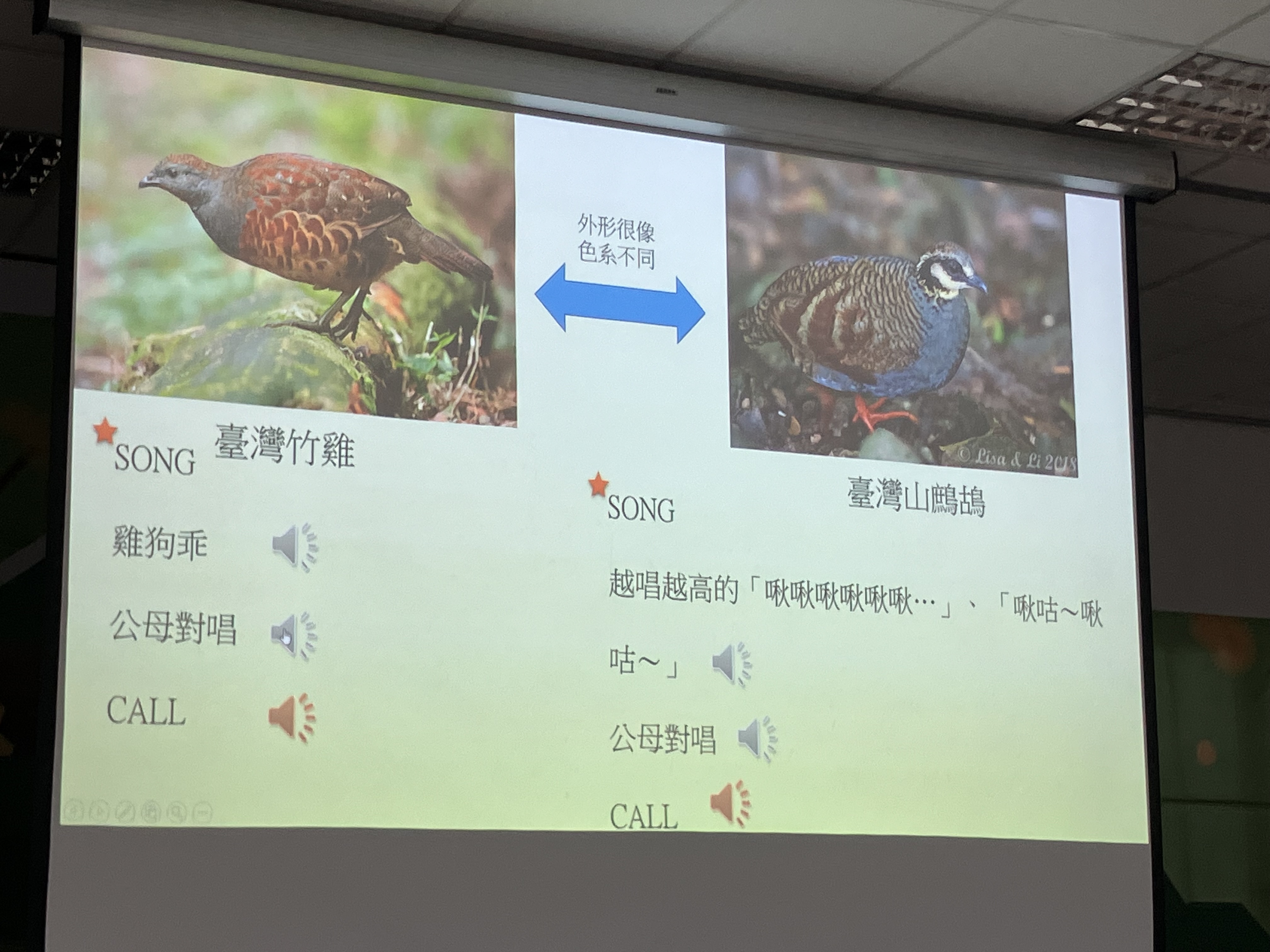 課程內容融合測驗的方式進行,同時運用相似物種間不同鳥音差異性的介紹,以及人工AI辨識鳥音軟體的介紹與運用,生物多樣性研究中心范孟雯副研究員透過不同的課程設計方式,帶動上課學員的注意力及參與度,也帶領學員進入到鳥類辨識的另一個門檻。在鳥音辨識介紹以相似物種依其差異來介紹,例如:低海拔台灣竹雞的「雞狗乖」與高海拔深山竹雞「啾啾啾啾啾啾…」、 「啾咕~啾咕~」,以及冠羽畫眉的「吐-米-酒」與白耳畫眉的「飛飛飛飛呀」,整體課程內容豐富生動又有趣。