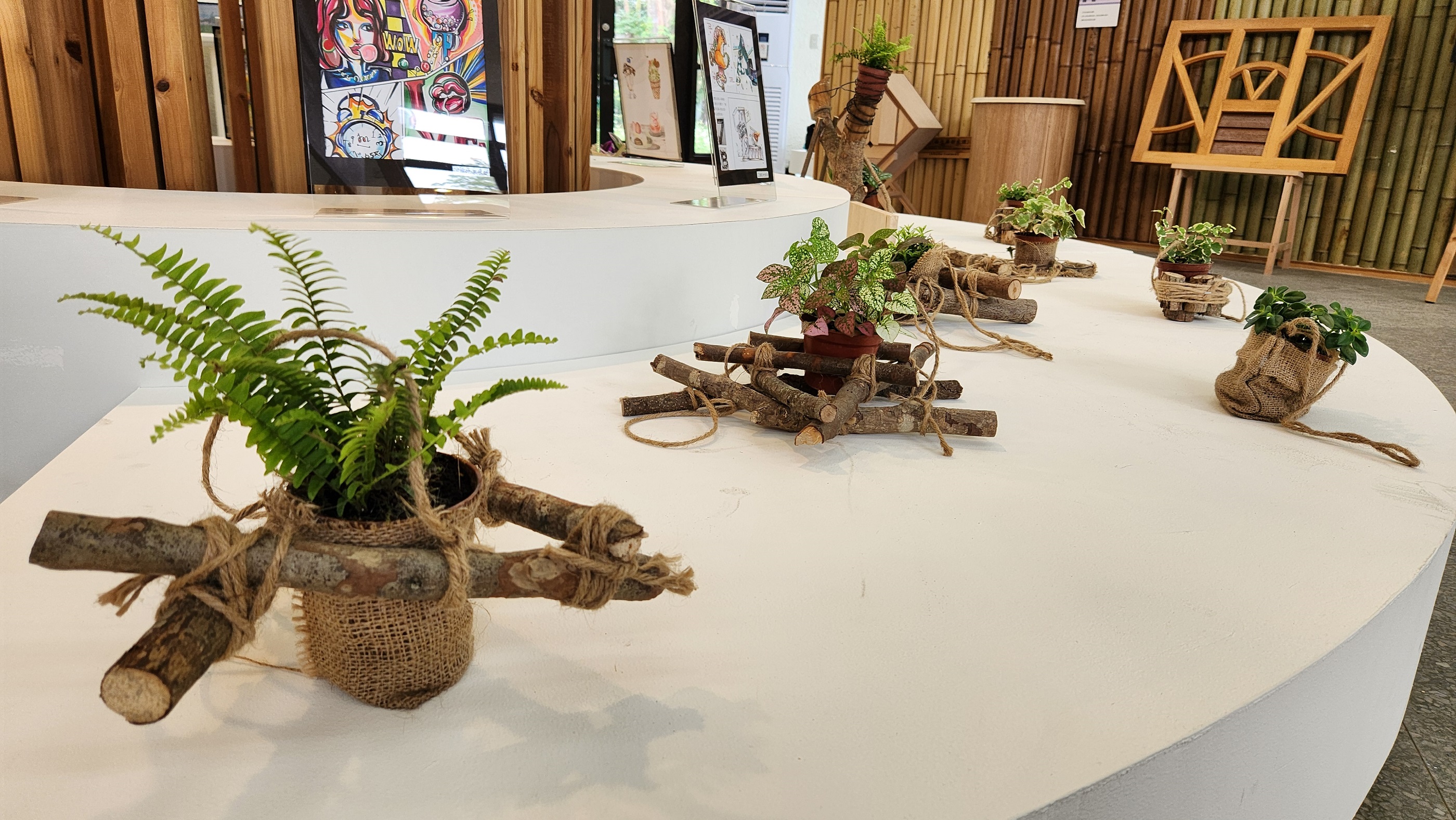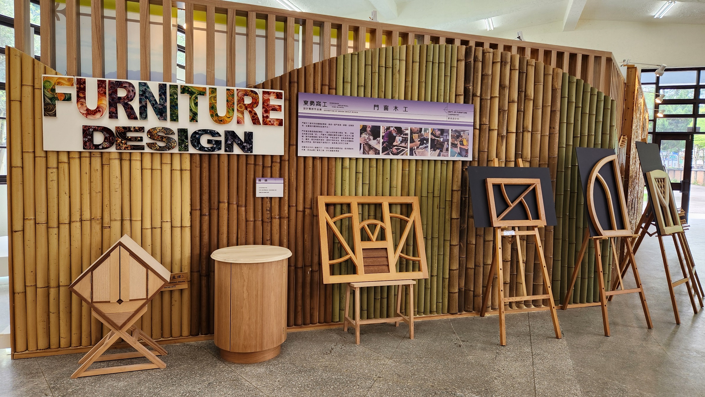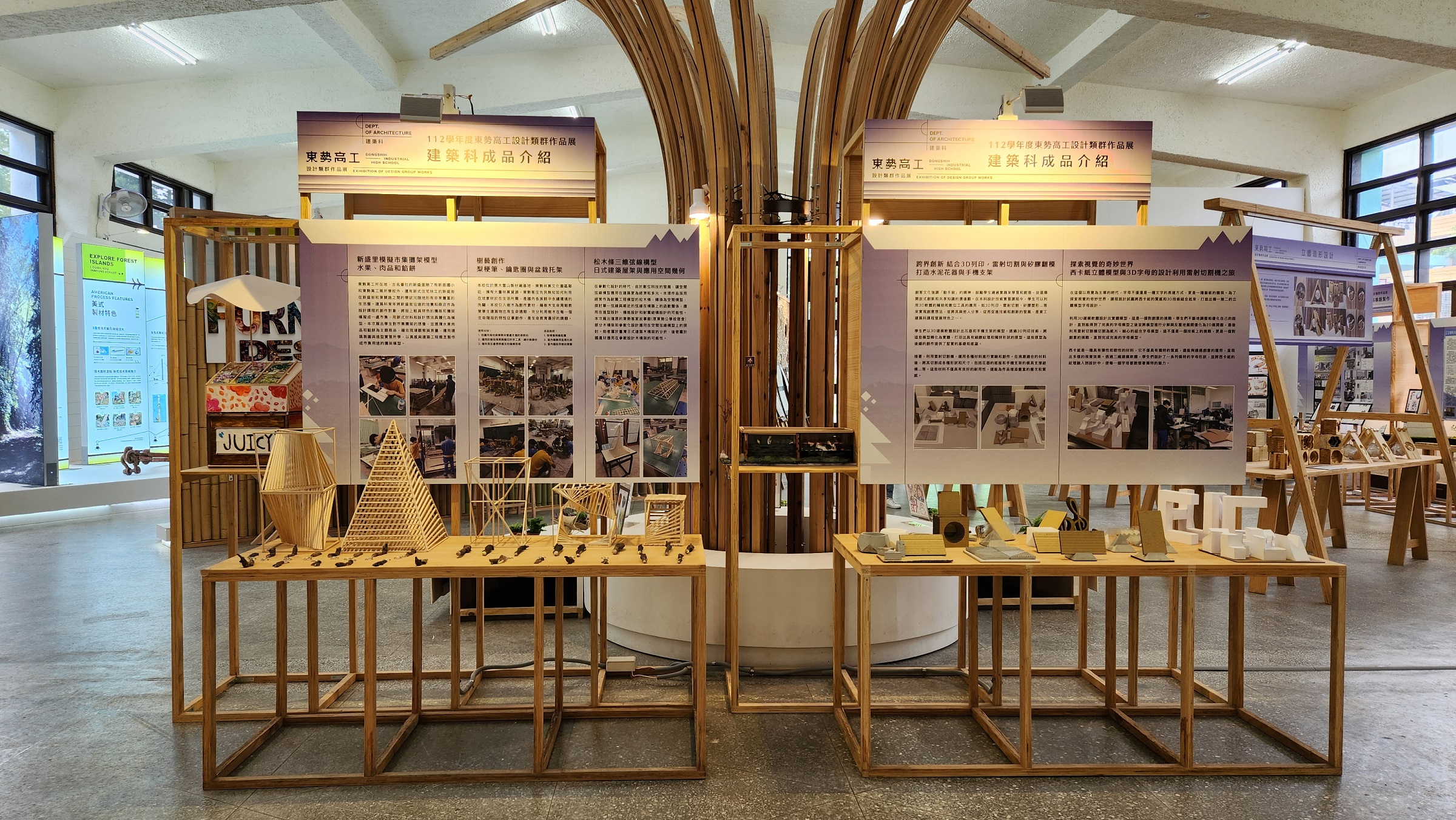 本次展覽作品涵蓋東勢高工三大設計群學生設計成果,「家具設計科」結合手工具、木工機械、榫接及數位化等木材加工技術,創作展示立體造形燈、不同材料特性色澤組合而成的家具,以及手機音箱等木創作品。「室內空間設計科」展現課程的多元化與精實訓練內容,其中專題實作「再續衣緣-二手服飾店」,以環保、永續的概念發想,設計一個提供二手衣捐贈或買賣的場域,傳達物盡其用、循環回收再利用理念,榮獲113年度全國高級中等學校專題製作比賽佳作的肯定。「建築科」則將林業資源與永續環境的設計融入實作課程,運用在地化素材做為創作元素,創作出樹木枝條小型盆栽托架、梨梗木藝品和三維視覺塑型等,充分展現學生永續設計和綠色設計的能力。