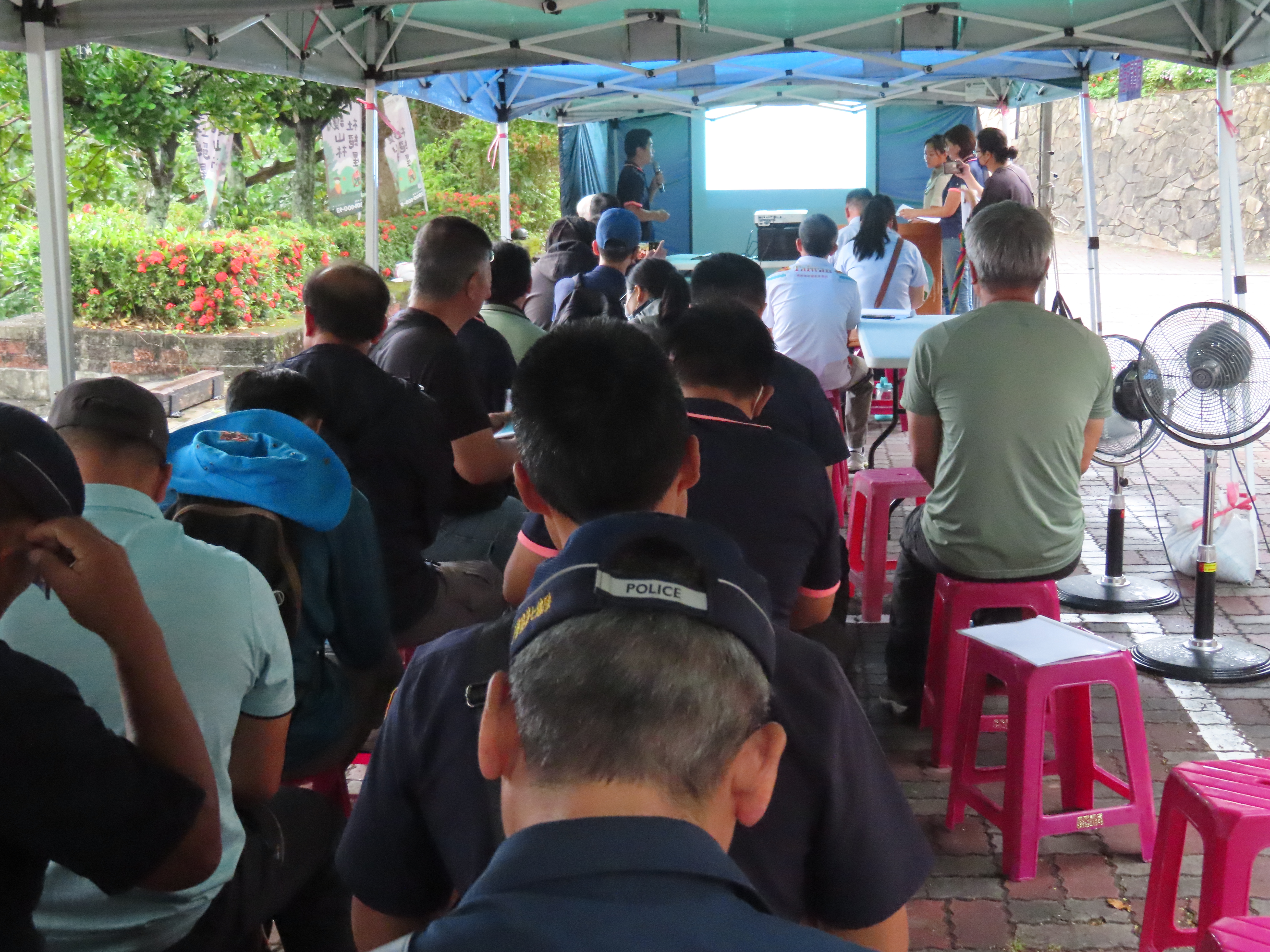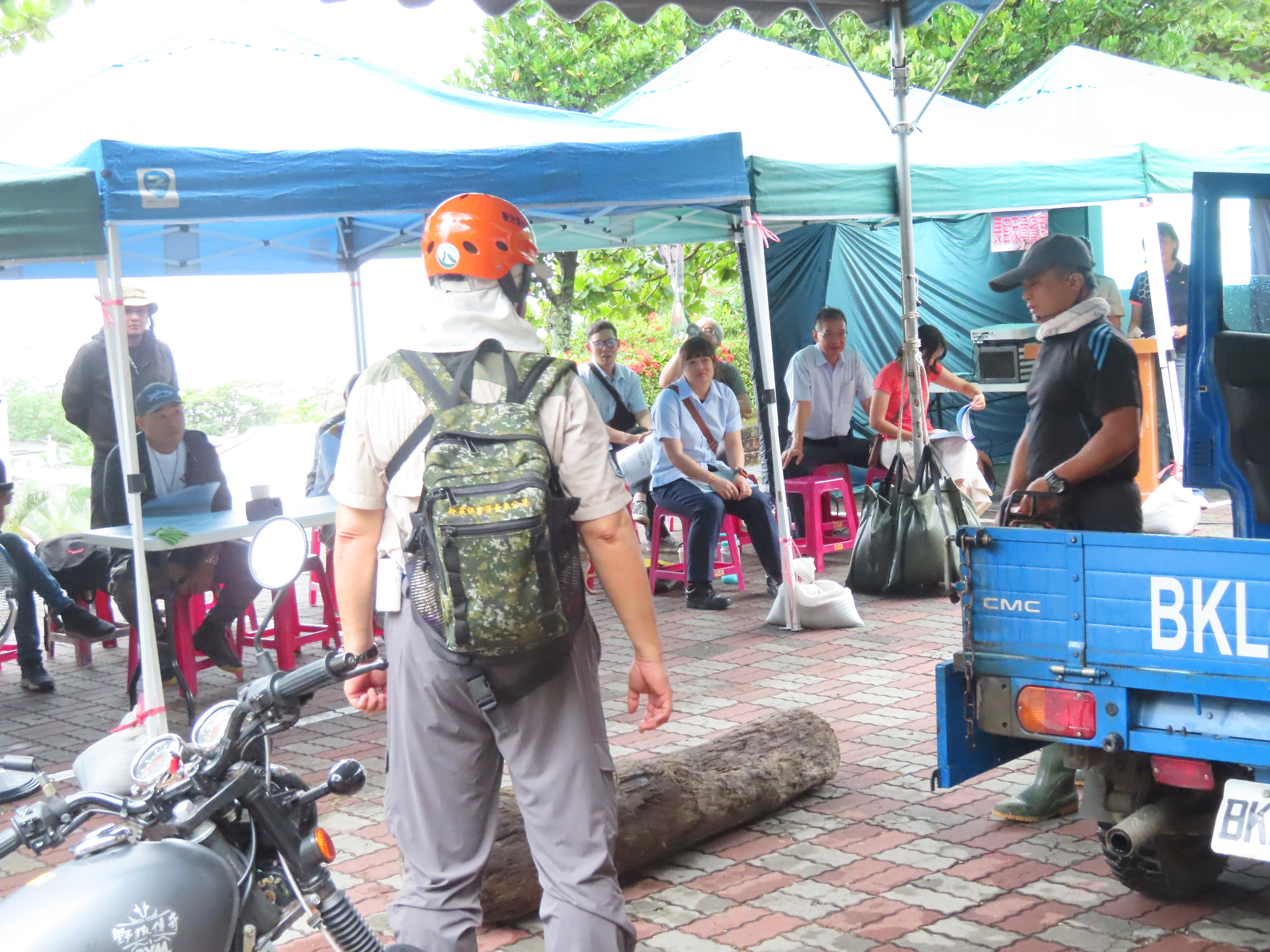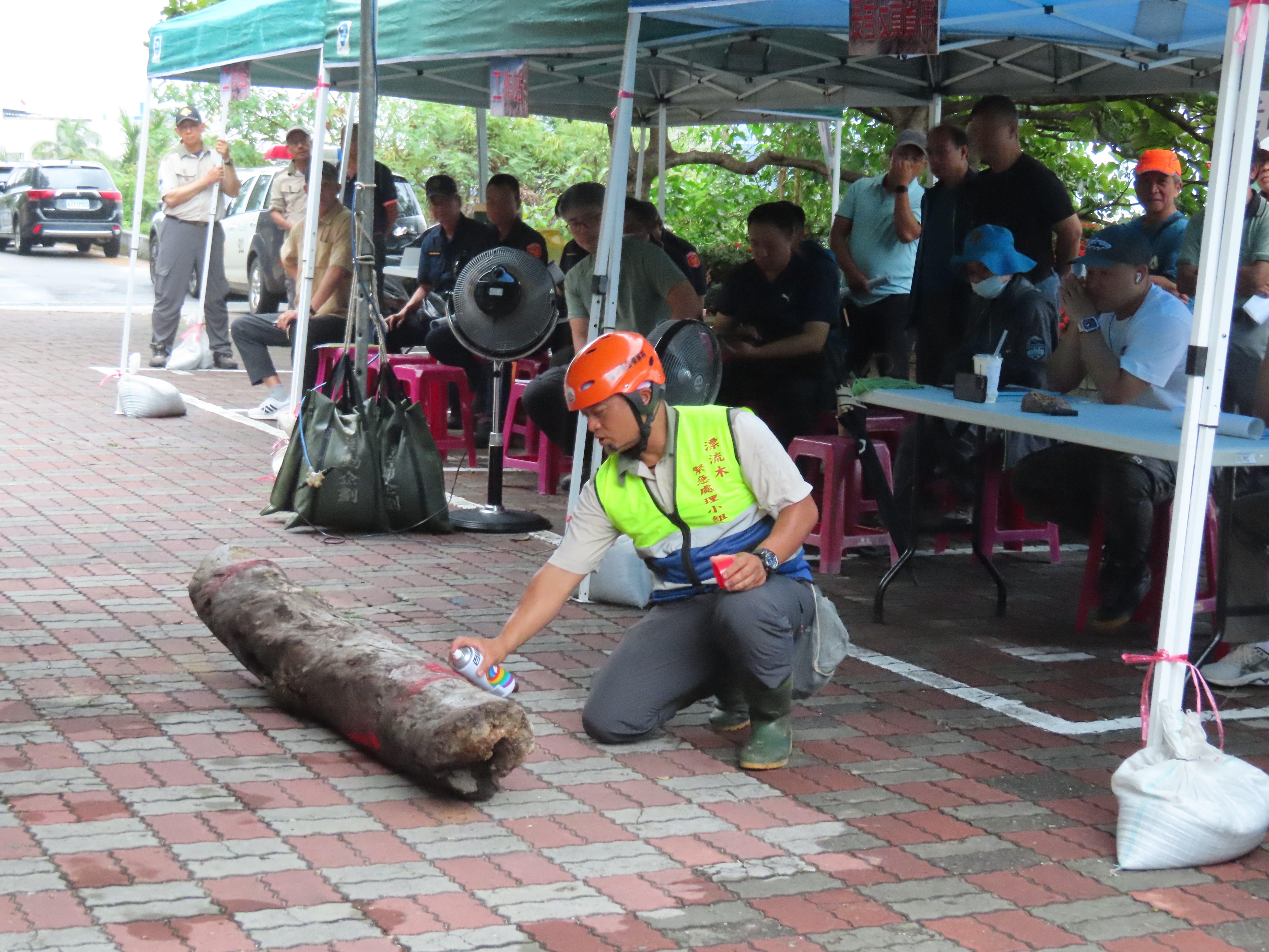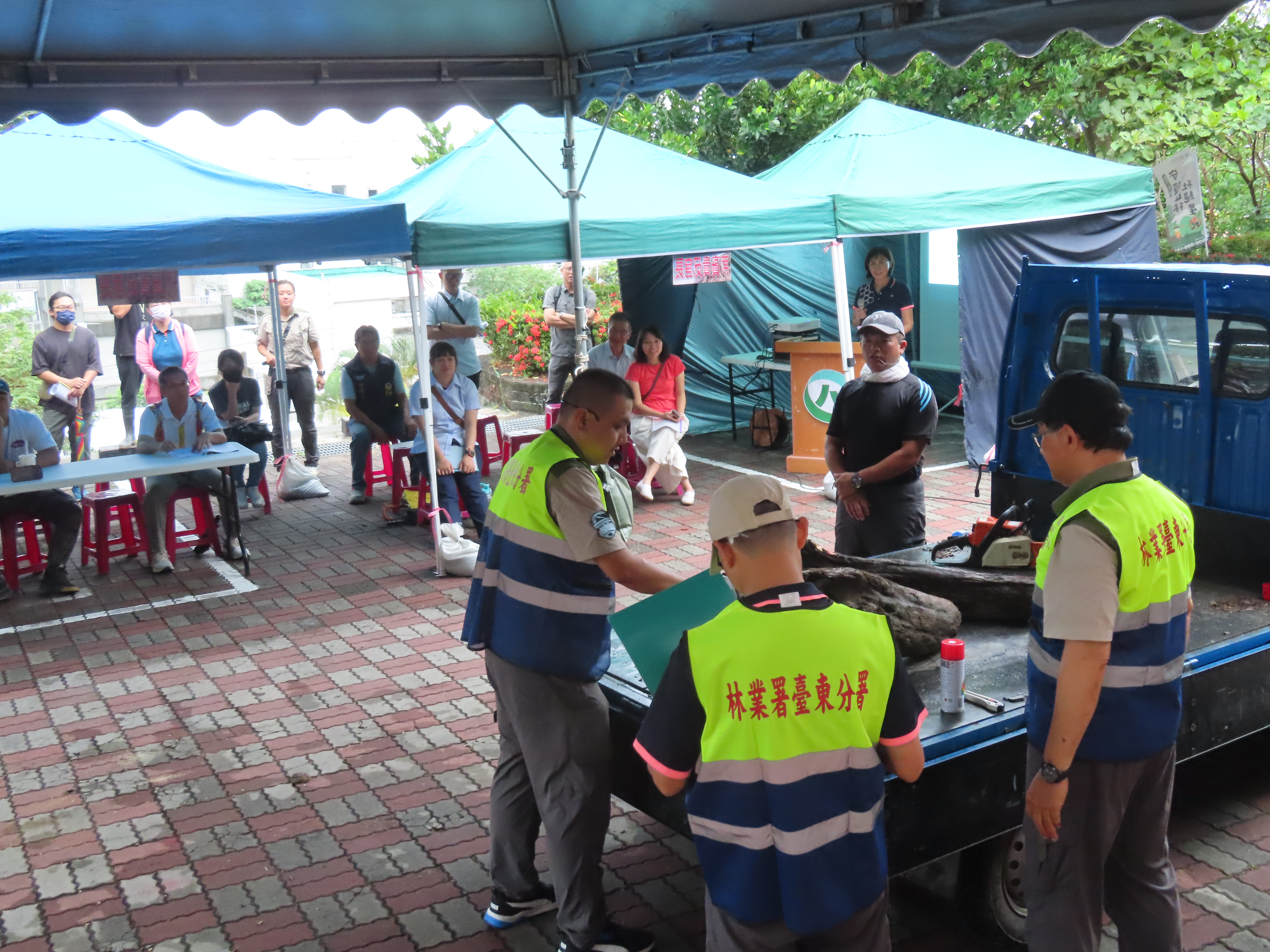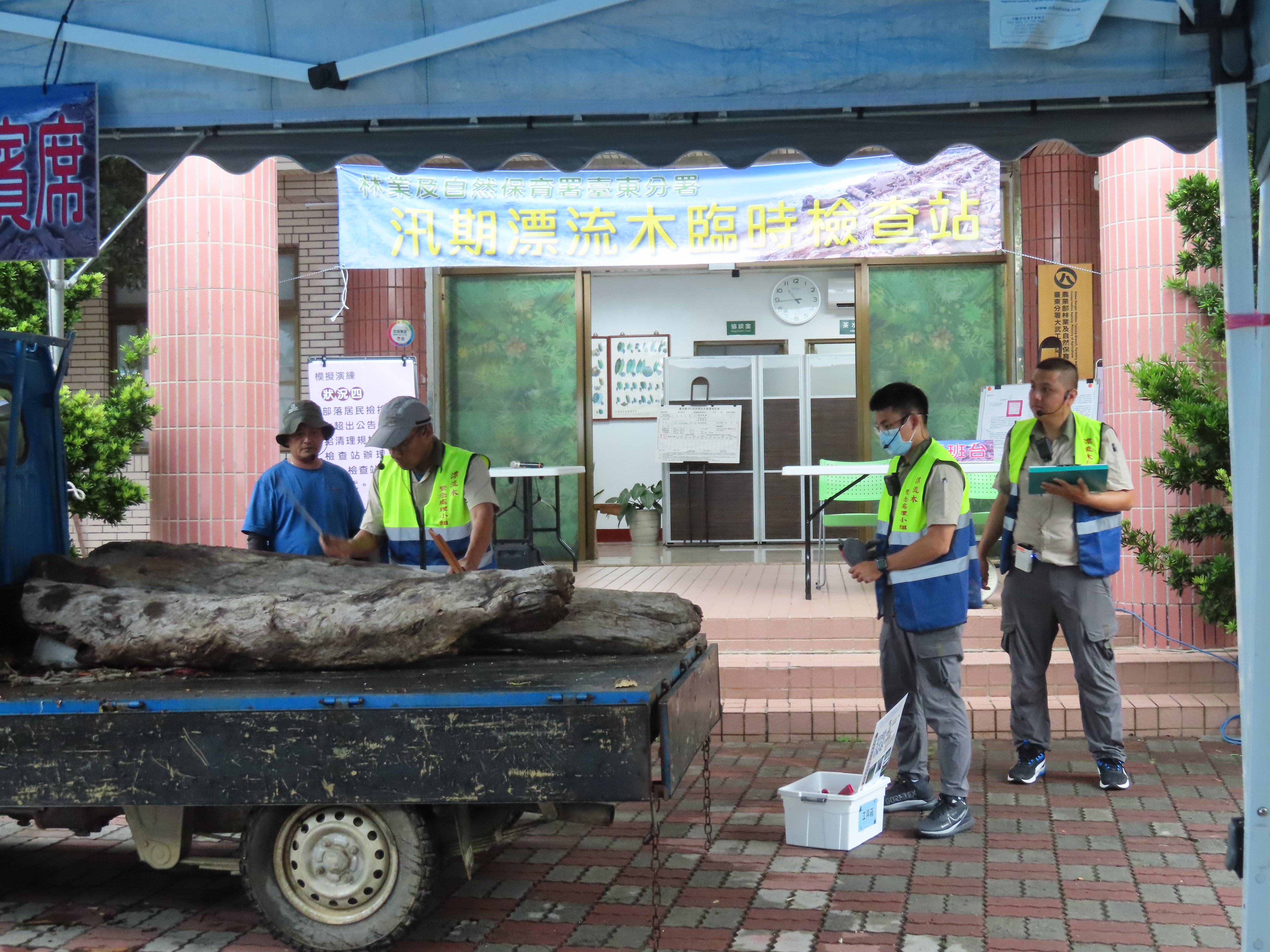 今(28)日上午臺東分署於轄下大武工作站站前廣場辦理漂流木檢查站演練,由工作站同仁扮演撿拾漂流木的民眾,模擬各式狀況提供各相關單位及工作站同仁都能熟悉漂流木辨識、檢尺及有無國公有註記之查驗流程,以因應即將到來的汛期發生漂流木處理需求;雖然天公不做美下起大雨,仍不影響內政部警政署保安警察第七總隊第九大隊、臺東縣政府、太麻里鄉公所、經濟部水利署第八河川分署、交通部觀光局東部海岸國家風景區管理處、海巡署東部分署第一三岸巡及本分署轄下各單位計56人仍共襄盛舉、全程參與演練。