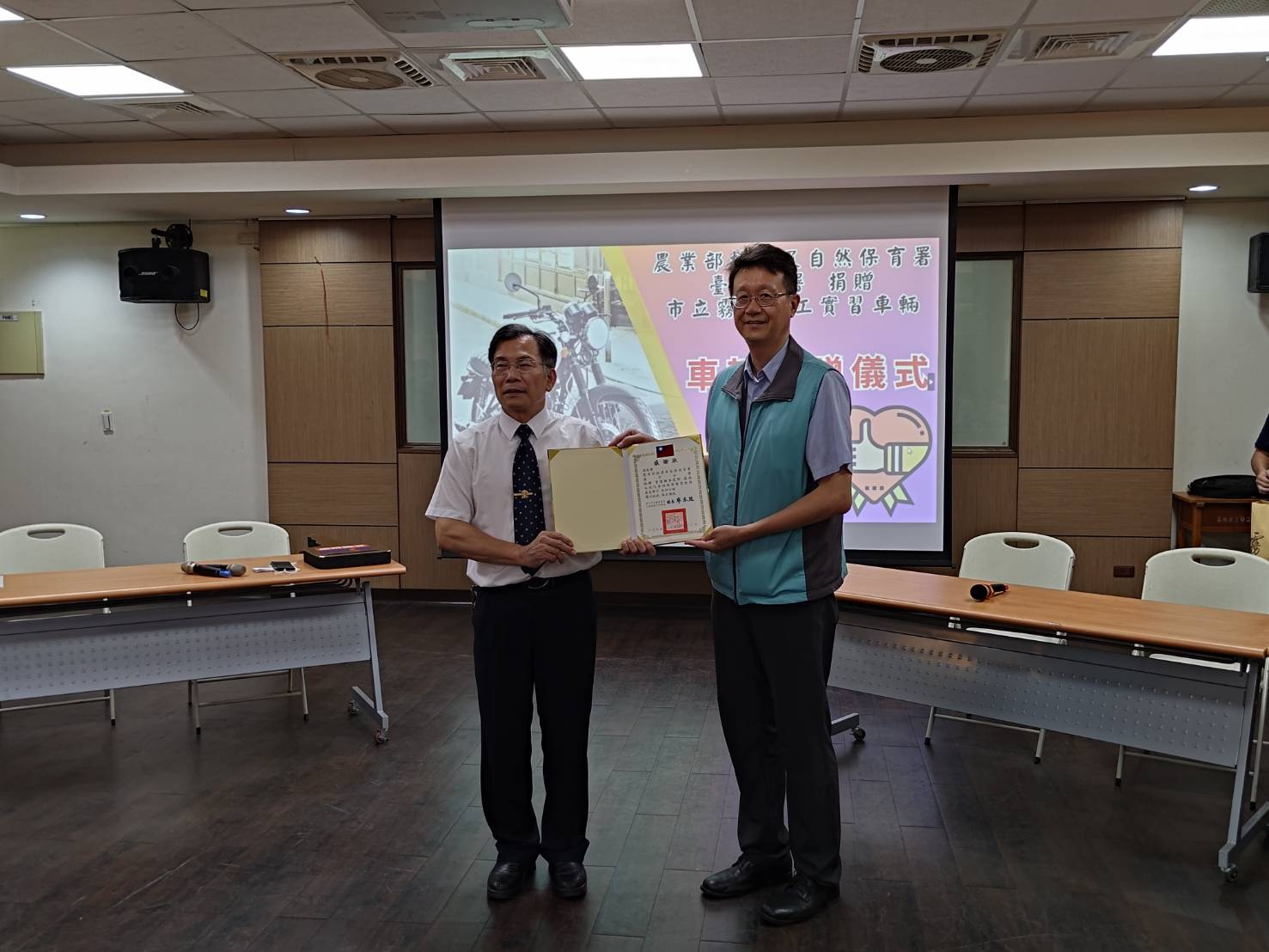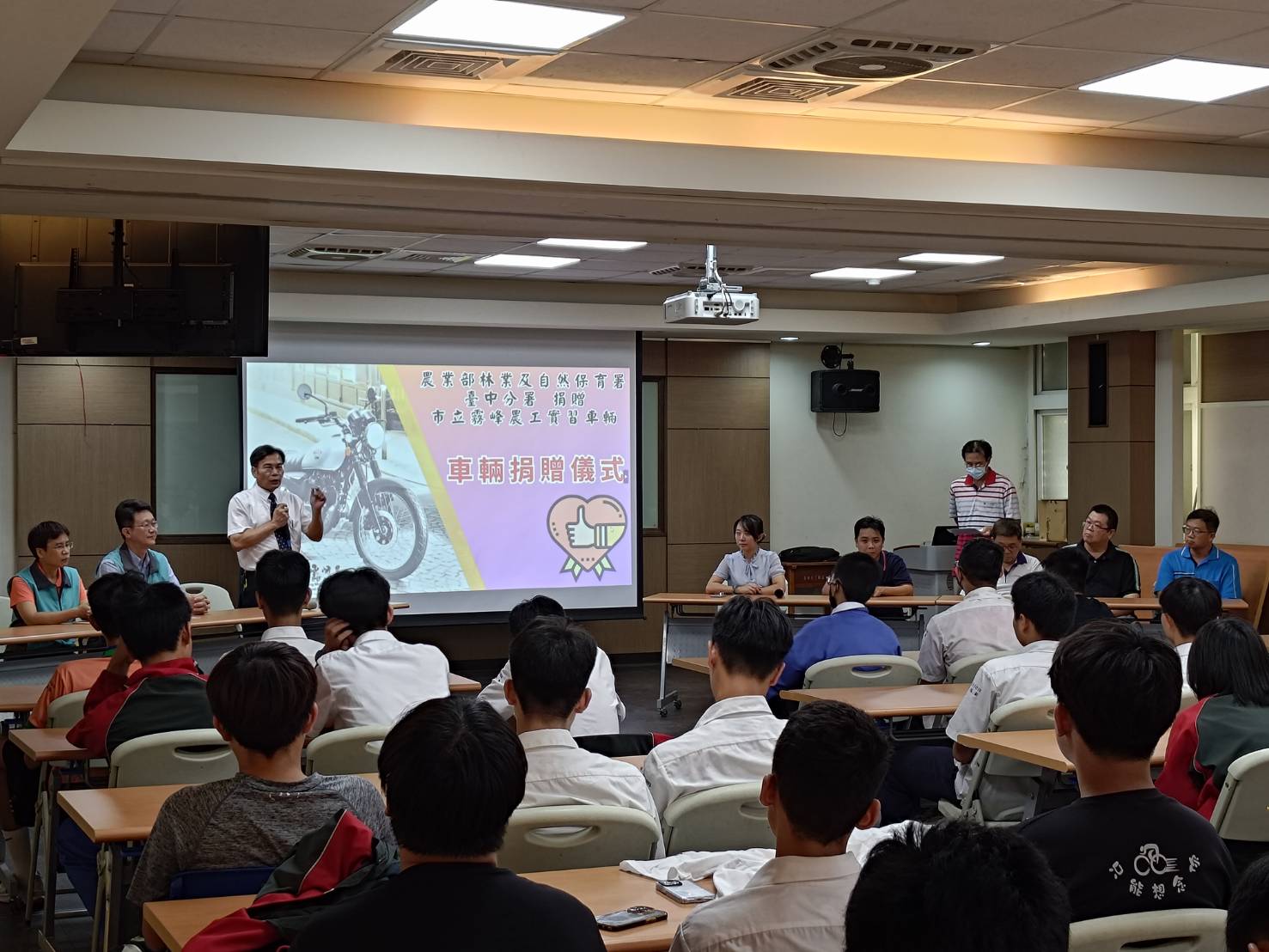 為珍惜及永續利用資源,林業及自然保育署臺中分署將2輛退役機車捐贈予臺中市立霧峰農業工業高級中等學校,供汽車科師生實作教學使用。這項捐贈不僅有助於學校技職教育的發展,也將林業及自然保育署環境永續發展的理念推廣到校園當中。 這次捐贈的2輛機車在退役前乘載著森林護管員們穿梭在山林之間,執行巡視林地、查緝違法盜伐案件、森林資源調查等各項任務,是第一線同仁們的最佳夥伴。如今從前線退役後,再為技職教育盡一份心力,提供霧峰農工汽車科師生進行拆解、裝修等實作課程,藉由實際操作驗證理論所學,在提升專業技能的同時,也達成了資源有效循環利用。 贈車儀式於昨(6/18)日下午辦理,由臺中分署副分署長陳啓榮與霧峰農工校長廖本廷、實習處主任江崇麟、汽車科主任吳旻儒及汽車科60位學生一同參與。臺中分署副分署長陳啓榮致詞時表示,巡山用的打檔車退役後,轉戰教育現場再利用,除了可成為重要的學習資源,讓學生們在實際的拆解與裝修操作中精進專業技能外,也能將資源循環利用的精神深植於學生心中,同時並鼓勵學生畢業後報考森林護管員,一起守護台灣山林。臺中分署進一步表示,未來將持續進行這類捐贈活動,嘉惠更多學子,並共同推動永續發展教育的理念。