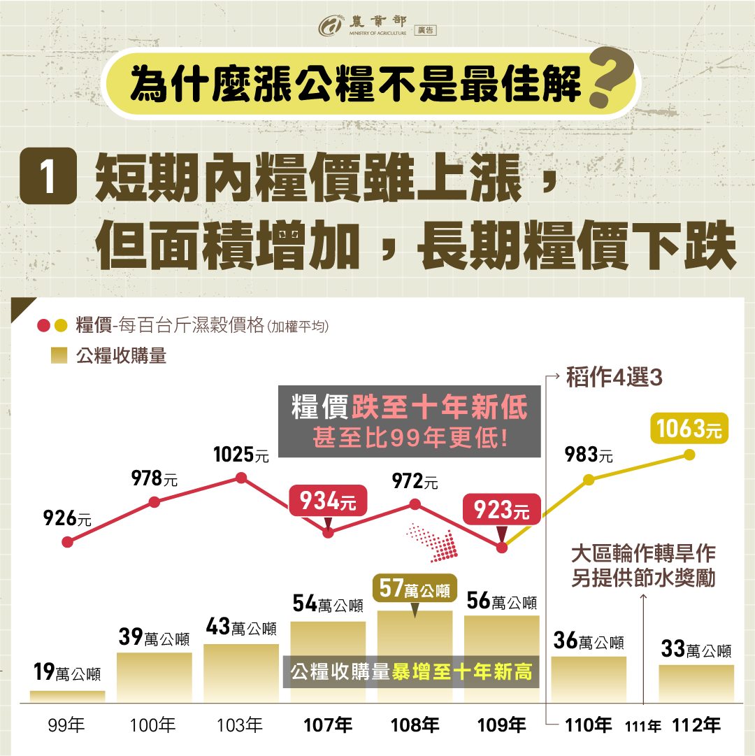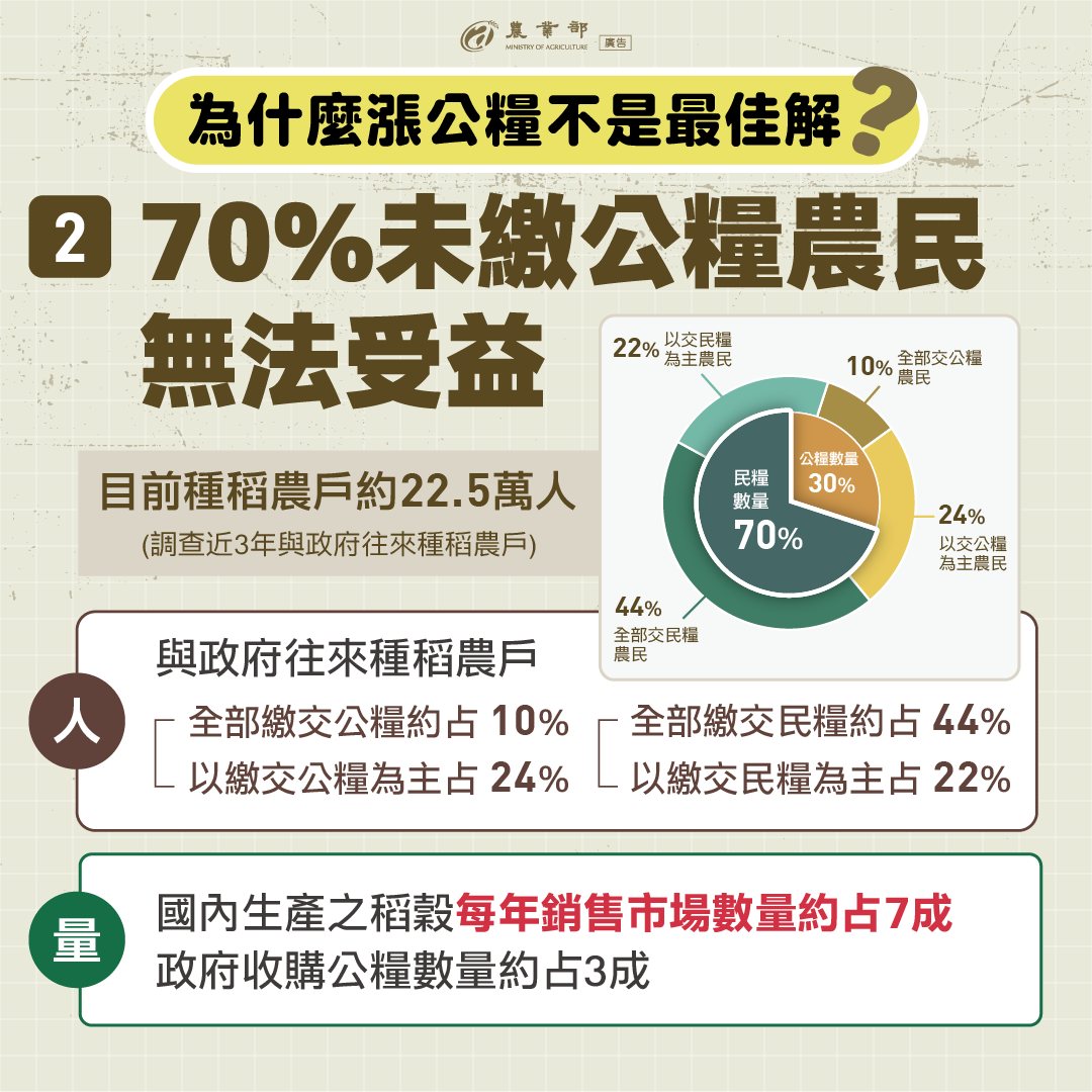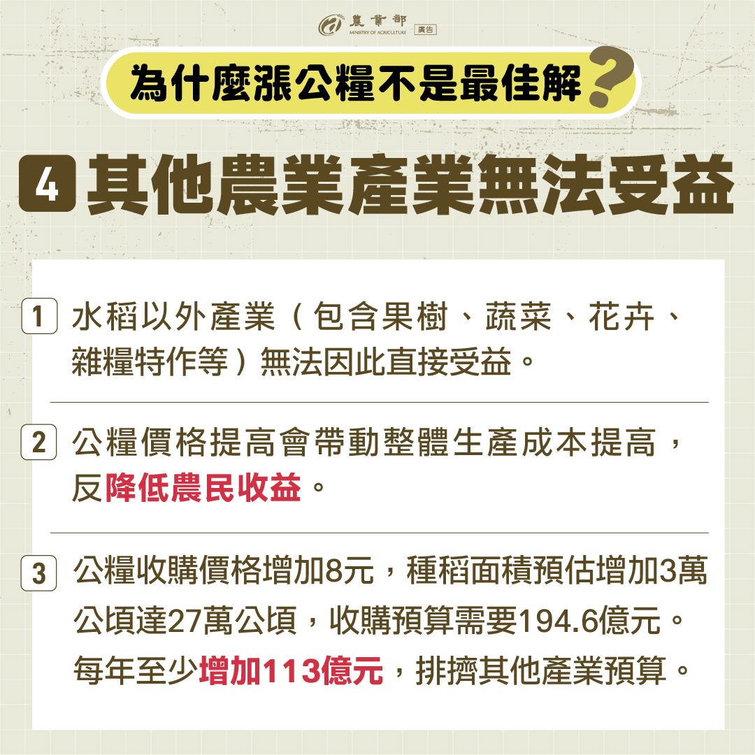 為什麼「漲公糧」不是最佳解?短期糧價上漲,但增產效果,長期下跌至低點民國100年調漲公糧,造成產銷失衡,不僅公糧收購量暴增,糧價也跌至10年新低。70%未繳公糧農民無法受益提升公糧收購價,#無法使全體農民受惠。帶動產業鏈成本上漲,農民收益被稀釋公糧收購價若升高,將連帶使整體產業鏈收購價格增加,#稻農收益反而會因生產成本提高而稀釋。其他產業無法受益非水稻類作物因公糧價格提高,生產成本也增加,農民實質收益減少。若公糧收購價增加8元,預估每年至少增加113億元。 更多消息請至農業部臉書專頁