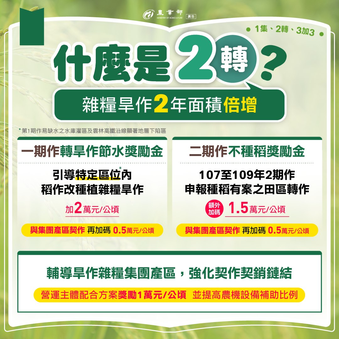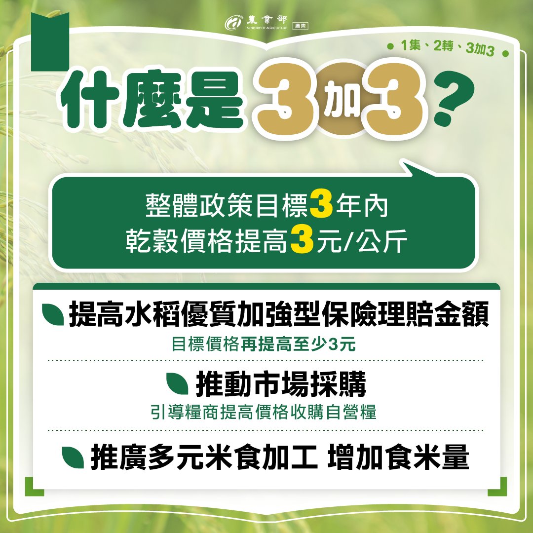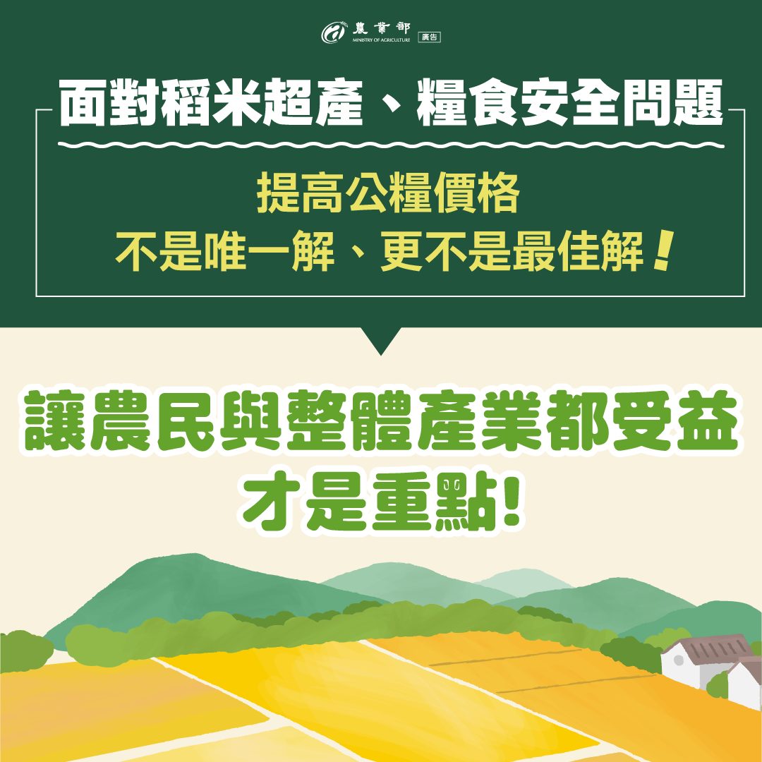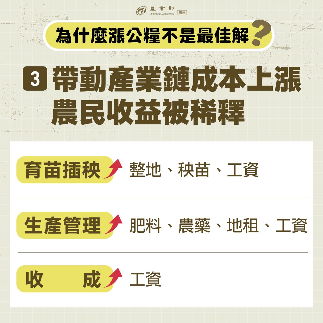 為什麼「漲公糧」不是最佳解?短期糧價上漲,但增產效果,長期下跌至低點民國100年調漲公糧,造成產銷失衡,不僅公糧收購量暴增,糧價也跌至10年新低。70%未繳公糧農民無法受益提升公糧收購價,#無法使全體農民受惠。帶動產業鏈成本上漲,農民收益被稀釋公糧收購價若升高,將連帶使整體產業鏈收購價格增加,#稻農收益反而會因生產成本提高而稀釋。其他產業無法受益非水稻類作物因公糧價格提高,生產成本也增加,農民實質收益減少。若公糧收購價增加8元,預估每年至少增加113億元。 更多消息請至農業部臉書專頁