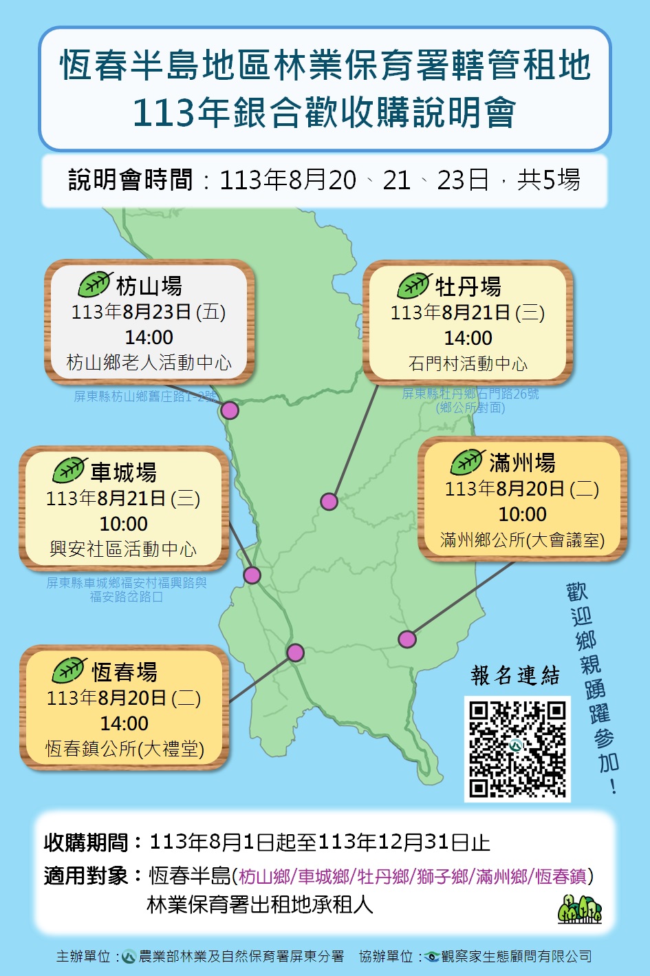 林業保育署屏東分署預定於8月20、21及23日三天,緊鑼密鼓在恆春半島辦理5場「113年度林業保育署轄管出租地銀合歡收購說明會」,就恆春半島銀合歡對生態的危害、移除銀合歡及收購流程等進行意見交流,希望更多民眾能關注外來入侵種的影響,以行動參與移除工作,控制銀合歡擴散。 行政院核定「外來入侵種埃及聖䴉、綠鬣蜥與恆春半島銀合歡移除及復育計畫(112-113年)」,國公有土地部分由各機關編列經費執行移除及控制,私有(包括林業保育署及國有財產署出租地)部分,則以收購方式鼓勵民眾移除。今年度收購計畫實施期間自7月10日起至12月31日止,屏東分署預計收購國有林出租地銀合歡750公噸,後續並視申請情形調整收購噸數。 經過去年第一年執行後,屏東分署就執行過程發現的問題進行滾動式修正,希望將銀合歡收購作業流程調整的更趨完備減少爭議,收購費用仍維持未破碎每公噸14000元,為使113年計畫順利推行,故舉辦本次說明會,以詳細說明收購申請作業流程與注意事項。 接續去年在獅子鄉辦理的第一場銀合歡收購說明會,屏東分署今年預計在恆春半島其餘5個鄉鎮辦理地方說明會,分別是8月20日在滿州鄉公所、恆春鎮公所;8月21日在車城鄉興安社區活動中心、牡丹鄉石門村活動中心;8月23日在枋山鄉老人活動中心,有意願或仍不了解的可自由選擇方便的場次前往參加瞭解,報名網址 https://reurl.cc/ad5m5Z ,事先報名成功者現場備有小禮物唷!