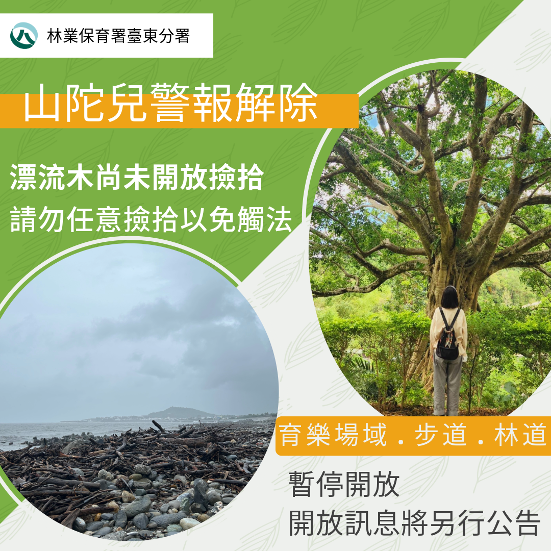 山陀兒颱風已於今(4)日清晨5時30分解除警報,警報期間臺東地區降下超大豪雨,太麻里及知本山區連日累積雨量超過一千毫米,臺東海岸地區堆積一定數量漂流枝梢材,由於113年8月1日發布之凱米颱風過後開放漂流木自由撿拾公告已失效,臺東分署呼籲,在該分署與臺東縣政府尚未發布山陀兒颱風公告自由撿拾公告前,民眾切勿撿拾以免觸法。 臺東分署指出,臺東地區在山陀兒颱風警報解除後,在海岸地區發現漂流枝梢材堆積,且部分漁港也漂進少量枝梢材,相關清理工作將分別由權責管理機關進場執行清理工作;臺東分署表示,該分署將立即啟動漂流木調查工作,儘速完成具標售價值及貴重木進行辨識、註記及集運,並將與臺東縣政府確認後,同步公告山陀兒颱風後開放自由撿拾時間,請臺東在地民眾留意相關公告。臺東分署藉此呼籲民眾在未公告開放撿拾前,切勿撿拾以免觸法,如民眾發現有不法情事,請撥打24小時通報專線臺東縣民專線1999、林業及自然保育署0800-000-930或撥打110通報。 此外,因颱風警報解除後山區天候仍不穩定,為確保遊客安全,臺東分署將暫停開放轄內知本國家森林遊樂區,以及轄管各步道包括嘉明湖國家步道(含向陽山屋及嘉明湖山屋)、紅石步道、安通越嶺古道東段、麻荖漏步道、都蘭山步道、綠島觀海步道、綠島阿眉山步道、鯉魚山步道、大武觀海步道、浸水營國家步道東段及林道(知本林道、利嘉林道、延平林道、紅石林道、錦屏林道、霧鹿林道),並進行颱風後巡檢及環境整備,後續開放資訊請關注該分署官網、台灣山林悠遊網(http://recreation.forest.gov.tw/)及臉書粉專最新訊息。