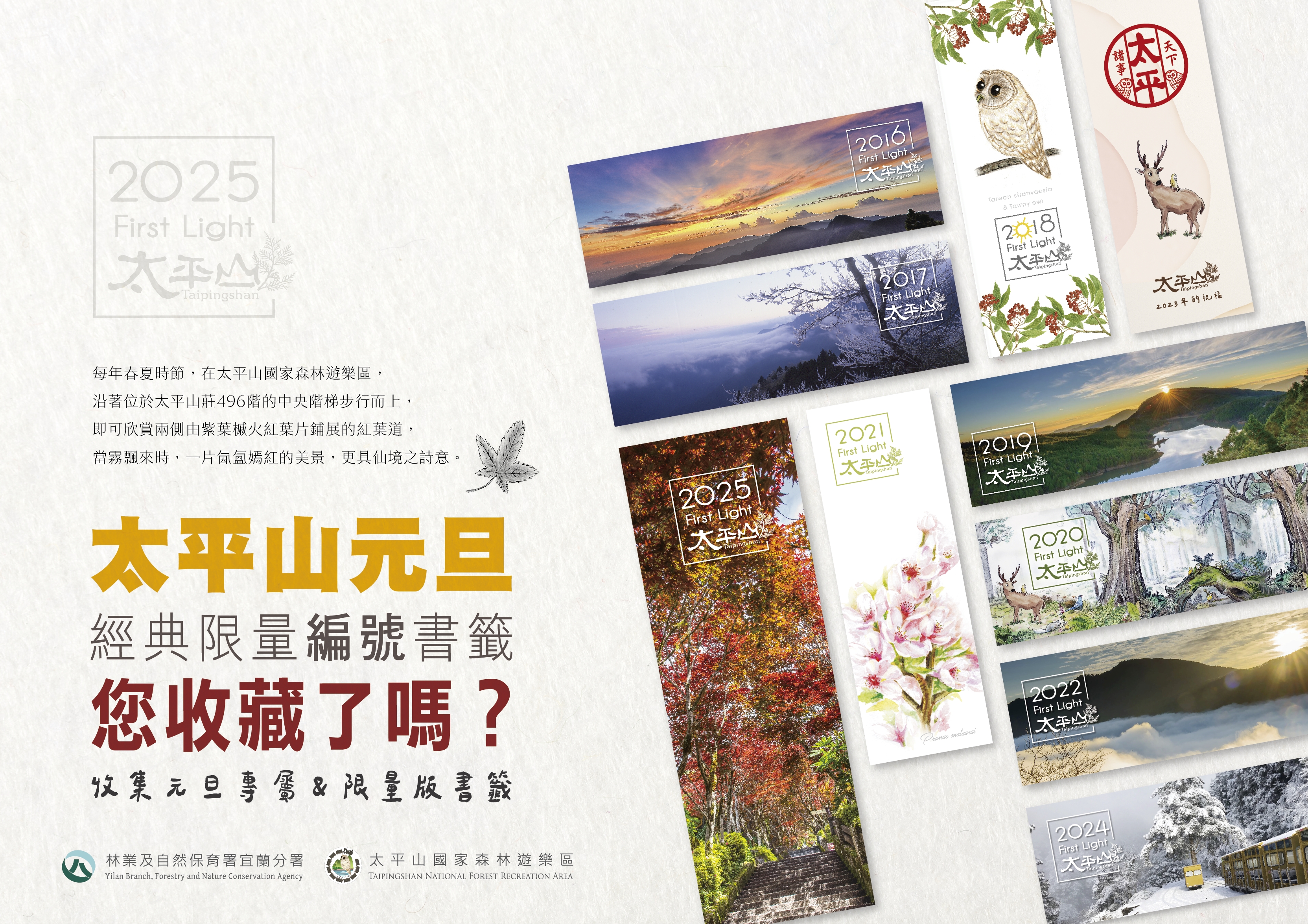 林業及自然保育署宜蘭分署所轄太平山國家森林遊樂區,海拔介於365-2,000公尺之間,是北台灣賞日出的絕佳地點之一;2025年元旦日出時間約於清晨6:30-6:50,為了讓民眾能迎接新年第一道曙光,當天園區提早於清晨3:00開園,入園遊客每人均可獲贈一張2025新年紀念編號書籤,第一位入園遊客除了可以拿到NO.0001的書籤外,更可獲得太平山文創商品福袋一份。 元旦當日若氣候良好,林業及自然保育署宜蘭分署推薦在太平山欣賞日出的景點有7處:(1)太平山莊觀景台、(2)蹦蹦車車站月台、(3)原太平山俱樂部廣場欣賞「三星山日出」、(4)翠峰景觀道路14k觀景台觀賞「雲海日出」、(5) 翠峰湖環山步道0.8K觀景平台欣賞湖景日出、(6)翠峰湖環山步道3K處觀賞「雲海日出」、(7)望洋山步道觀景台觀賞「龜山朝日」。 太平山熱門觀賞日出景點之一的翠峰湖區,林業及自然保育署宜蘭分署考量翠峰景觀道路路幅較小,為維持交通順暢,翠峰景觀道路元旦當日上午3:00-9:00間將實施「時段單向通行」交通管制措施,去程(太平山往翠峰湖)6:30後禁止車輛進入,返程(翠峰湖往太平山)於8:00前禁止通行,直至9:00後正常開放。請遊客配合執勤員警指揮及引導,以確保行車安全。另元旦當日太平山莊販賣部及雲海咖啡館也因應提早至7:00營業,看完日出也可前往選購太平山限定紀念品及喝杯咖啡,享受山林閒適氛圍。 詳情可查詢 太平山官方FB粉絲團 太平山國家森林遊樂區官網 台灣山林悠遊網 或電洽太平山服務專線(03-9809805)及售票站(03-9809619)詢問。