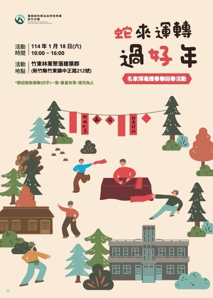林業保育署竹東林業聚落建築群第一期工程階段完成開放參觀後,已迎來上千人的參訪,將竹東鎮上的林業地景及耆老們的林業生活經驗,透過相關主題展覽將美好的在地記憶傳承下來。去(113)年底開展的「竹東林業故事特展」更受到各界熱烈迴響,見證竹東林業的過往風光。年節將至,新竹分署再次邀請去年大受好評的書法名家謝瑞煌大師團隊,於1月18日(星期六)上午10點現場揮毫,歡迎民眾一同參與贈春聯活動,迎接豐盛美好的金蛇年。