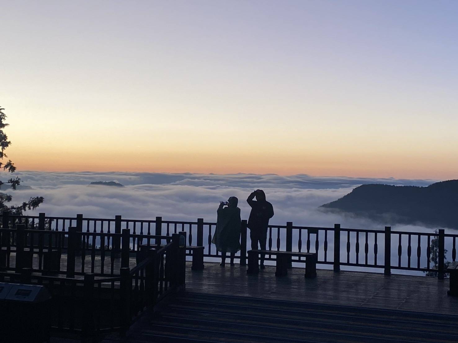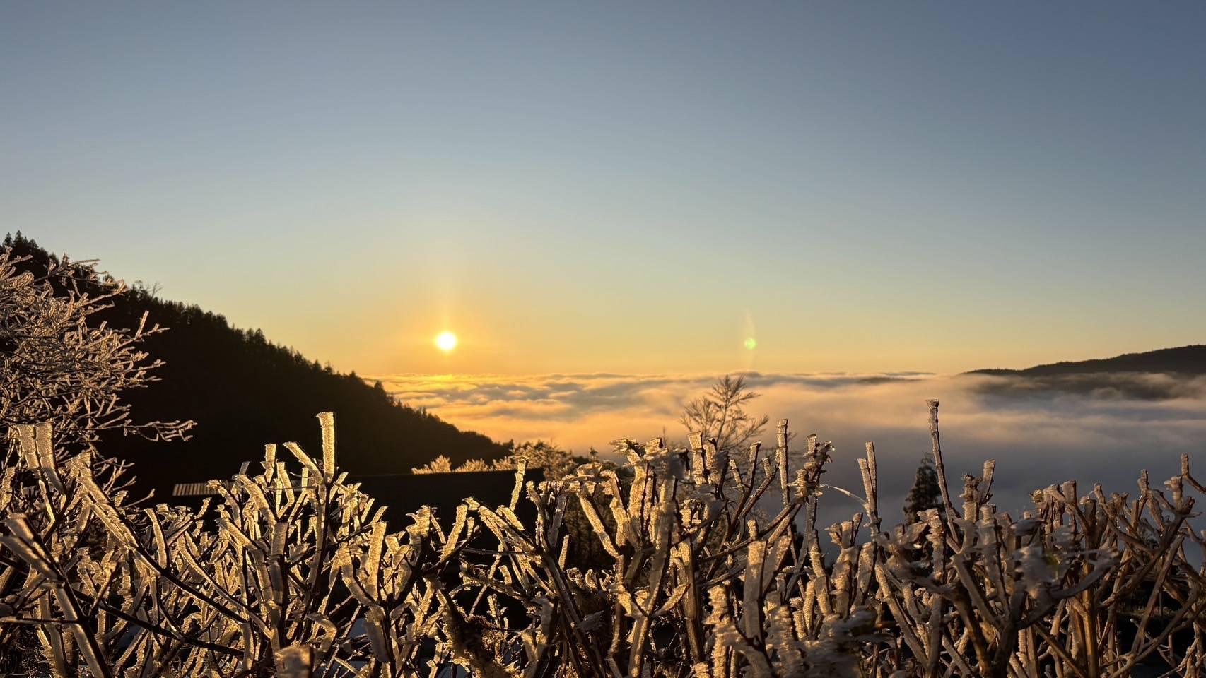 太平山今日(16日)清晨氣溫曾降到攝氏零下1度,隨後放晴,有日出及雲海,雖然不夠低溫,只有在局部木棧道有薄霜出現,以及少許樹木枝條上有霧淞,預估只會短暫在清晨時段出現,但是耀眼的日出,滿滿的雲海,加上輕霧淞的銀白山林風景,也是美不勝收。 清晨時分,日光從遠山間緩緩升起,金色光芒映照在滿滿的雲海上,山巒之間彌漫的薄霧為整片景色增添一層神秘氛圍,霧淞、雲海、日出相映成畫。 太平山高海拔區域樹枝上因低溫凝結出一層晶瑩的霧淞,形成絕美銀白世界。