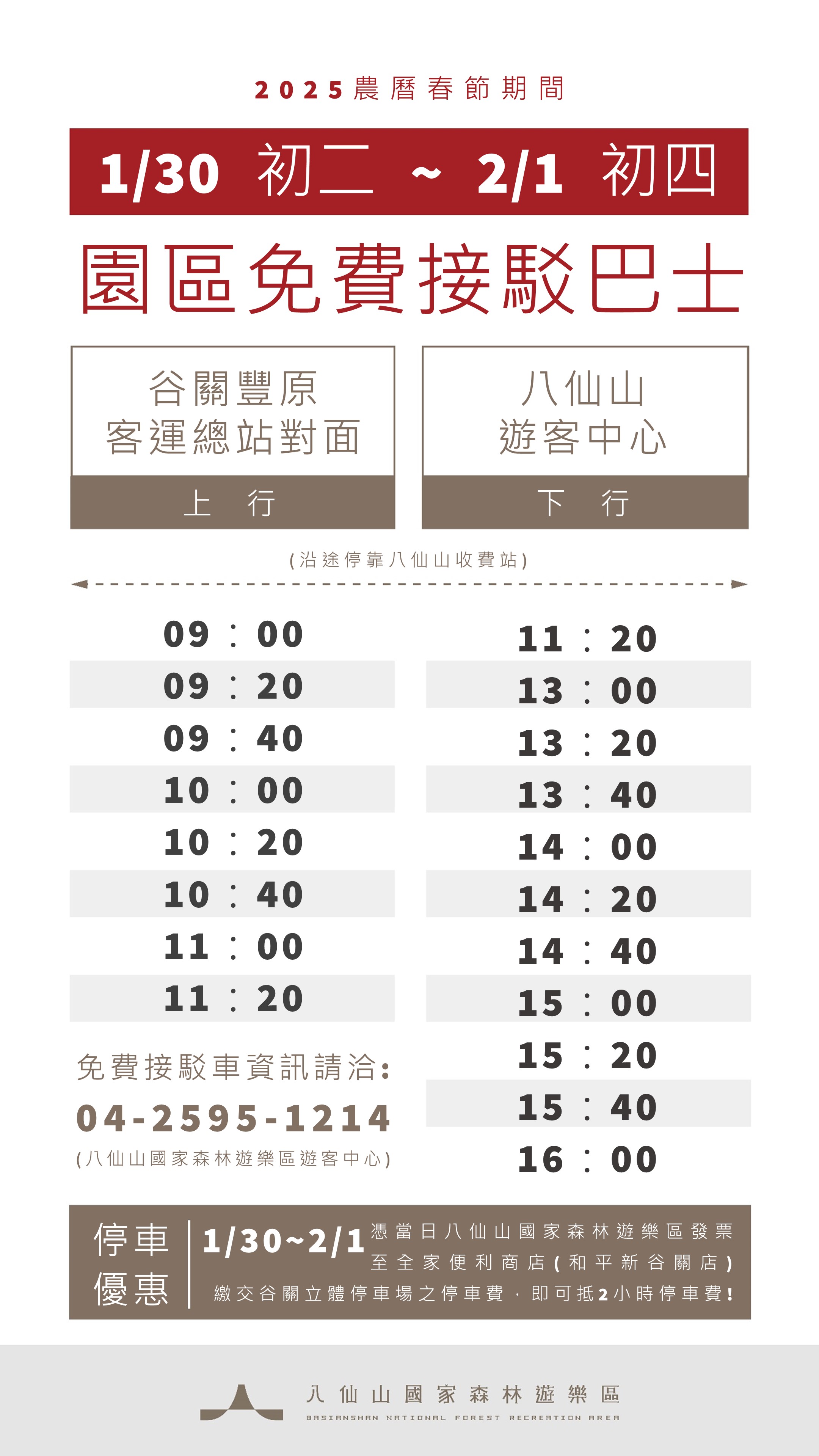 為了讓遊客可輕鬆走春,八仙山國家森林遊樂區初二至初四(1/30-2/1)提供免費接駁車,從豐原客運谷關總站對面到八仙山遊客中心,定時提供免費公車接駁服務。自行開車的朋友可將車停在谷關立體停車場,回程憑入園發票至谷關立體停車場旁全家便利商店繳費,即可折抵停車2小時。