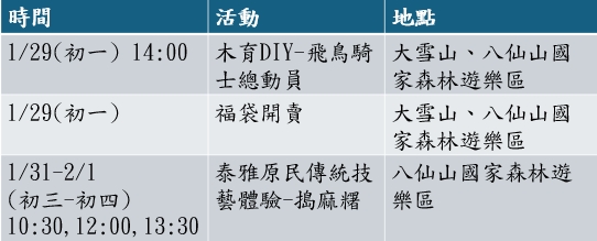 林業保育署臺中分署表示,大雪山及八仙山國家森林遊樂區有豐富的鳥類資源,遊客除了到園區賞鳥,初一(1/29)大雪山及八仙山皆推出「飛鳥騎士總動員」木育DIY活動(時間14:00,每人150元,至遊客中心櫃檯報名),歡迎民眾親手DIY一隻專屬自己的木製小鳥回家。此外,在八仙山綠色走廊初三、初四(10:30、12:00、13:30)加碼免費搗麻糬活動,不要錯過泰雅族團圓滋味!東勢林業文化園區1月25-26日搶先推出光之市冬日市集活動,修理工廠《山之譜》特展開展中,可利用春節假期感受林業文化的魅力。