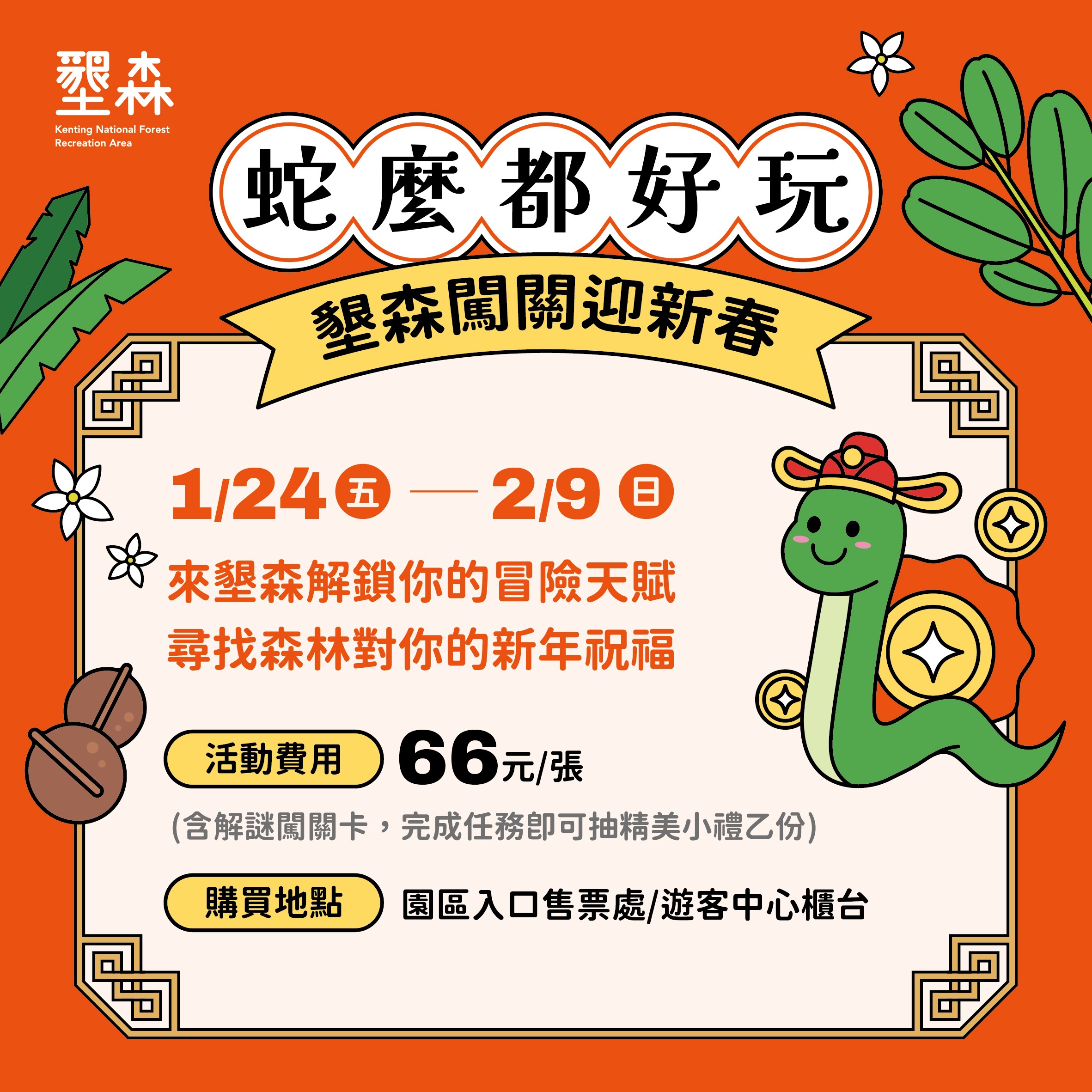 春節連假「蛇」來森林一點都不無聊,墾丁國家森林遊樂區推出新春專屬活動,結合自然景觀與趣味挑戰有「蛇來運轉-揮毫相贈」及「蛇麼都好玩 闖關迎新春」活動,讓您來墾森不只可以免費拿到大師揮毫春聯,另透過購買解謎闖關卡,一邊欣賞園區自然美景,一邊挑戰任務,漫步森林浴步道享受大自然芬多精,登觀海樓360°絕美海景盡收眼底,沉浸於大自然的無限魅力。
