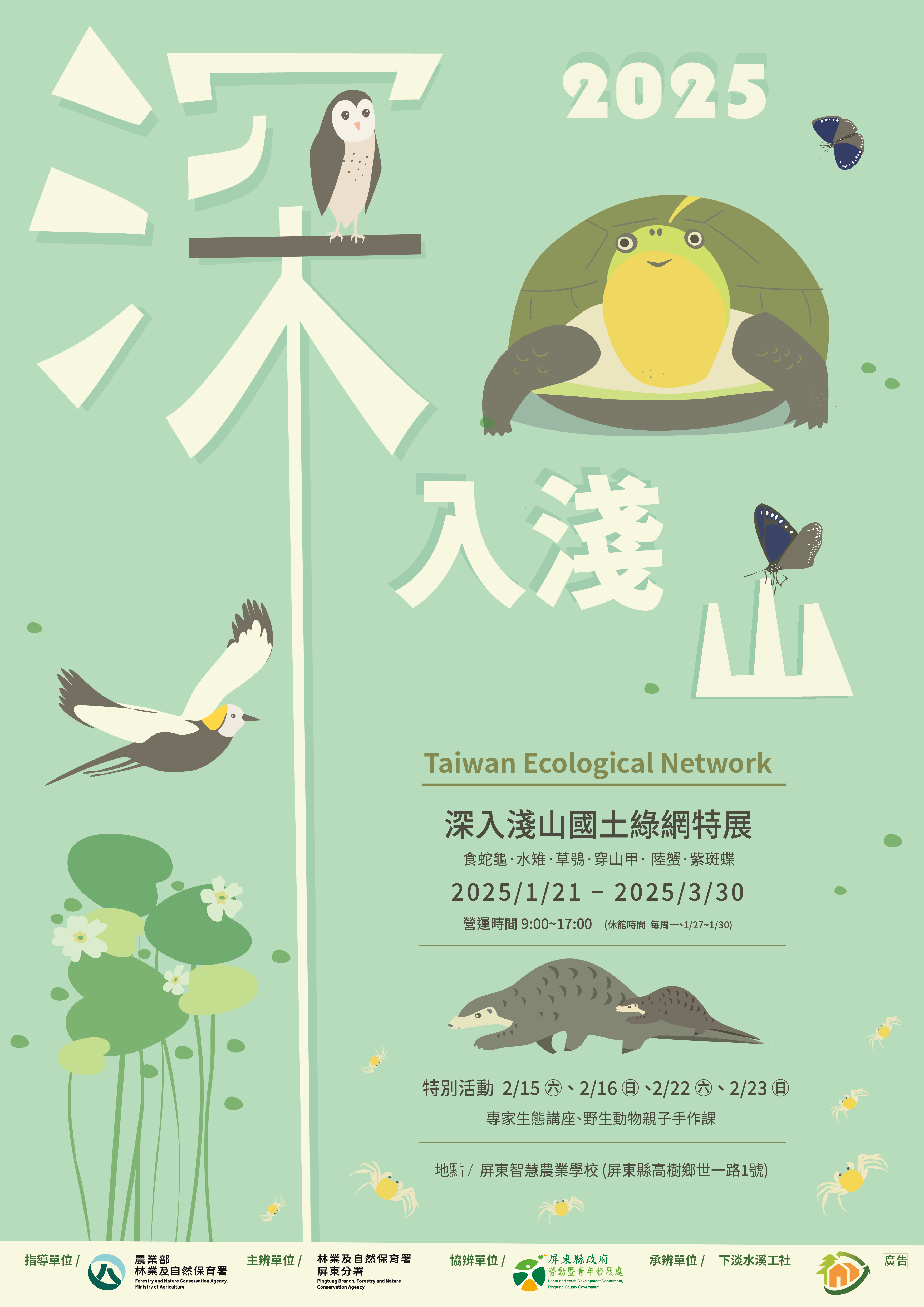 關懷地球環境生態保育的朋友們,不容錯過的還有以屏東及高雄生態保育核心為主題的展覽-深入淺山國土綠網特展,於「屏東智慧農業學校」辦理活動,可以看到關注區域及物種的介紹及影片特輯,歡迎一同來感受獨特生命與生存的力量,展期至3月30日止(1月27-30日休館)。