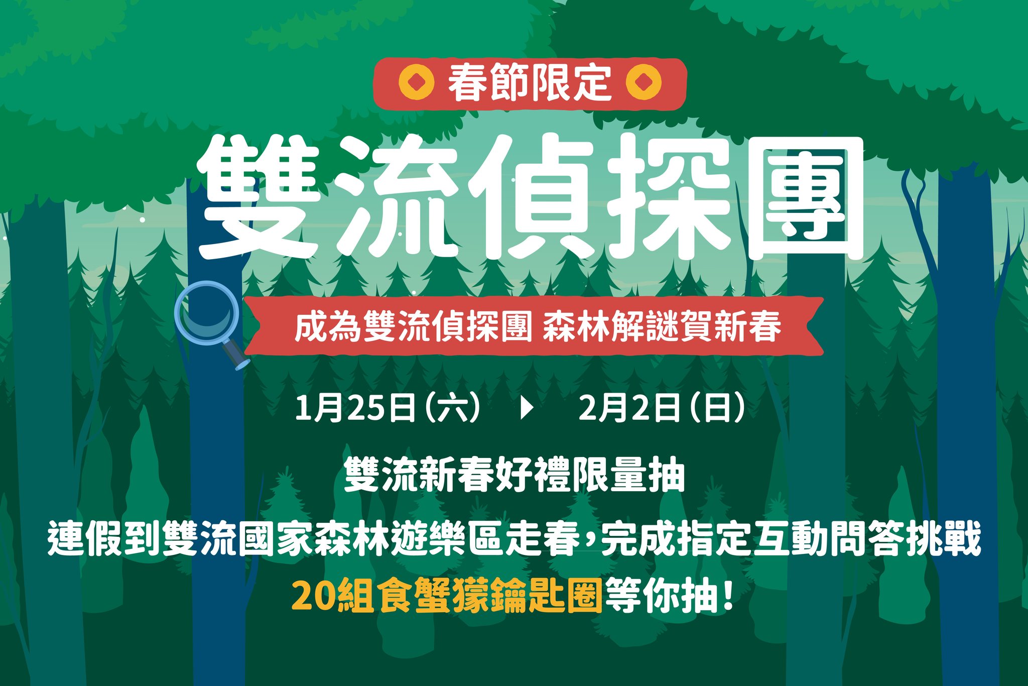 雙流國家森林遊樂區鼓勵民眾春節期間進入園區,也適逢雙流30周年特別設置「春節限定版-雙流偵探團」問答挑戰活動,加入雙流偵探團走入園區探索森林與溪流的奧秘,挑戰雙流趣味小知識問答,不僅能深入了解自然之美,更有機會參加抽獎,活動期間將抽出20組春節限定好禮,讓冒險之旅更添驚喜。今年連假,來雙流森林,展開一場充滿知識與樂趣的森林冒險吧!